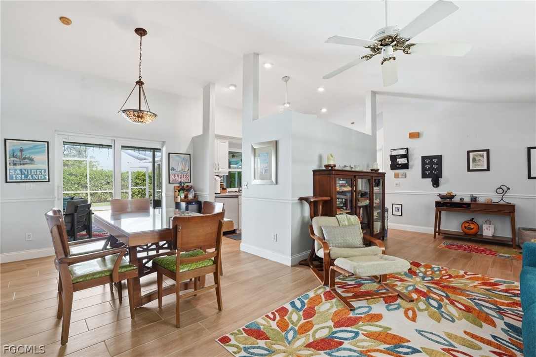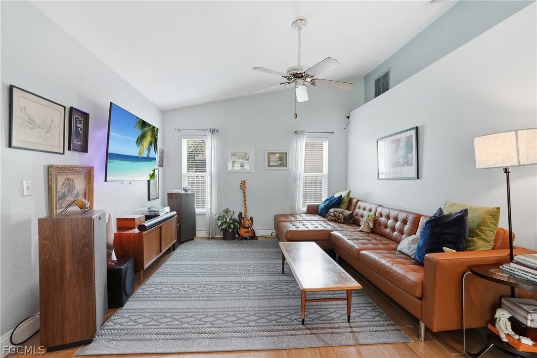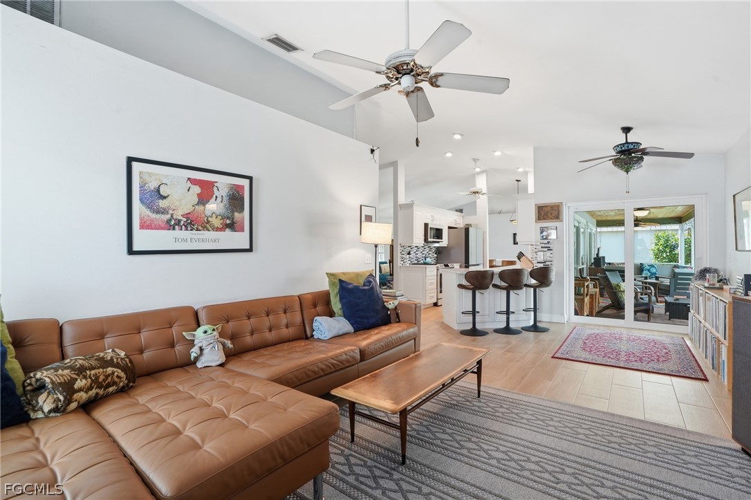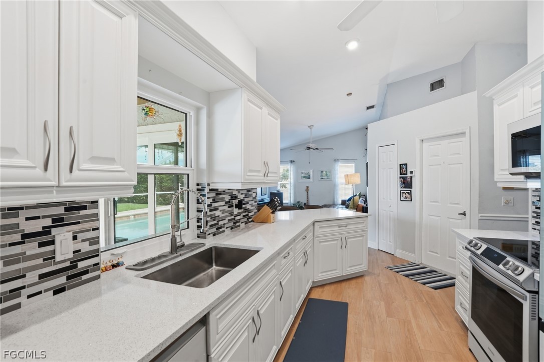 This 3 bedroom pool home is located in a quiet, established neighborhood in one of Cape Coral’s most convenient locations near schools and just minutes from either bridge, shopping, and dining. This home feels like the perfect mixture between updated, and character that you can make your own. With a vaulted ceilings and a spacious split floor plan containing multiple living areas, this home is perfect for your growing family. The open kitchen features quartz countertops, upgraded appliances, soft-close cabinets, and a pass-through window with a view of the serene pool area. Three sliding glass doors lead out to the screened pool area, creating great indoor-outdoor living. The primary suite includes a walk-in closet, a glass slider to the pool, and a beautifully updated bathroom with glass door shower, tile finishes, and dual sinks. A convenient pool bath with a whirlpool jetted tub provides direct access to the outdoor area.The private backyard is fully fenced and lined with mature clusia plants for added privacy. The extended paver driveway (2024) provides additional parking and curb appeal. Major updates include:Roof (2023) A/C (2019) Re-plumbed with CPVC (2016) New water heater (2024), Impact windows and doors throughout, New pool light and pool equipment. This is a fantastic opportunity to own a pool home with major updates already completed in a highly desirable Cape Coral location.