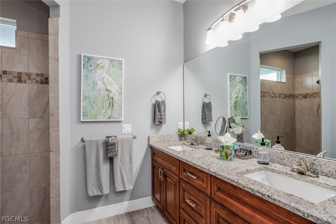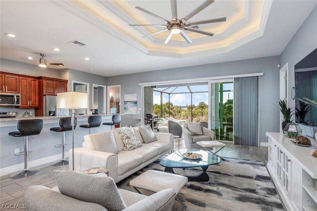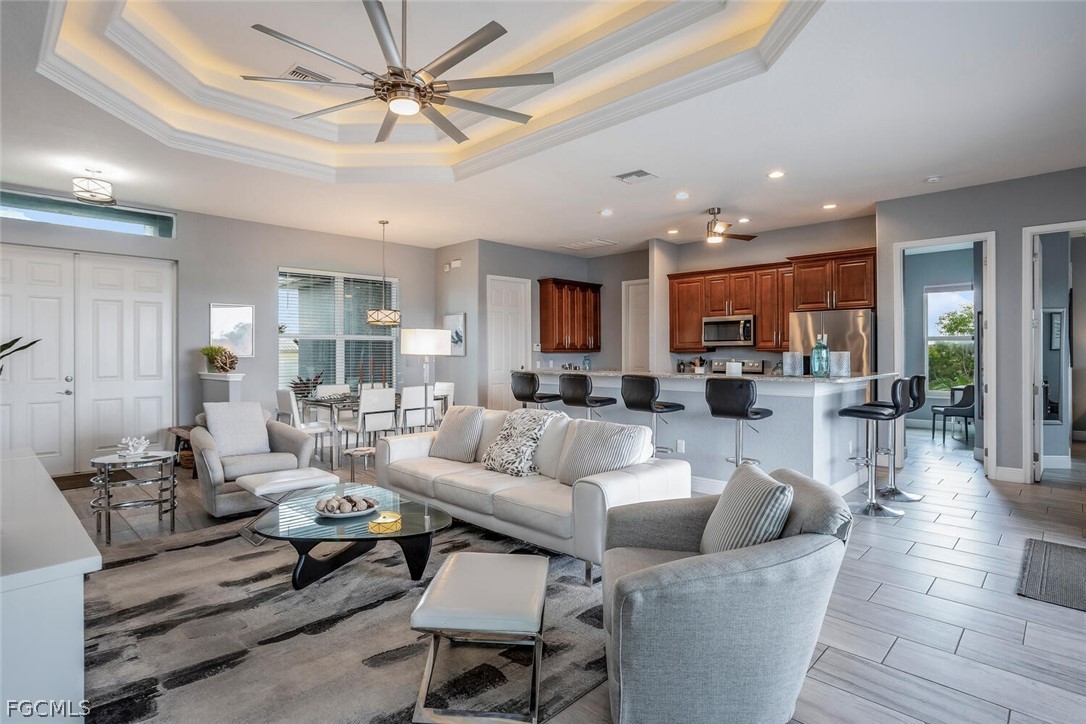 Inside you’ll find a bright open great room floor plan featuring tile flooring throughout, coffered ceilings with lighting, and a beautifully designed kitchen with wood cabinetry, granite countertops, breakfast bar, butler’s pantry, and stainless steel appliances. The home is offered turnkey furnished (excluding personal items).