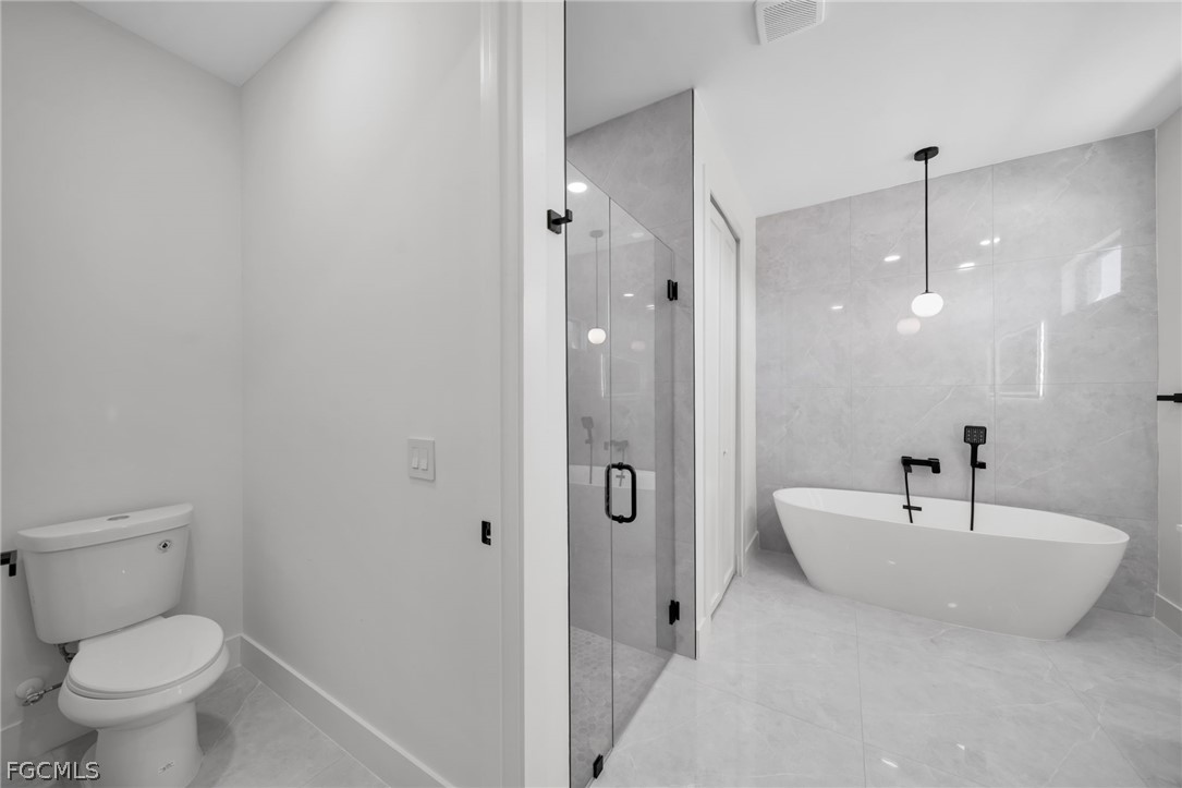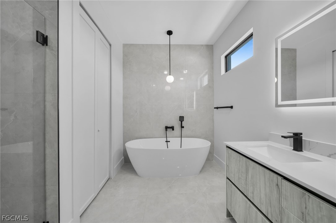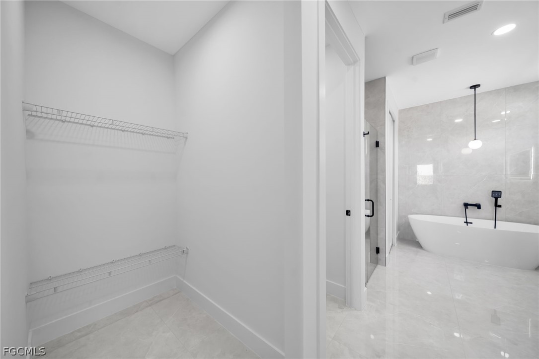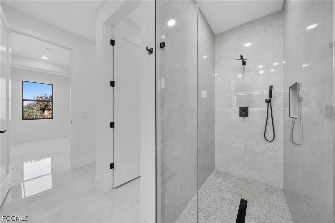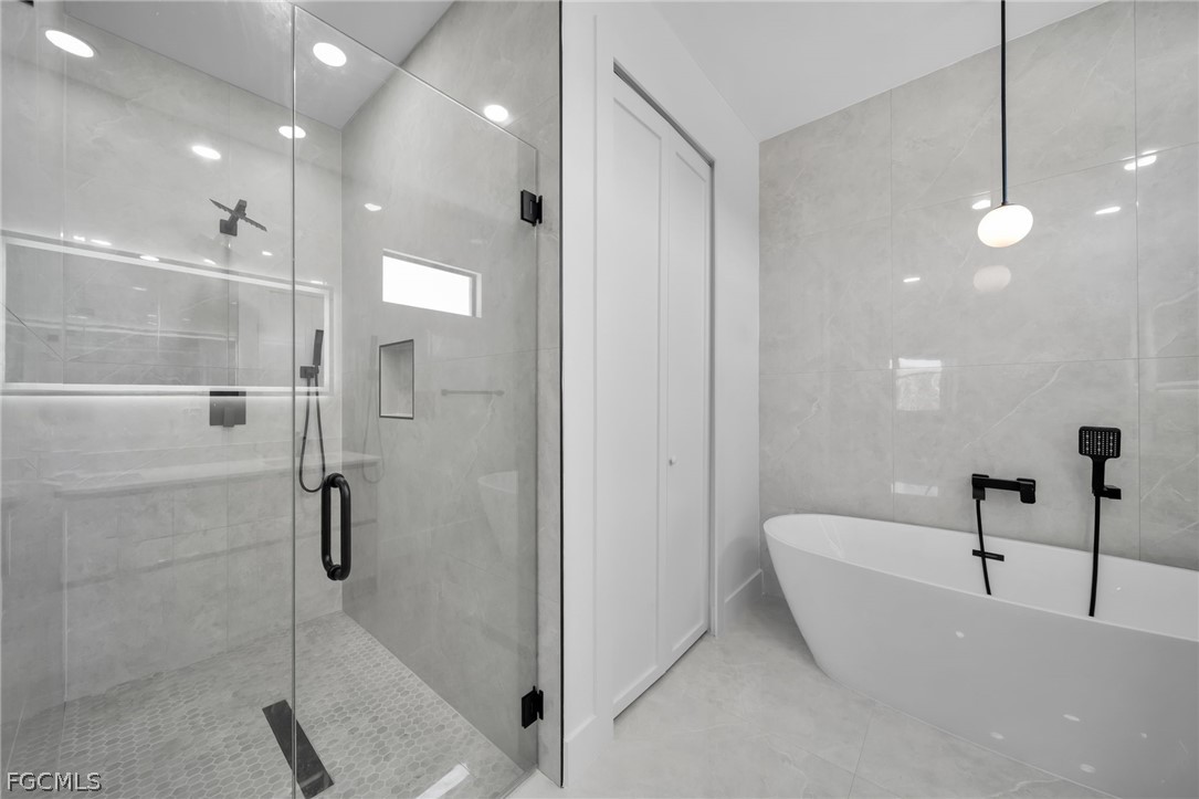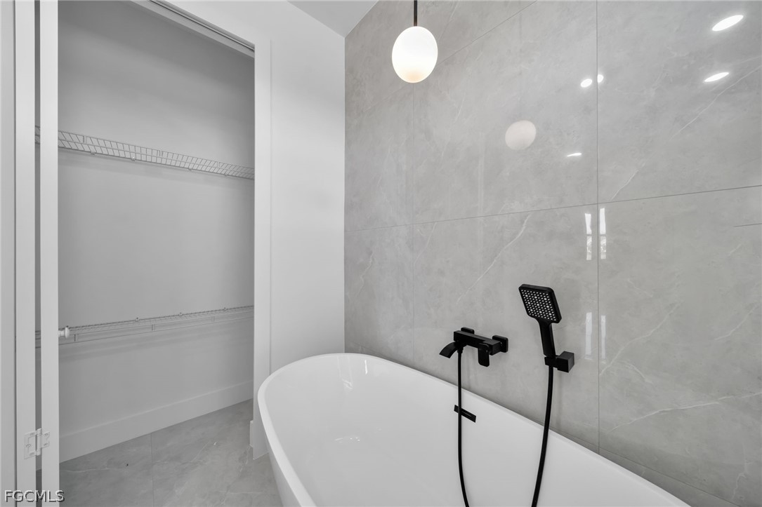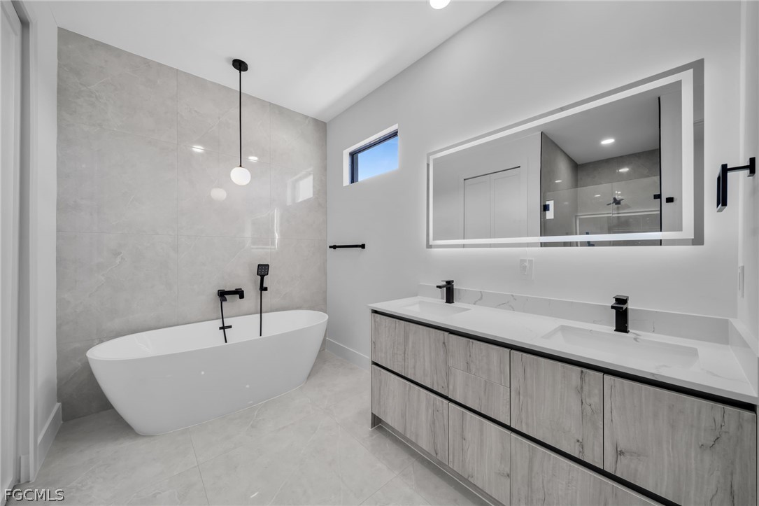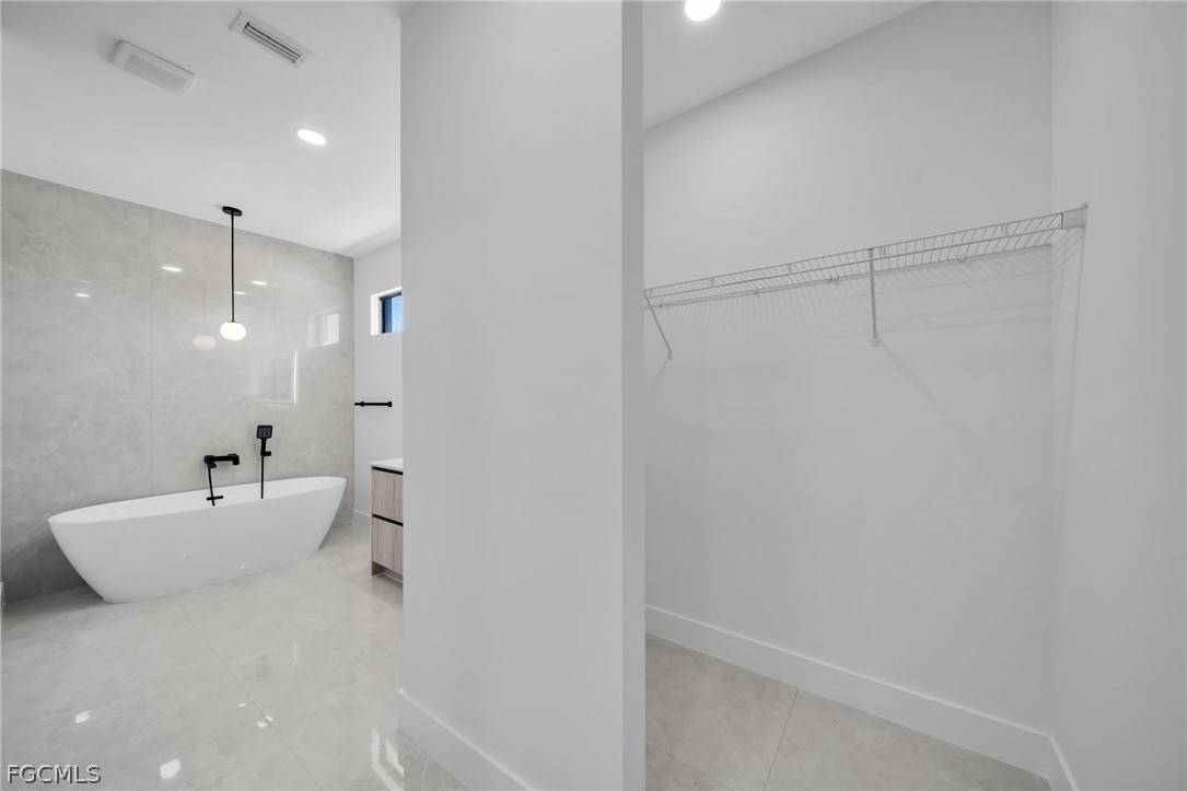 The spacious layout includes three full bathrooms, providing comfort and flexibility for family living or guests. The primary suite offers a spa-inspired bathroom featuring a freestanding soaking tub and porcelain rainfall accent wall, creating a relaxing retreat.
