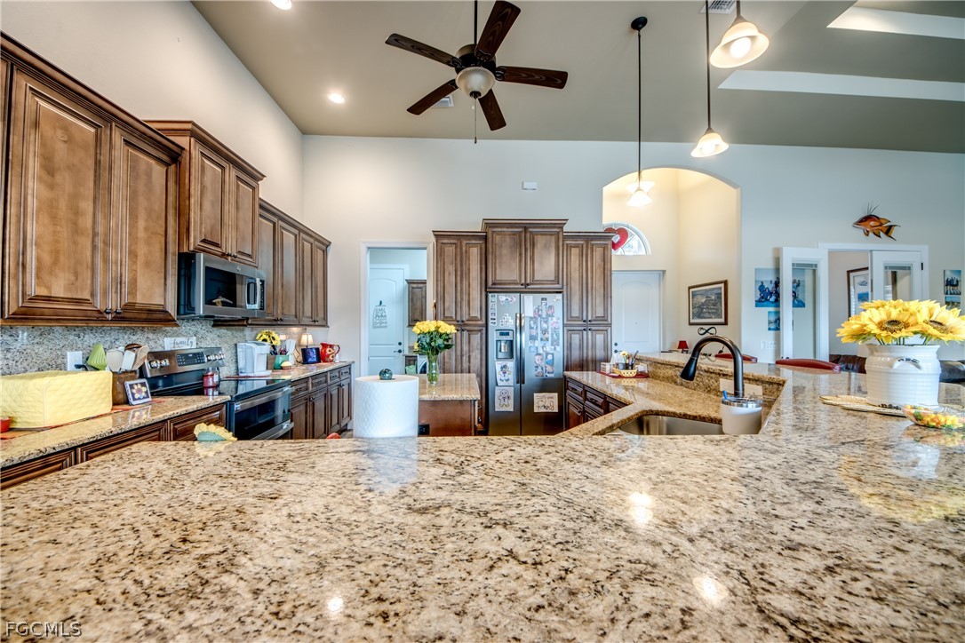 This Southern Exposure 3 Bedroom+Den, 3 Bath, 3 Car Garage home comes with all the Bells and Whistles. Home is 2,349 sq ft under air with a total of 5,062 sq ft when you include your 2.063 sq ft lanai with an oversized pool and Full Length Lanai! This owner didn't cheap out like the others and provides an actual Screen Enclosure with Concrete Footings - Over a $35K value! The Kitchen has been decked out with 42" All Wood Cabinets, Stainless Steel Appliances, Granite Countertops, and Kitchen Island. Designer tile flooring installed throughout the home with Carpet in the bedrooms. This home has Impact Windows and 90 Degrees Impact Sliders, a Slider out the master bedroom, Huge Paver driveway, Paver pool deck, complete landscape package with sprinkler system, flora tan sod and concrete Curbing. The interior specs are High Ceilings in living area, 8' doors, 5 1/4" Baseboard with 3 1/4" Casings, Soffit lighting outside, Walk in Shower in the Master Bath, Custom features, Trey Ceilings in the living room, Dining room and master bedroom, pendant lighting in the kitchen, pool bath and so much more. This home is located in an area where city water and sewer area already installed and assessments are in and paid.