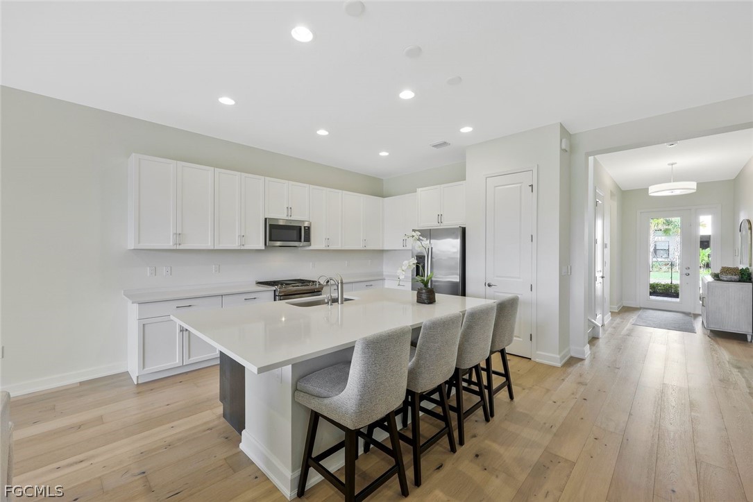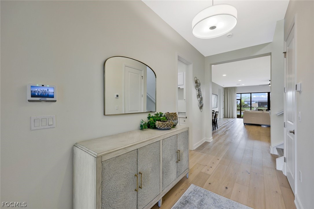 Better than new lakefront home in RiverCreek, Estero – built 2024! 3,004 SF | 3 Bedrooms + Den | 4 Bathrooms | Premium lakefront lot Biscayne model by GL homes. Bright, open-concept floor plan with engineered hardwood flooring throughout main areas and bedrooms. Upgraded tile in bathrooms, duration satin interior paint. Gourmet kitchen with quartz countertops and gas range. Granite countertops in laundry and outdoor entertainment area. Custom outdoor space with built-in gas grill overlooking the lake – perfect for entertaining. Additional upgrades: whole-house water softener, reverse osmosis drinking water in the kitchen, upgraded lighting, whole-home Wi-Fi, and high efficiency split A/C systems for first and second floors with wi-fi thermostats. RiverCreek is a premier gated community offering resort-style amenities: clubhouse, pool, fitness center, tennis & pickleball courts, and social spaces. Prime location near shopping, dining, entertainment and the newly expanded RSW airport.