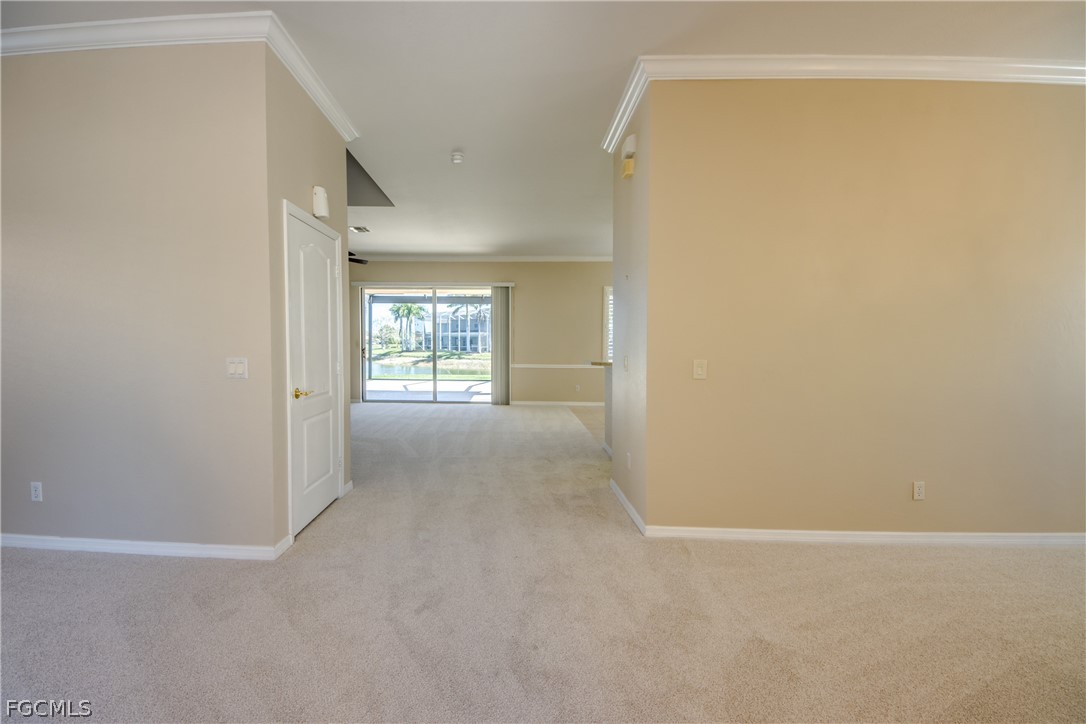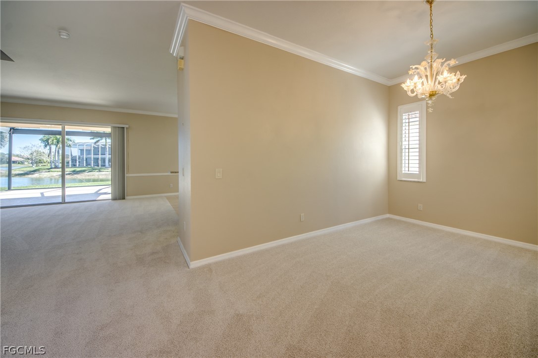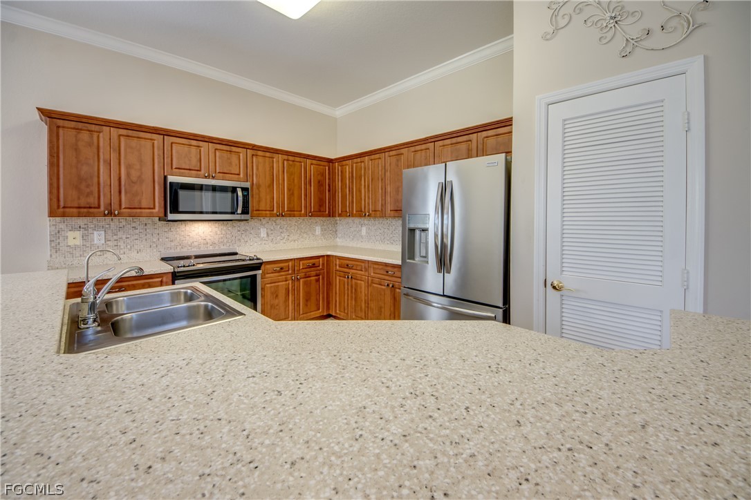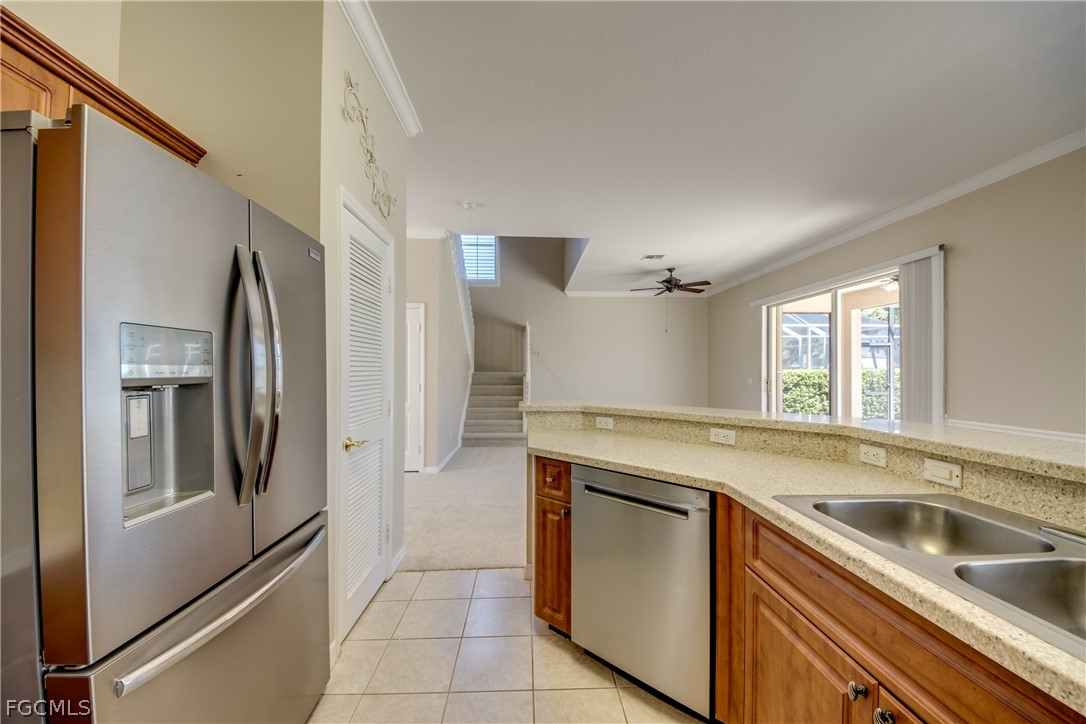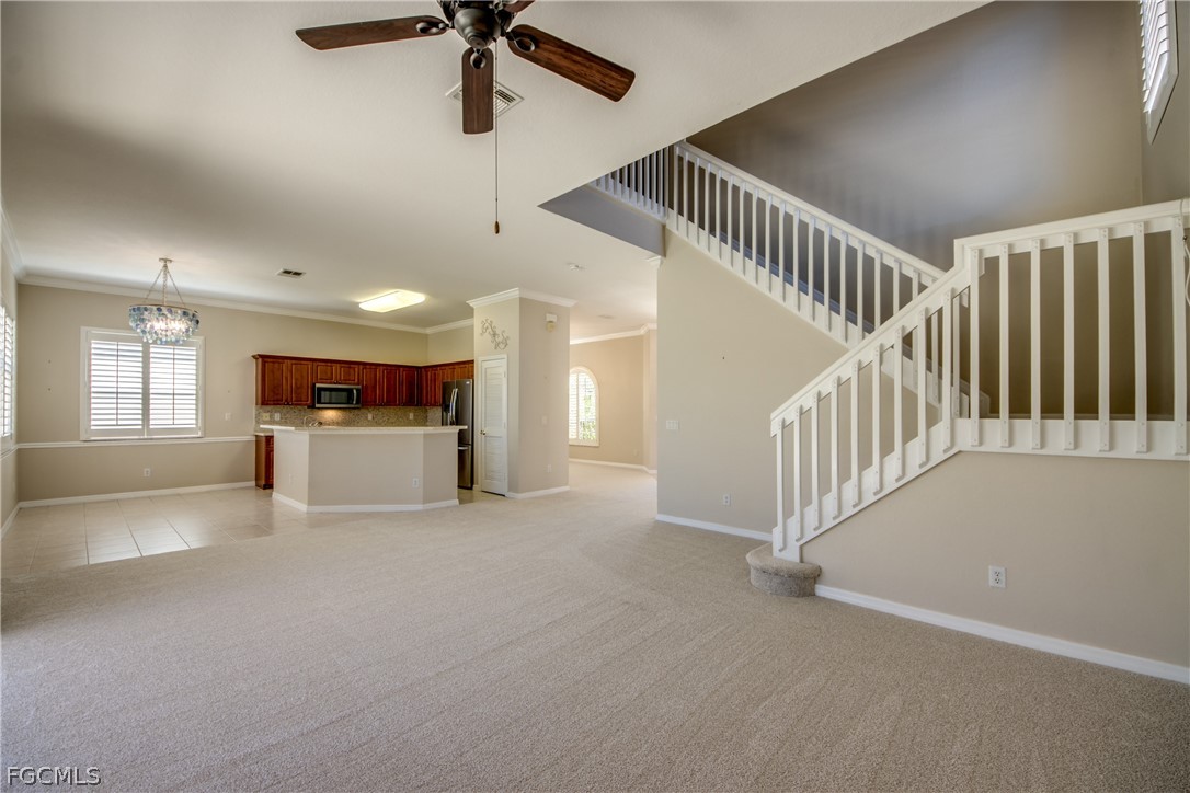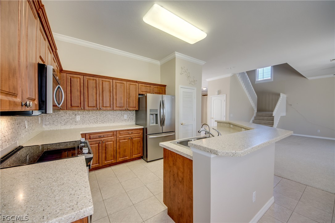 Inside, you will find brand new wall to wall carpeting throughout along with vaulted and volume ceilings that create a bright, open feel the moment you walk in. The spacious kitchen is ideal for gatherings and features a wrap around breakfast bar, solid surface countertops, tile backsplash, and plenty of cabinet and counter space.
