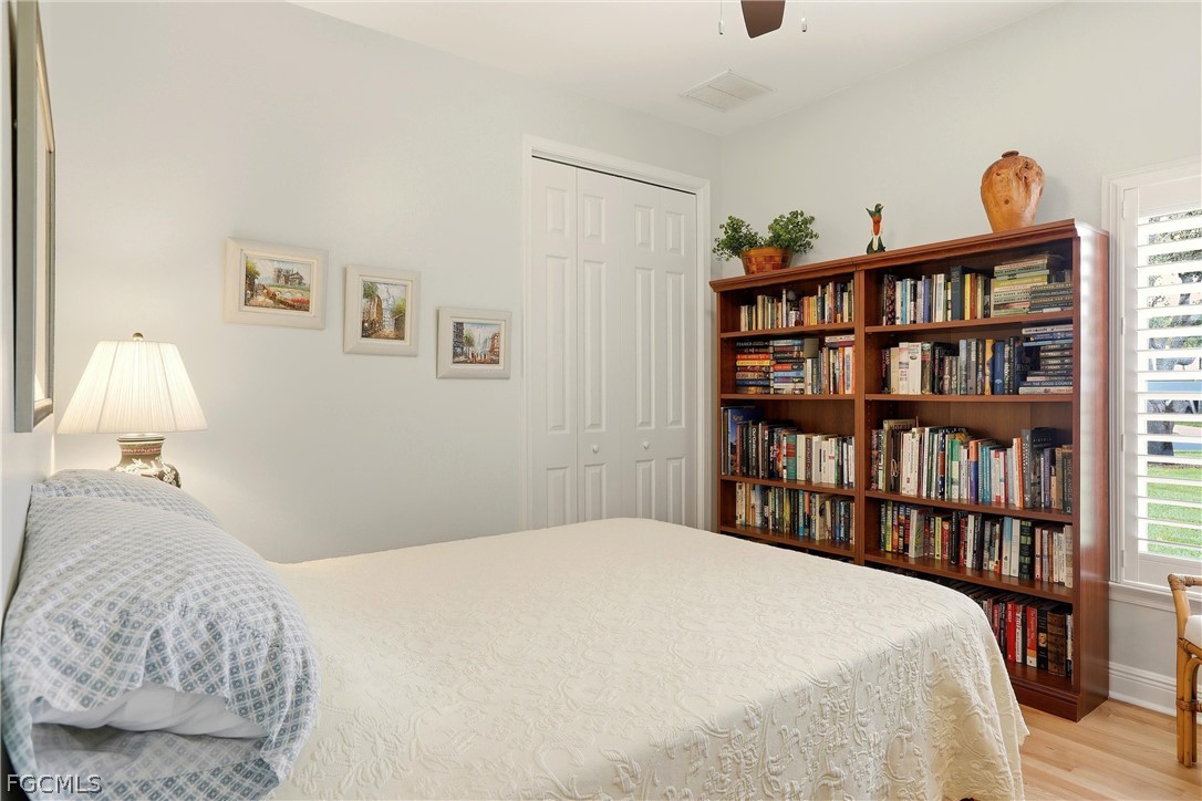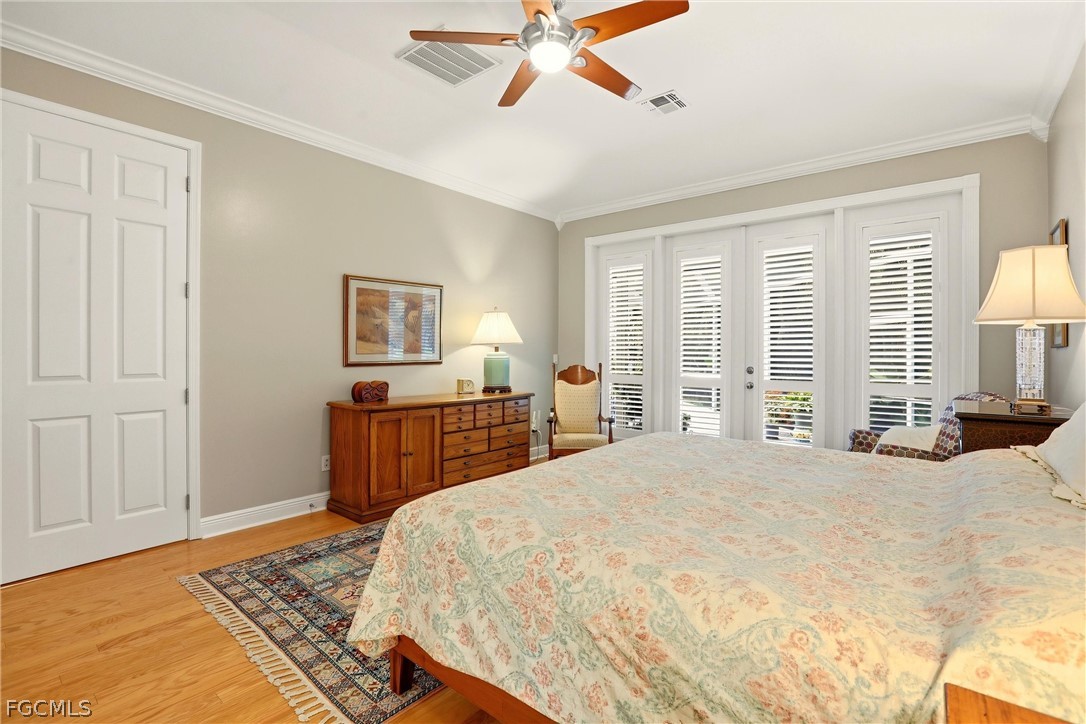The primary suite offers a peaceful setting with nine-foot ceiling height, plantation shutters, and views toward the pool and lanai.