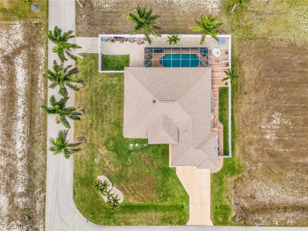 Outdoor enthusiasts will love the 32-foot RV and boat parking with a double gate (2023), additional boat trailer storage, and the fully fenced oversized yard with a 6-foot vinyl privacy fence and three access gates (2023). The western rear exposure delivers stunning sunsets across the impressive 50-foot lanai and oversized 13,000-gallon saltwater pool, creating the perfect setting for entertaining. A shaded patio area and custom fire pit further enhance the outdoor living experience. The beautifully maintained grounds feature more than 3,000 sq. ft. of lush lawn, six towering 40-foot palm trees—among the largest in the region—and professional landscaping with newly added front trees and plantings.