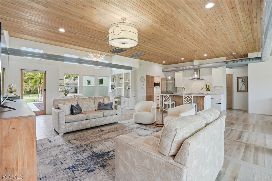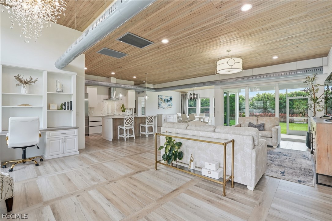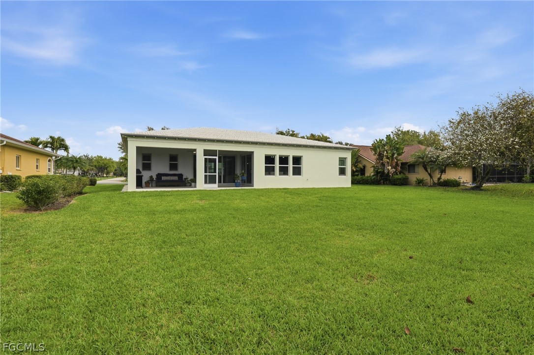 GREAT LOCATION & NO FLOOD INSURANCE REQUIRED! Step into a newer home where modern industrial design meets relaxed Florida living. Exposed ductwork, a warm linear wood plank ceiling, and clean architectural lines create a space that feels both stylish and inviting, while the open, light-filled layout offers the perfect setting for everyday comfort and effortless entertaining. Impact-resistant windows and doors provide added storm protection, energy efficiency, and peace of mind. Beautifully maintained and located in the desirable Eagle Ridge community, this home features a bright great room that flows seamlessly into the formal dining area and well-appointed kitchen. The large eat-in kitchen is equipped with high-end appliances, abundant cabinetry, an island and generous counter space. The lanai is an ideal place to enjoy morning coffee while taking in the peaceful backyard views. Custom window coverings throughout the home add a refined finishing touch. The private primary suite offers a relaxing retreat with a walk-in closet and en-suite bath, while the split-bedroom floor plan provides comfort and privacy for family and guests. Sliding glass doors open to a screened lanai and spacious backyard, perfect for outdoor dining, entertaining, or designing your own custom pool oasis. Additional highlights include a three-car garage and the home being wired for a generator, offering added convenience and peace of mind. With low HOA fees and a prime location just minutes from golf, shopping, dining, RSW Airport, Spring Training baseball venues, and the beautiful Gulf beaches, this Eagle Ridge home offers the perfect blend of style, comfort, and convenience.