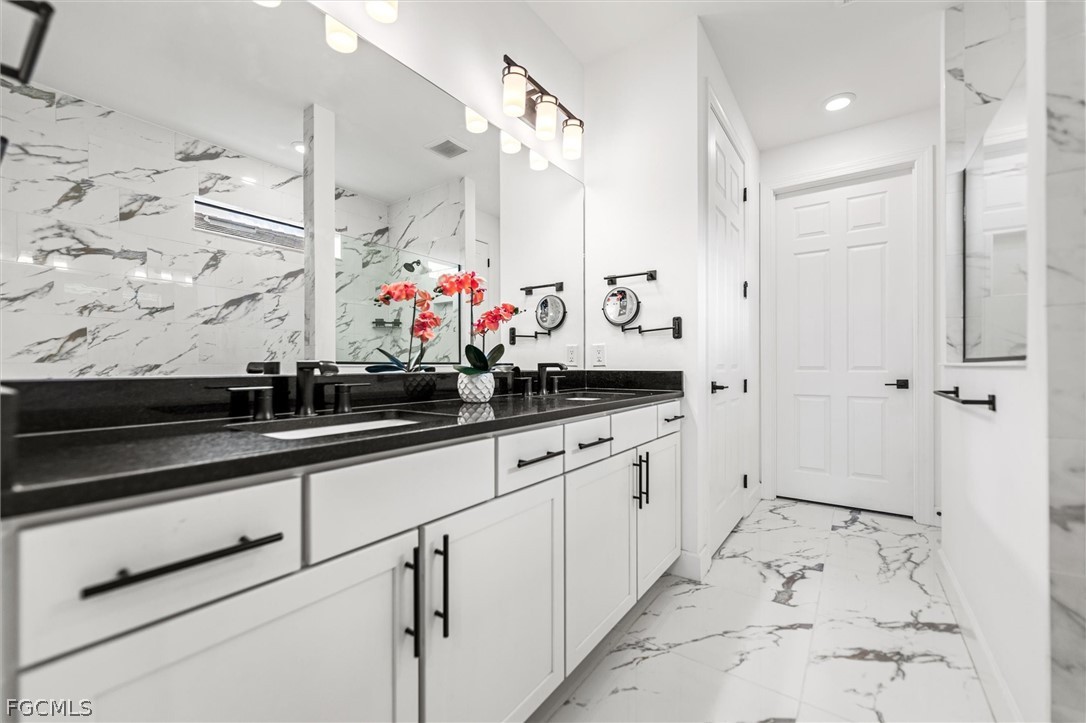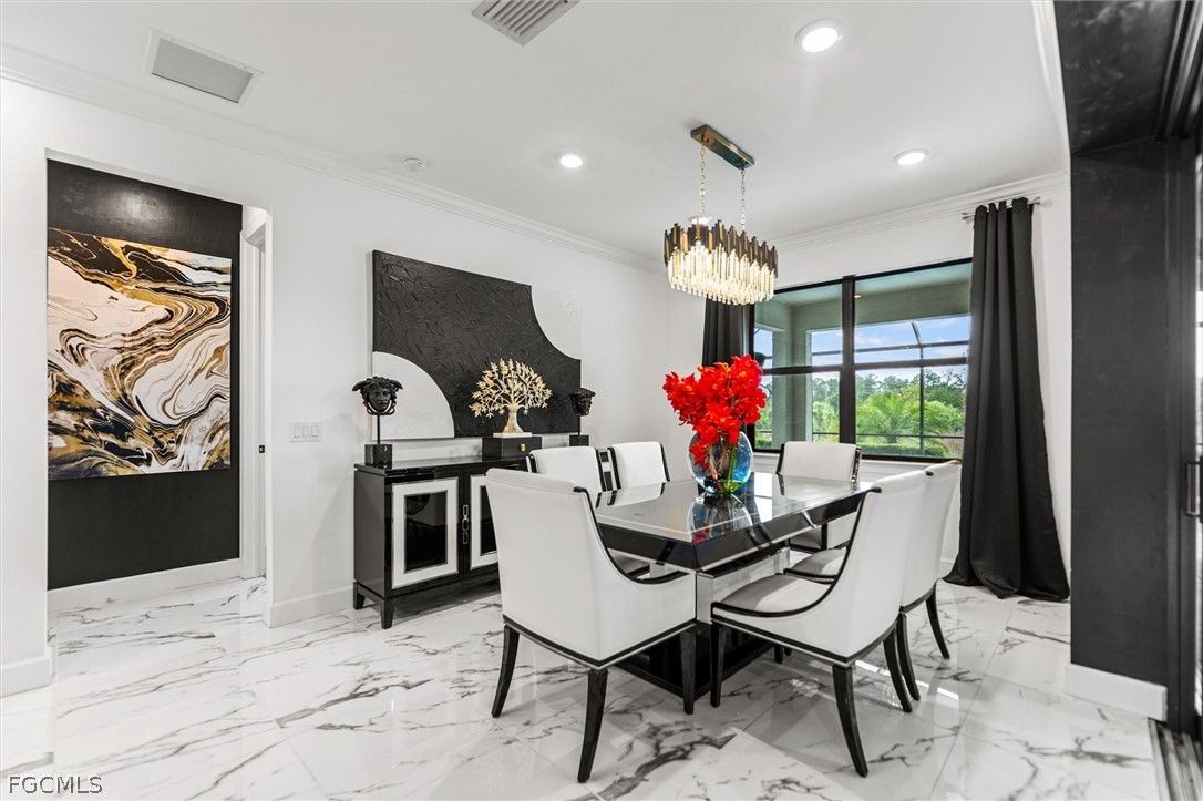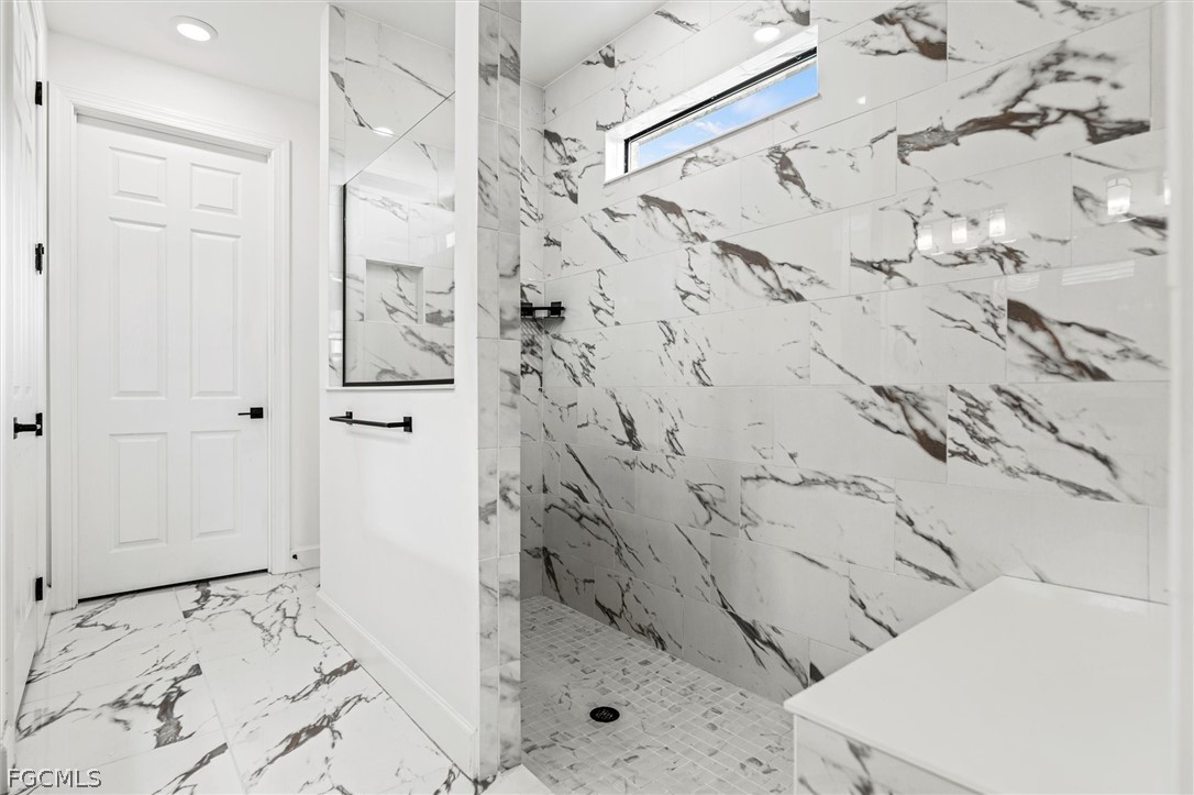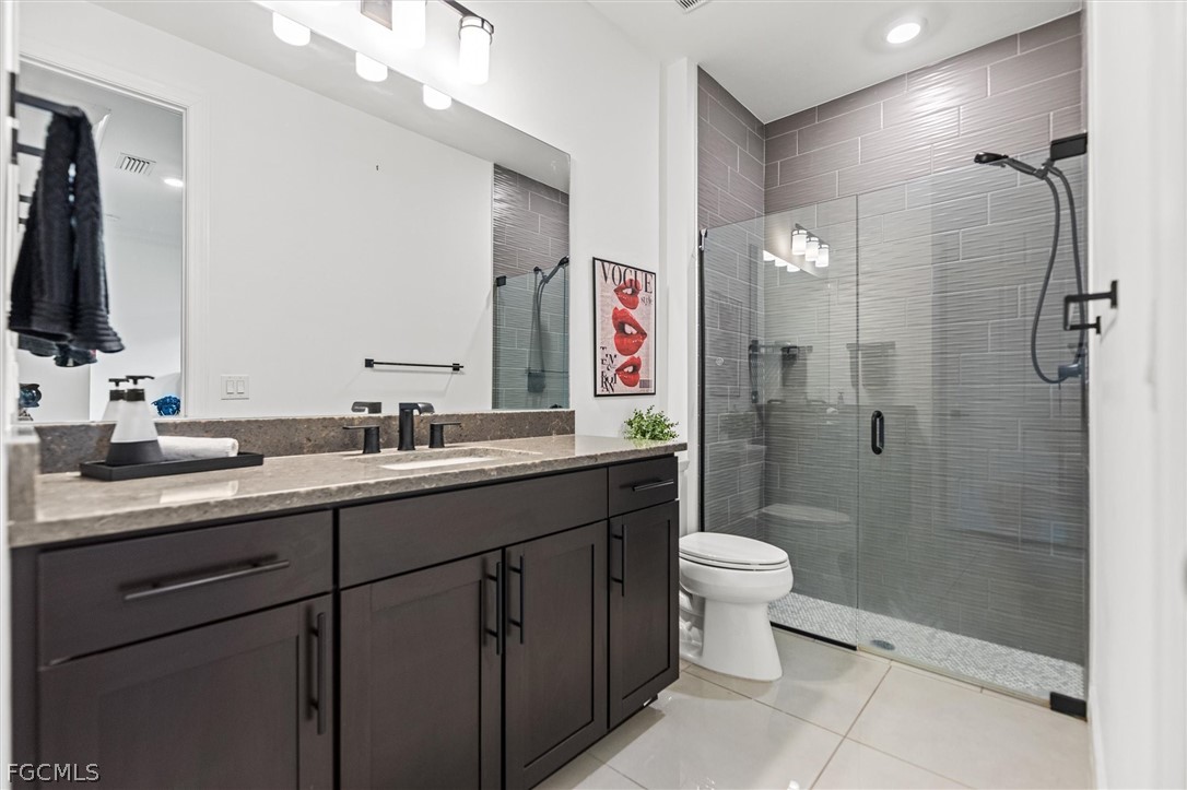 The family room features stunning zero-corner sliding doors that fully open to an extended lanai and heated pool, creating a seamless indoor–outdoor living experience. A custom tile entrance flows continuously through the main living areas, including the family room and kitchen. All bathrooms feature upgraded tile, with floor-to-ceiling tile in the showers for a luxurious finish.