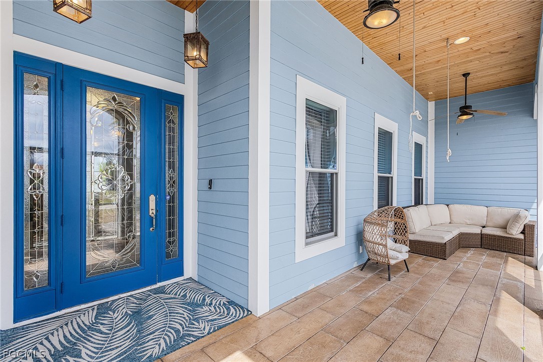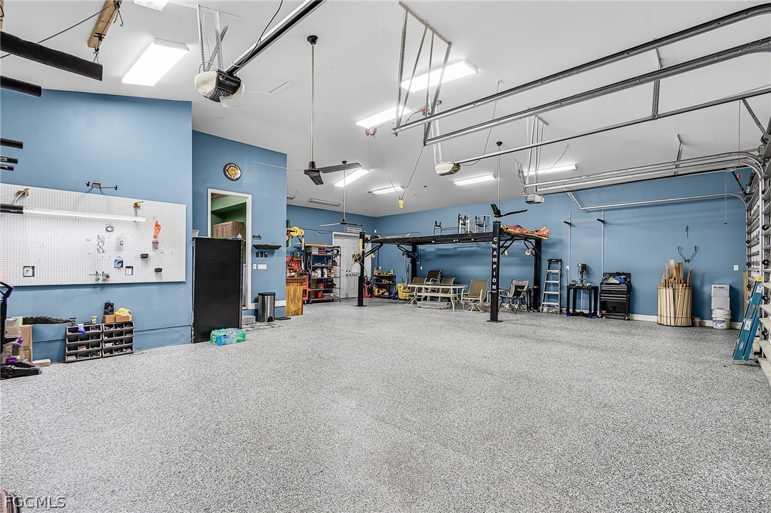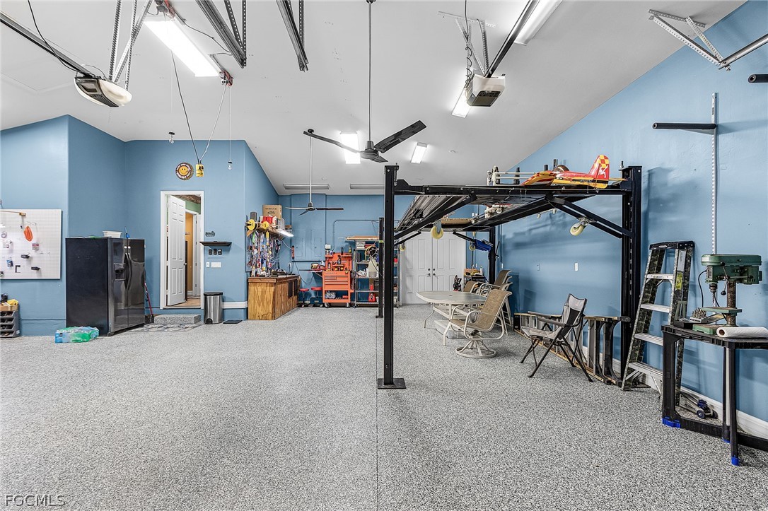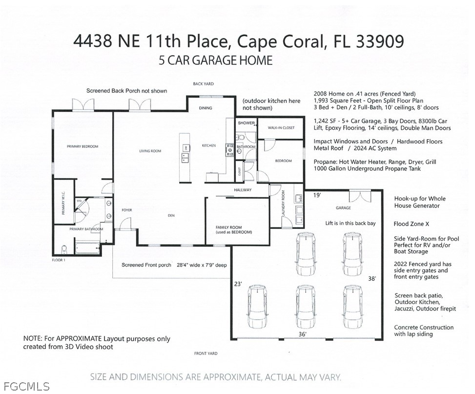 This BEAUTIFUL custom built 2008 home is on an OVERSIZE .41-acre corner lot located in quiet neighborhood in Northeast Cape Coral is a MUST SEE! If you are a mechanic or car enthusiast look NO More!! This home features a massive 1,242 sq ft, 5 PLUS car garage, with 3 bay garage doors, comes with a 8,300 lb car lift, epoxy floor, 14’ high ceilings, shop lighting, wired for whole house generator, garage refrigerator, with double exit doors to a fenced back yard. You will enjoy the SPACIOUS open SPLIT floor plan, beautiful wood floors, 8’ interior doors, tray ceilings, crown molding throughout, with impact windows and doors. The home is 1,993 sf, has 2 Bedrooms, 2 baths plus Den that is furnished and used as a bedroom. You will enjoy the BEAUTIFUL kitchen, new stainless-steel appliances, propane stove/cooktop, granite countertops, breakfast bar, and beautiful solid wood cabinets. The home has a breakfast nook off the kitchen and an open dining area off the living room, a large built-in entertainment area with display nooks, and French doors to the back lanai. The primary suite has access to the screened back lanai, 1 walk-in closet with California closet system, dual vanities, a large walk-in shower, soaking tub, linen closet, and a semi-private toilet room. The guest bath has a walk-in shower, granite countertop and a large storage closet located just outside of the bathroom door. The laundry room has cabinets with sink, gas dryer, and dryer. The home comes with an underground 1,000-gallon propane tank for the kitchen range, outdoor kitchen bar-b-que with sink, tankless hot water heater, and propane dryer. This home has a new 2024 AC system, metal roof, poured concrete walls with lap exterior siding, water treatment system, outside storage room, 6’ white vinyl privacy fence, large back yard with 2 large RV gates with plenty of room for a boat and/or RV parking, and a fire pit. The front screened porch is approximately 28’ long. The home comes furnished with living room furniture, bedroom furniture, kitchen items, and breakfast nook table. (The fish décor, wood carvings, antique diving helmet, safes are excluded.) The home comes with 3 yr old above ground jacuzzi just outside primary suite in the screened patio. Flood Zone X so no flood insurance required. Call today to book your private showing!!! See both video tours: walk-thru and 3D Interactive video!