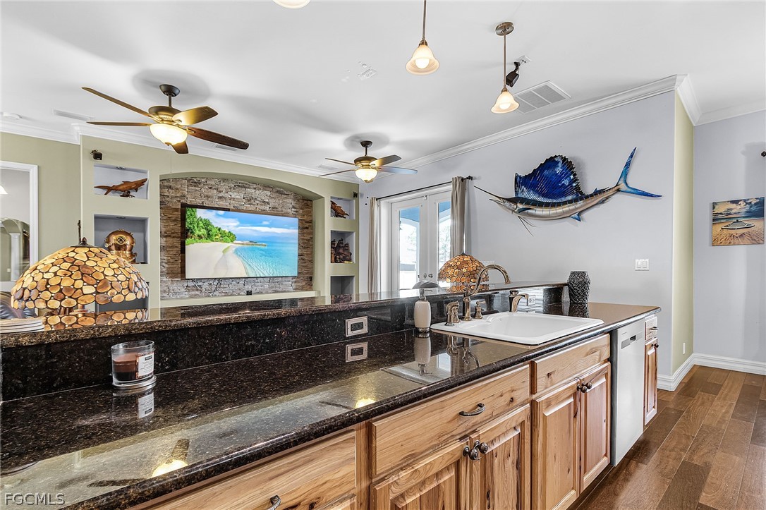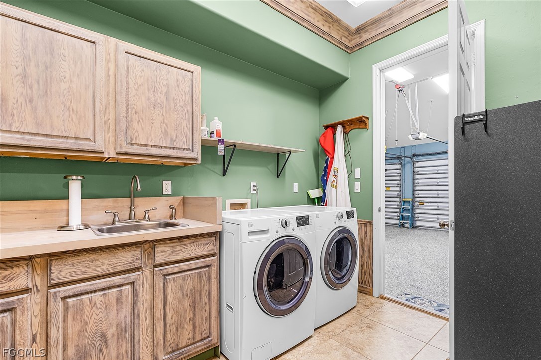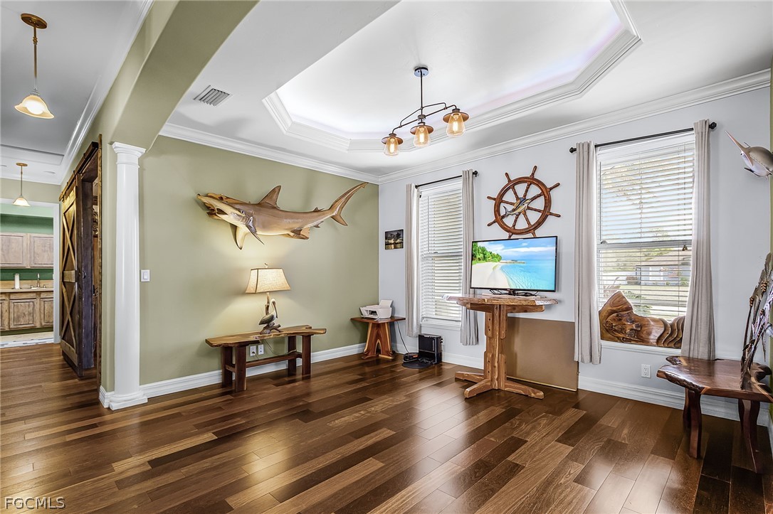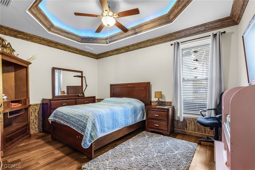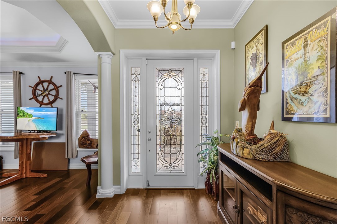 This BEAUTIFUL custom built 2008 home is on an OVERSIZE .41-acre corner lot located in quiet neighborhood in Northeast Cape Coral is a MUST SEE! If you are a mechanic or car enthusiast look NO More!! This home features a massive 1,242 sq ft, 5 PLUS car garage, with 3 bay garage doors, comes with a 8,300 lb car lift, epoxy floor, 14’ high ceilings, shop lighting, wired for whole house generator, garage refrigerator, with double exit doors to a fenced back yard. You will enjoy the SPACIOUS open SPLIT floor plan, beautiful wood floors, 8’ interior doors, tray ceilings, crown molding throughout, with impact windows and doors. The home is 1,993 sf, has 2 Bedrooms, 2 baths plus Den that is furnished and used as a bedroom. You will enjoy the BEAUTIFUL kitchen, new stainless-steel appliances, propane stove/cooktop, granite countertops, breakfast bar, and beautiful solid wood cabinets. The home has a breakfast nook off the kitchen and an open dining area off the living room, a large built-in entertainment area with display nooks, and French doors to the back lanai. The primary suite has access to the screened back lanai, 1 walk-in closet with California closet system, dual vanities, a large walk-in shower, soaking tub, linen closet, and a semi-private toilet room. The guest bath has a walk-in shower, granite countertop and a large storage closet located just outside of the bathroom door. The laundry room has cabinets with sink, gas dryer, and dryer. The home comes with an underground 1,000-gallon propane tank for the kitchen range, outdoor kitchen bar-b-que with sink, tankless hot water heater, and propane dryer. This home has a new 2024 AC system, metal roof, poured concrete walls with lap exterior siding, water treatment system, outside storage room, 6’ white vinyl privacy fence, large back yard with 2 large RV gates with plenty of room for a boat and/or RV parking, and a fire pit. The front screened porch is approximately 28’ long. The home comes furnished with living room furniture, bedroom furniture, kitchen items, and breakfast nook table. (The fish décor, wood carvings, antique diving helmet, safes are excluded.) The home comes with 3 yr old above ground jacuzzi just outside primary suite in the screened patio. Flood Zone X so no flood insurance required. Call today to book your private showing!!! See both video tours: walk-thru and 3D Interactive video!