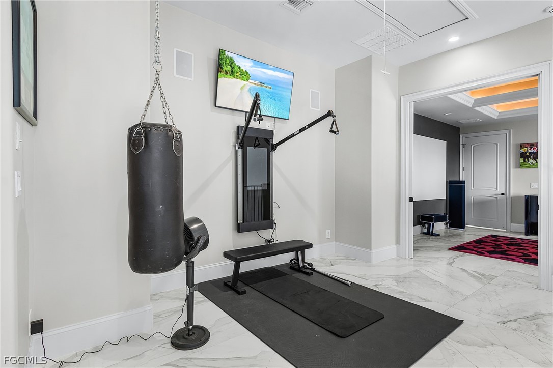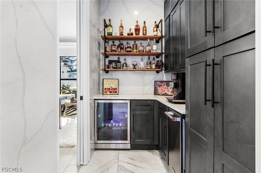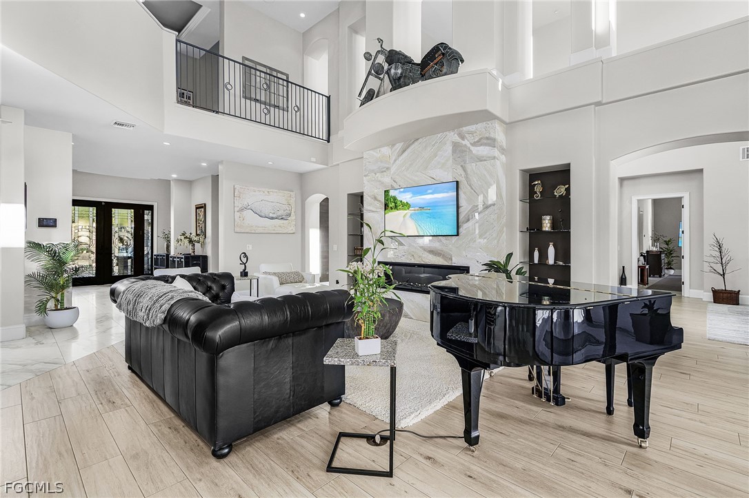 Inside, soaring 30-foot ceilings flood the grand entry with natural light, anchored by a dramatic architectural staircase. Large-format tile flooring flows throughout expansive living areas designed to seamlessly connect indoor and outdoor entertaining. The family room features a stunning 400-gallon saltwater aquarium, creating a relaxed yet unforgettable focal point.
