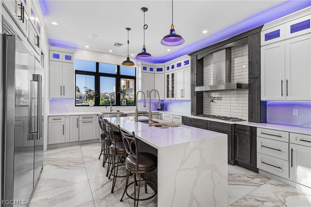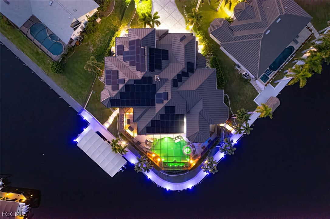 Set on 178 feet of seawall and wraparound dockage, the residence has been completely reimagined through a full designer remodel. A clean modern façade, lush tropical landscaping, and a new standing-seam metal roof paired with paid solar create a striking first impression.