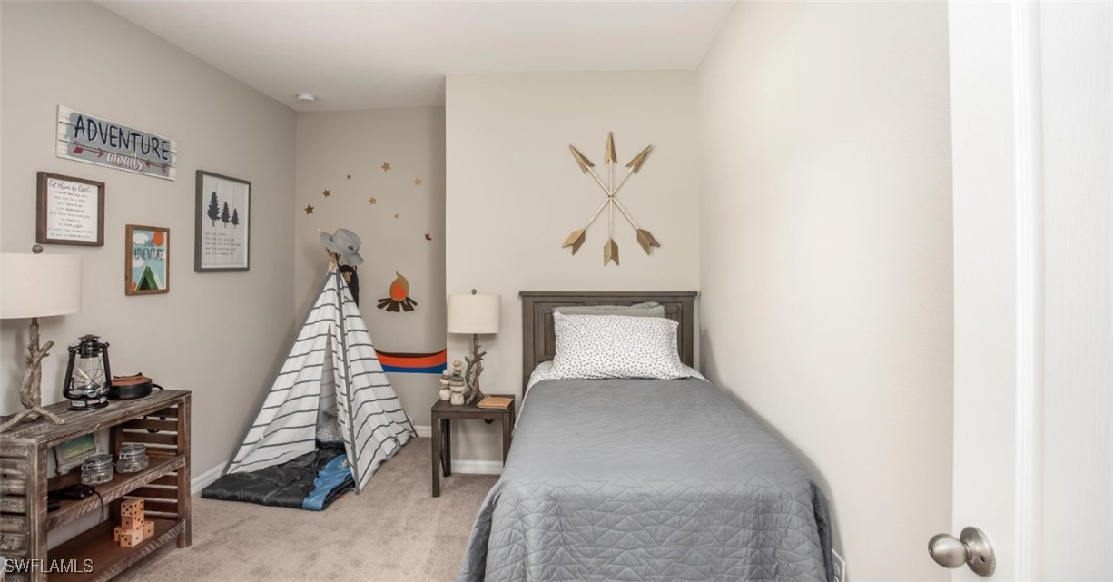 The secondary bedrooms are thoughtfully positioned on the opposite side of the home from the primary suite, enhancing privacy for all. The owner’s suite offers a tranquil retreat with a beautifully tiled walk-in shower and dual vanities. The secondary bathroom features a stylish tile shower/tub combination, blending practicality with comfort.