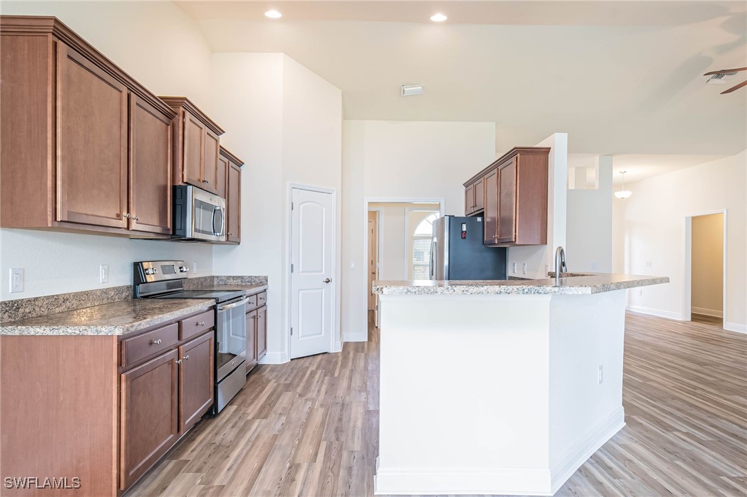 Charming, southern exposure home in a sought-after SW Cape Coral Neighborhood! Discover this beautifully maintained 4-bedroom, 2-bathroom home offering the perfect blend of comfort, style, and location. Enjoy convenient access to major roads, excellent restaurants, shops, and top-rated schools—making it ideal for both relaxation and everyday living. Step inside to find vaulted ceilings that enhance the sense of space with brand new vinyl plank flooring throughout that adds a touch of elegance and durability to every room. The open-concept kitchen seamlessly connects to the living and dining areas, creating a welcoming atmosphere perfect for entertaining or family time. Additionally, the home features a formal dining room that can easily be transformed into a den, home office, or playroom—tailored to your needs. The master suite is a true retreat, complete with a walk-in closet, a luxurious soaking tub, and a separate shower for ultimate relaxation. Outside, enjoy the privacy of a fully fenced yard with durable white vinyl fencing and room to add a pool. The covered porch offers a shaded oasis for morning coffee or evening gatherings. This home also boasts a brand-new roof installed in 2022 for long-term peace of mind. Plus, the property remained high and dry during recent hurricanes, offering valuable reassurance for storm season. This property blends charm, functionality, and peace of mind. Don’t miss the chance to make this exceptional home your own!