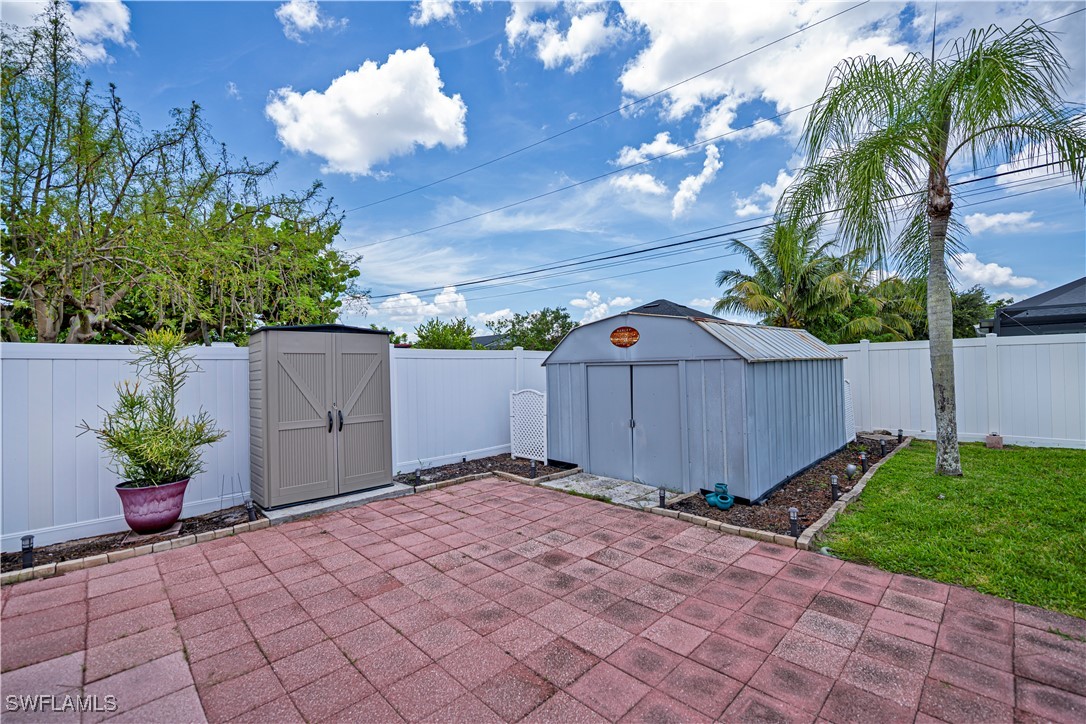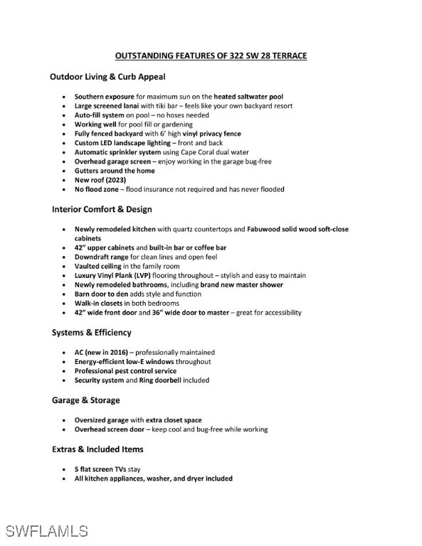 Welcome to your Southwest Florida retreat! This beautifully updated home offers a desirable split-bedroom layout, giving privacy for guests or family. A spacious den with a stylish barn door doubles as a home office, TV room, or third bedroom. The open floor plan connects the living, dining, and kitchen areas for a bright, airy feel, while a vaulted ceiling in the family room enhances the sense of space. Luxury vinyl plank flooring runs throughout for a clean, modern look. The remodeled kitchen is a showstopper with quartz countertops, soft-close solid wood Fabuwood cabinets, 42” uppers, a built-in coffee/bar station, and a sleek downdraft range. Both bathrooms are updated, including a brand-new master shower, and both bedrooms feature walk-in closets. Wide entries (42” front door and 36” master entry) provide easy access. Step outside to your private backyard paradise. Enjoy a heated saltwater pool with full southern exposure, a tiki bar under the oversized screened lanai, custom LED landscape lighting, a 6’ vinyl privacy fence, and an auto-fill pool system. A working well helps offset water costs for pool refills or gardening, while the automatic sprinkler runs on Cape Coral’s dual-water setup. Practical upgrades include a new roof (2023), Low-E windows, gutters, serviced AC (2016), and regular pest control. The oversized garage offers closet storage and an overhead screen, while extras like five flat-screen TVs, washer/dryer, Ring doorbell, and security system add value. Best of all, this home is in a NO flood zone and within a 5-minute walk to Koza Salidino Park—featuring a baseball field, fenced play yard, and open playing field—plus it’s an easy bike ride too. The location is quiet yet just minutes to schools, shopping, restaurants, and everyday conveniences. This one truly checks all the boxes—schedule your showing today!