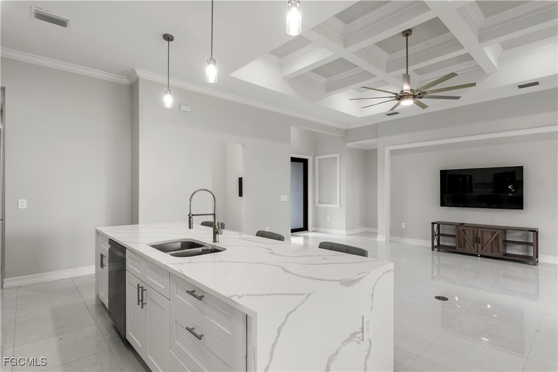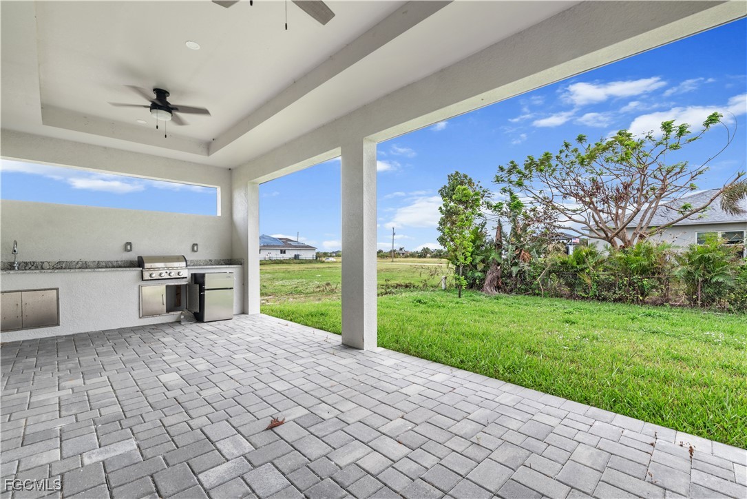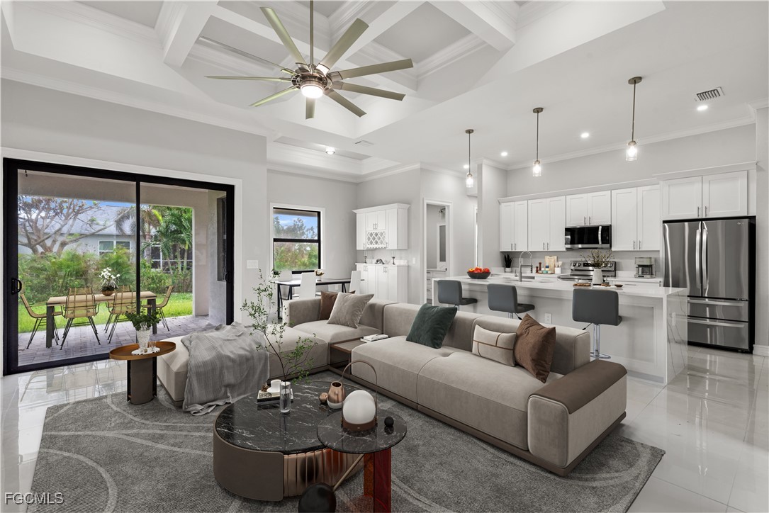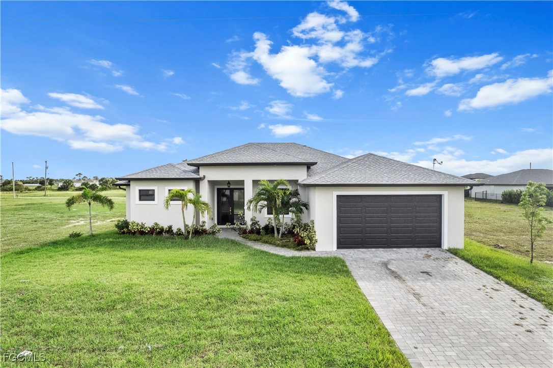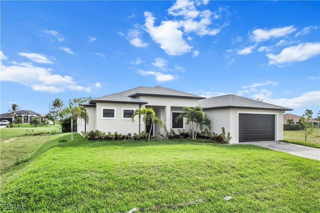 Welcome to your NEW CONSTRUCTION dream home in Cape Coral LOADED WITH UPGRADES and modern finishes. Featuring 3 beds plus den/office, 2 full baths, and nearly 1,918 SF. Designed with high ceilings, crown molding, and detailed coffered ceilings. Plus upgraded porcelain tile throughout (no carpet) & hurricane-impact windows & doors. The oversized 2-car garage has epoxy floors. The gourmet kitchen is a showstopper with a quartz waterfall island, elegant white shaker cabinetry, stainless steel appliances, pendant lighting, and a dry bar/coffee station. A formal dining area and bar-top seating. Retreat to the luxurious primary suite, featuring tray ceilings and a spa-quality bathroom with dual vanities, a soaking tub, a feature wall, and a walk-through shower. The spacious walk-in closet is perfect for storing clothes and accessories. Two large guest bedrooms, a private den/flex space, and a full guest bath with a walk-in shower provide ample space for family and guests. The bright, open-concept great room features soaring tray ceilings, recessed lighting, and impact-resistant sliding glass doors that seamlessly connect indoor and outdoor living spaces. Enjoy Florida living at its best in your private backyard oasis, with a large undercover patio lanai, outdoor kitchen with built-in grill, and plenty of room for a future pool. Entertain friends, relax with family, or unwind while enjoying SW Florida’s endless sunshine. Located in the desirable NW Cape near boat ramps and golf courses. Buy with confidence knowing this new home was built to the latest Florida building codes, with storm protection and energy efficiency in mind. Cape Coral’s most desirable and fast-growing areas. Just minutes from the future Cape Coral Grove, a 131-acre mixed-use town center on Pine Island Road, may feature over retail and entertainment, upscale apartments, a 125-room hotel, two public parks, and vibrant community events. It will serve as a lively hub for living, shopping, dining, working, and hosting up to 200 annual events—all expected to generate a projected $1.3 billion economic impact that will reshape the area. You're just minutes from shopping, dining, parks, schools, and a short drive to beaches and boating. Golf enthusiasts will appreciate being just minutes from Palmetto Pines Country Club & Coral Oaks Golf Course. It is also near the highly anticipated Seven Islands waterfront development, expected to feature restaurants, boutique shops, marinas, parks, green space, and possibly a beach area—making it one of Cape Coral’s most promising future destinations. Enjoy quick and easy access to Fort Myers, beautiful Florida beaches, theaters, and events. Additional developments: The Cove at 47th with w/boutique shops & nightlife; the Bimini Basin project with restaurants and a new Lee Health medical facility; the reimagined Cape Coral Yacht Club with beach, marina, and recreation center; and Slipaway Marina offering boat slips, waterfront dining, and entertainment.