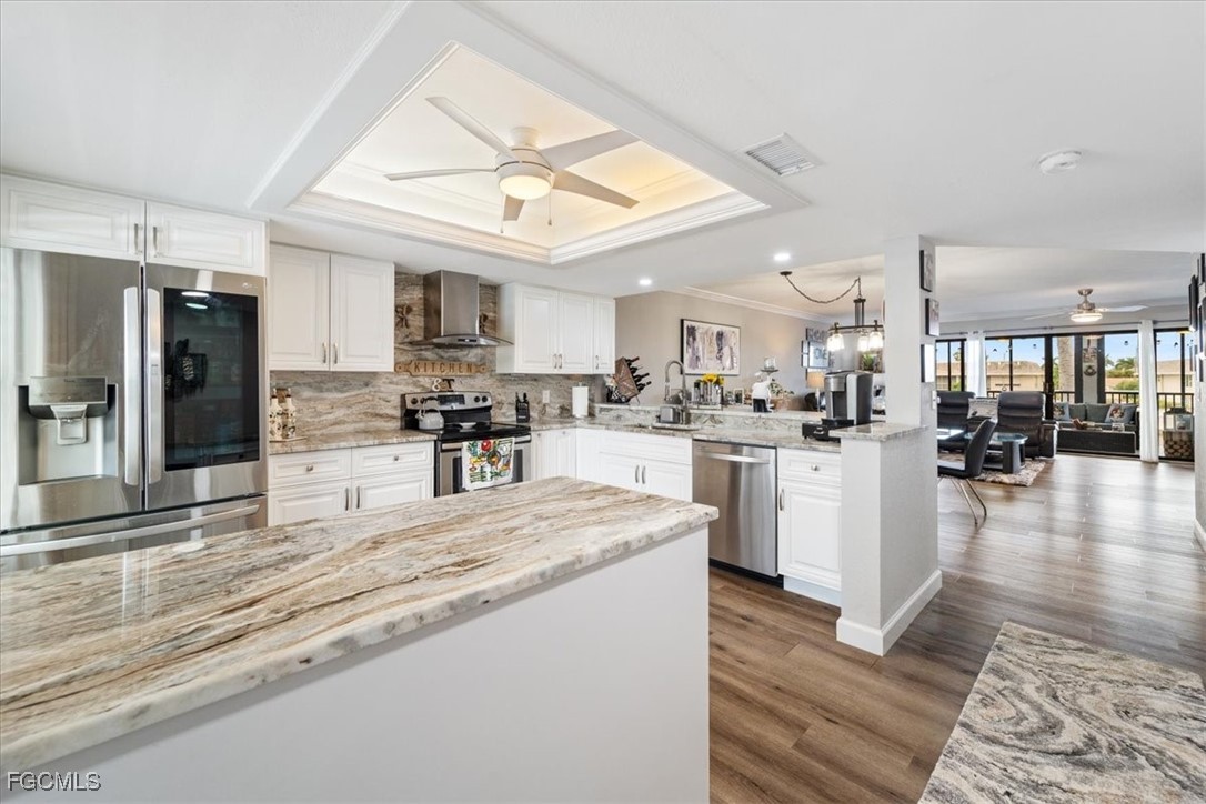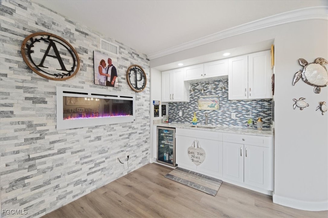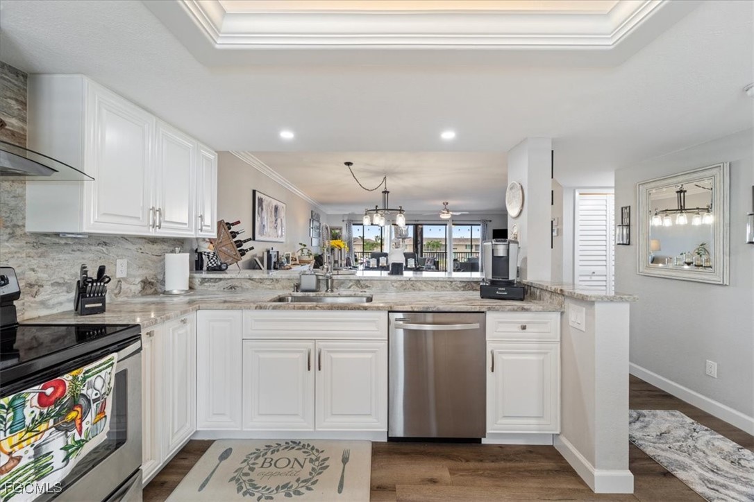 Step inside and you’ll immediately notice the open layout designed for both comfort and entertaining. The wet bar is perfect for hosting friends, while the sleek electric fireplace built into the wall adds warmth and a modern touch. The chef’s kitchen and spacious living area flow seamlessly to the screened lanai—where you’ll enjoy breathtaking western exposure and Florida’s best sunsets every evening.
