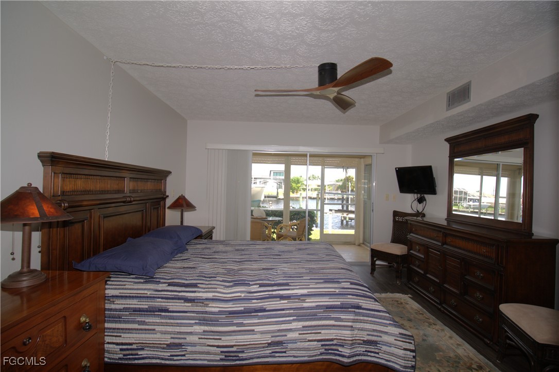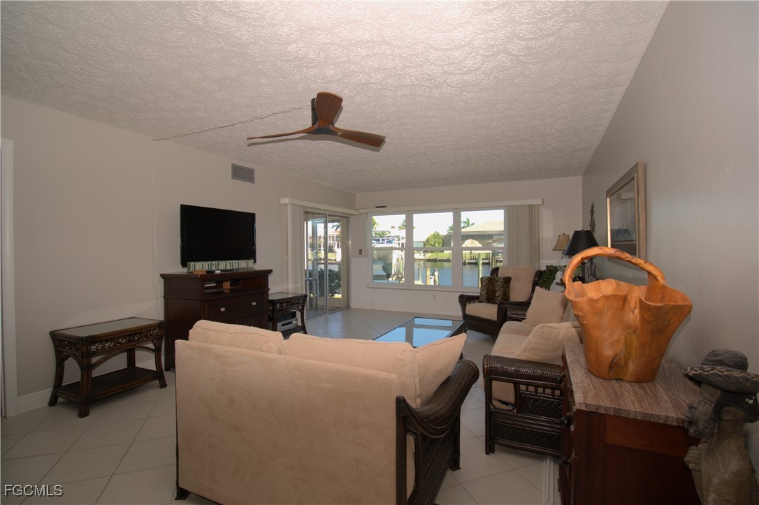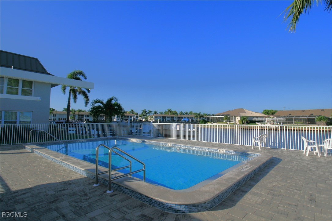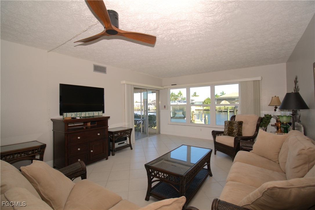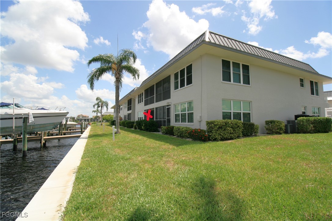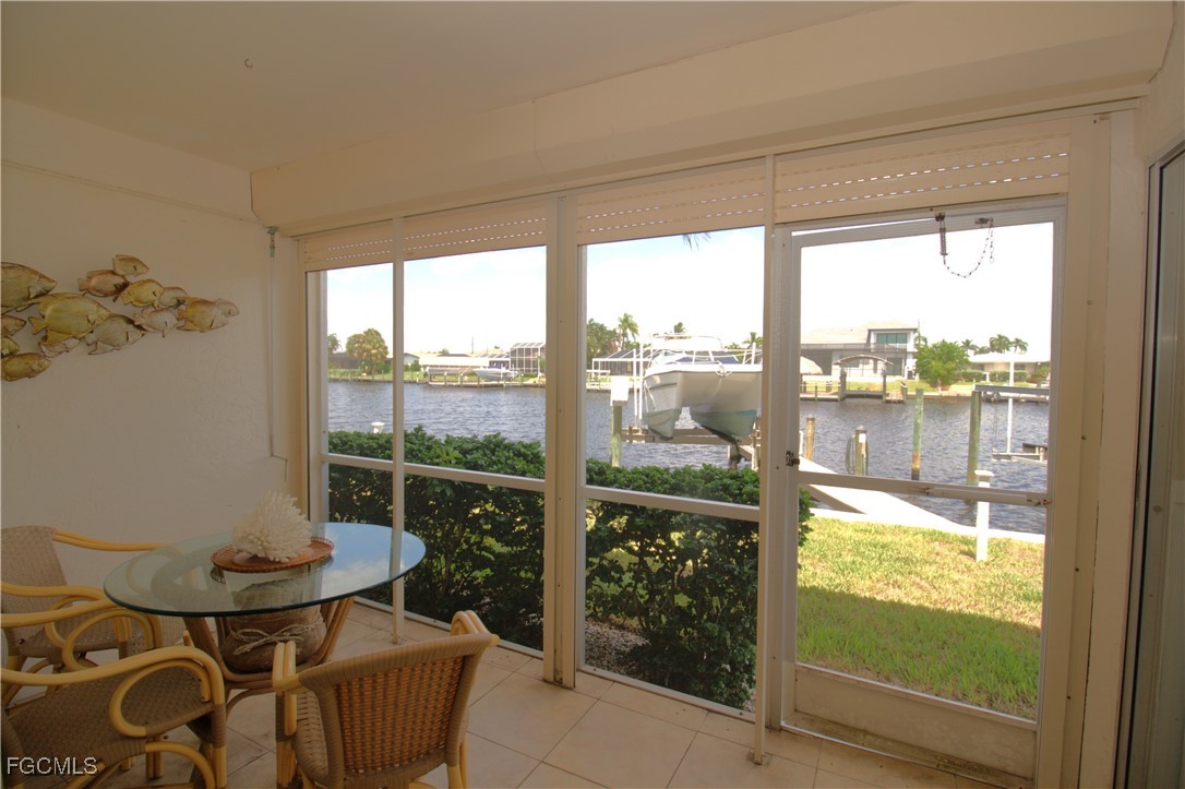 DIRECT GULF ACCESS CONDO/NO BRIDGES! Located on 200 ft. wide intersecting canals with expansive water views. This first floor unit has been beautifully updated featuring an updated kitchen with quartz countertops and tile backsplash, plantation shutters and bead board wainscoting for a coastal vibe. Lots of water views from the spacious greatroom area, with room to accommodate a dining table or extra seating for guests. Flexible space off the kitchen can be used as a breakfast/dining area or home office. Primary Suite has slider doors leading to the screened lanai with a beautiful water view. Both bathrooms feature quartz countertops and stylish tile accents with a large walk-in tub in the guest bath and double sinks in the primary bath. Large laundry room with extra cabinets for storage. Plenty of extra storage space in this unit with a large walk-in closet in the primary suite bathroom. Dock space is assigned by the association. Well funded HOA, they have just completed resurfacing the community pool for residents to enjoy. The boat slip assigned to this unit does not have a dock or lift installed, but, can be installed by the new owner.