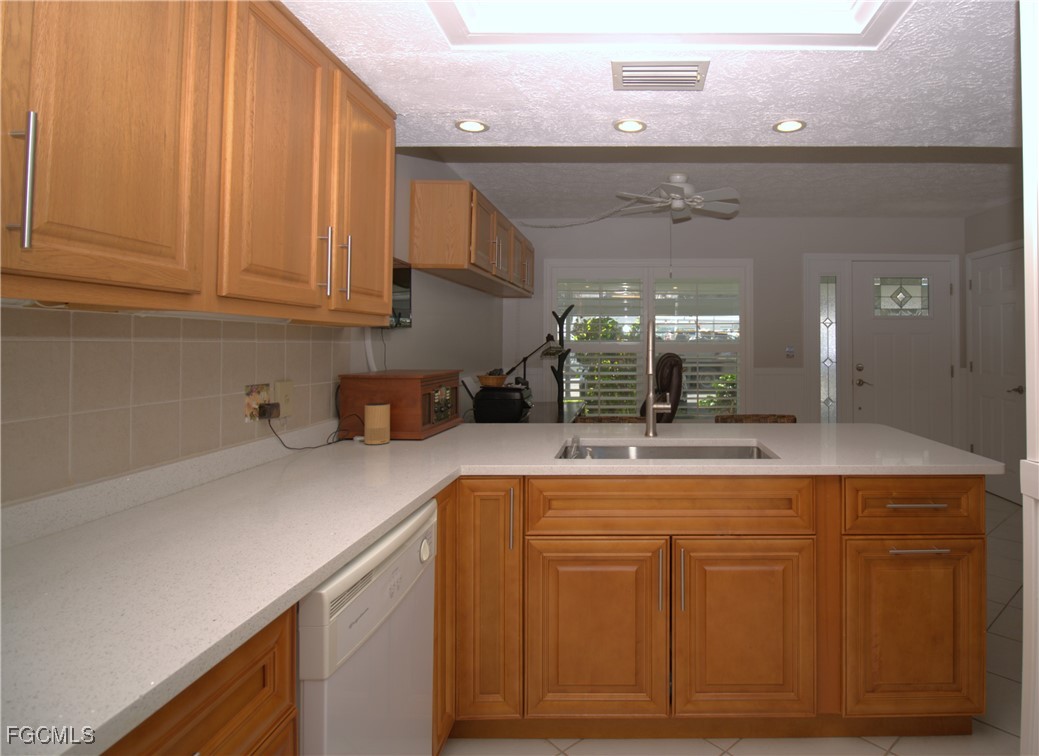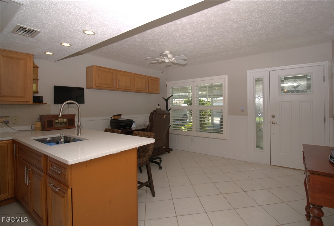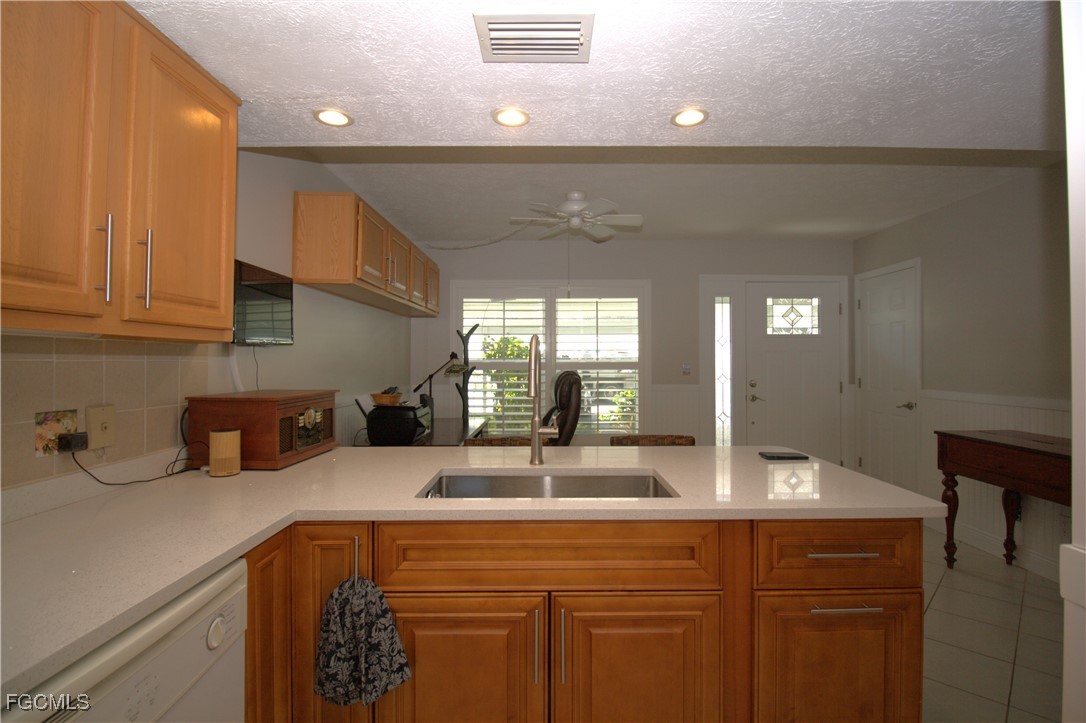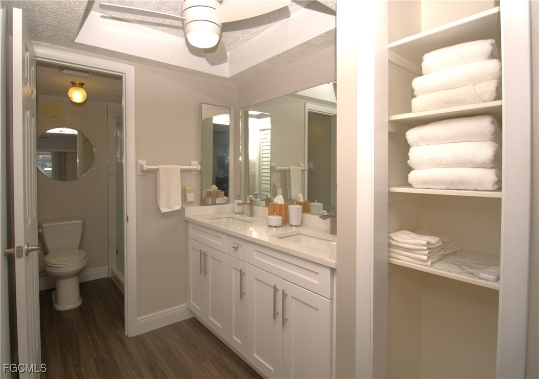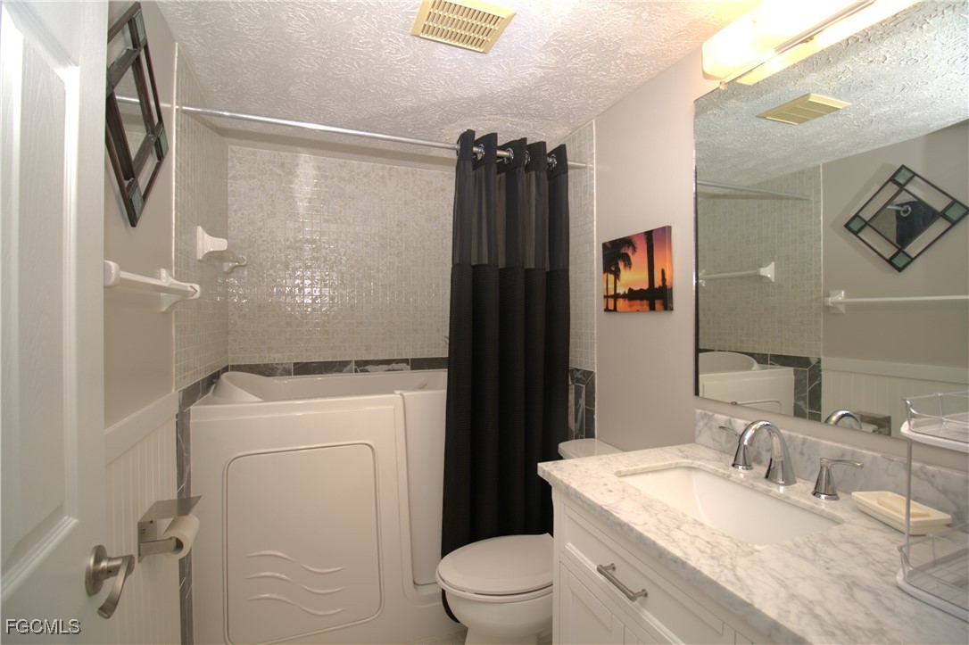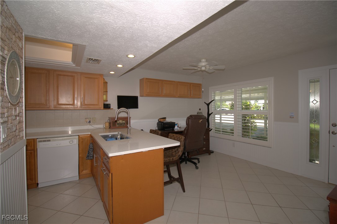 DIRECT GULF ACCESS CONDO/NO BRIDGES! Located on 200 ft. wide intersecting canals with expansive water views. This first floor unit has been beautifully updated featuring an updated kitchen with quartz countertops and tile backsplash, plantation shutters and bead board wainscoting for a coastal vibe. Lots of water views from the spacious greatroom area, with room to accommodate a dining table or extra seating for guests. Flexible space off the kitchen can be used as a breakfast/dining area or home office. Primary Suite has slider doors leading to the screened lanai with a beautiful water view. Both bathrooms feature quartz countertops and stylish tile accents with a large walk-in tub in the guest bath and double sinks in the primary bath. Large laundry room with extra cabinets for storage. Plenty of extra storage space in this unit with a large walk-in closet in the primary suite bathroom. Dock space is assigned by the association. Well funded HOA, they have just completed resurfacing the community pool for residents to enjoy. The boat slip assigned to this unit does not have a dock or lift installed, but, can be installed by the new owner.