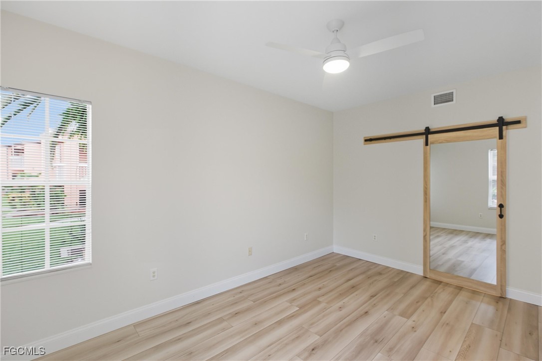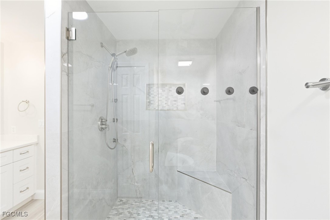 The PRIMARY SUITE has a custom PORCELAIN shower with GLASS ENCLOSURE, quartz vanity, and BARN DOOR entry. The GUEST SUITE also offers direct bedroom access to an updated bath, which conveniently serves as the home’s second bath. Additional highlights include a wide hallway, updated laundry room, interior paint, trim, and baseboards.