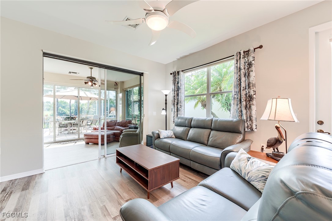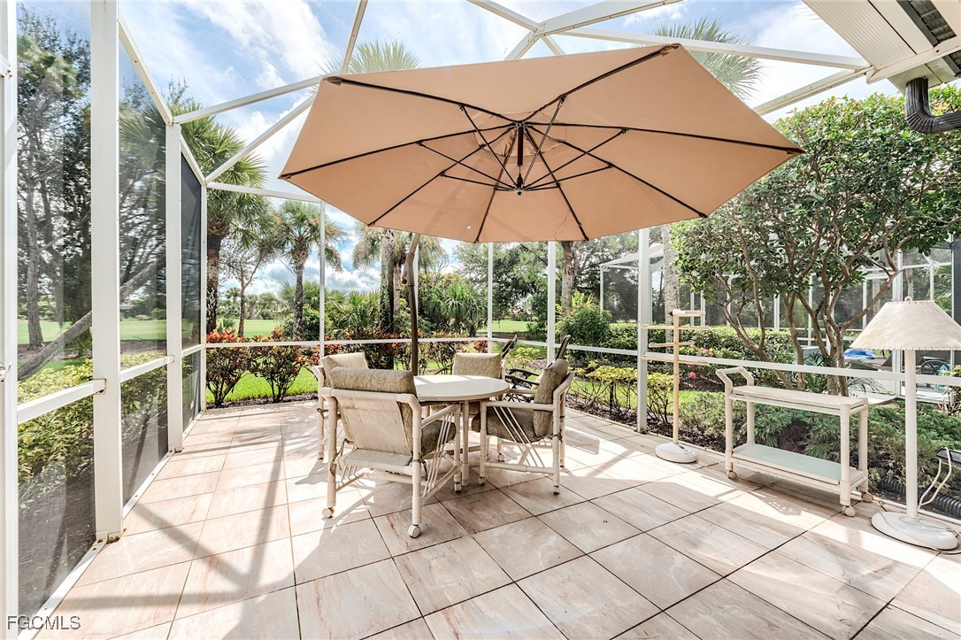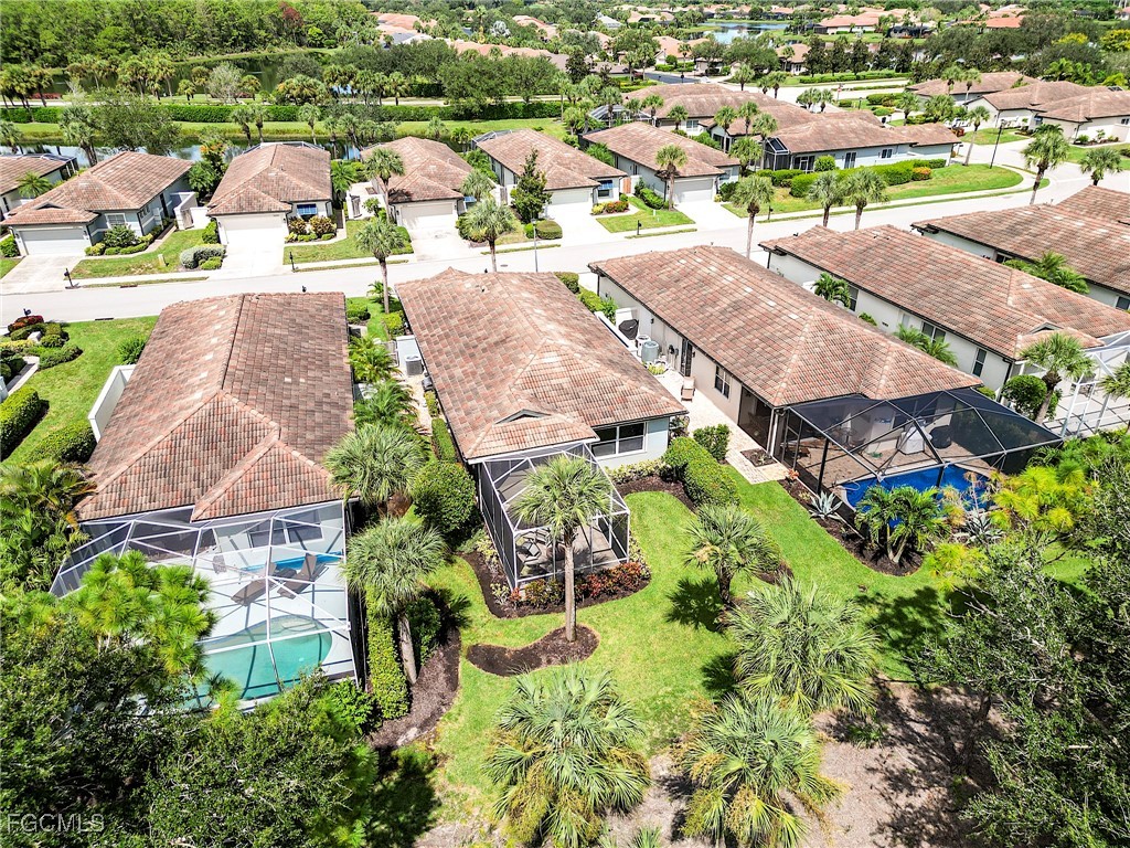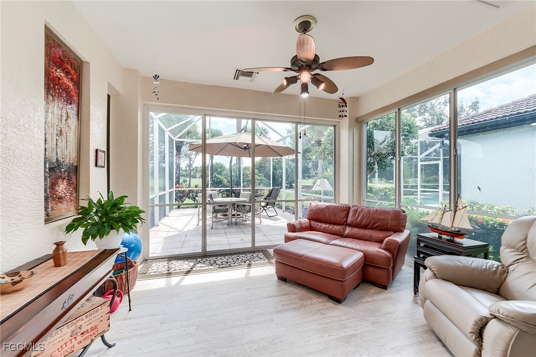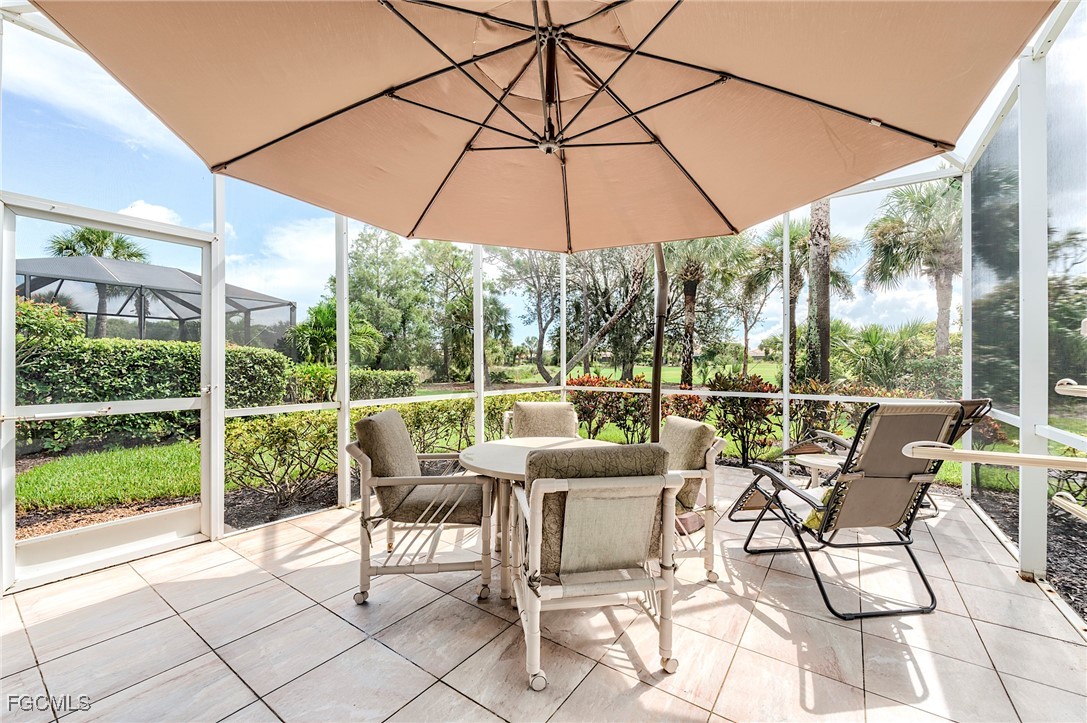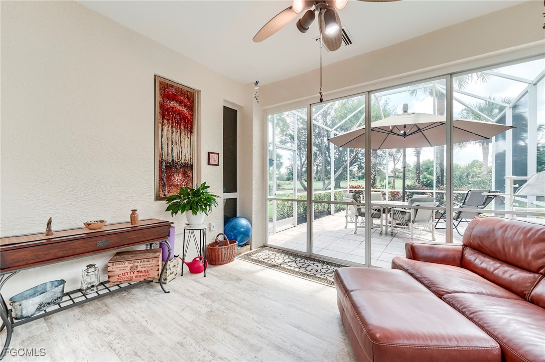 Welcome to this WCI-built Picasso model home in the Avila community of Pelican Preserve, a "walls-in only" insurance community where the HOA handles all exterior maintenance. The HOA/Condo replaced the roof, gutters, downspouts, and painted the exterior in 2021. Pelican Preserve is a nationally recognized active lifestyle 55+ gated master-planned community. This single-family home overlooks the #2 Heron Hole on the membership optional 27-hole golf course. Featuring 2 bedrooms, 2 bathrooms, a den/office, dining room, 2-car garage, and an enclosed Florida room with sliders for an indoor-outdoor feel, the floor plan is both functional and inviting. The screened lanai offers beautiful views and space for a potential pool. All windows and doors have electric roll-down shutters for peace of mind. The home has gas availability but currently uses electric for cooking, along with a tankless gas water heater for endless hot water. Move-in ready, with new LVP flooring, fresh paint and updates throughout. This house offers access to 3 pools, a fitness center, spa, game room, billiards, woodworking shop, 2 restaurants, a preserve with a boardwalk, dog park, fishing pier, 27-hole golf course, pickleball, tennis, and a theater. Fiber Internet and TV service is included so you only have to pay for electric, gas, and water.