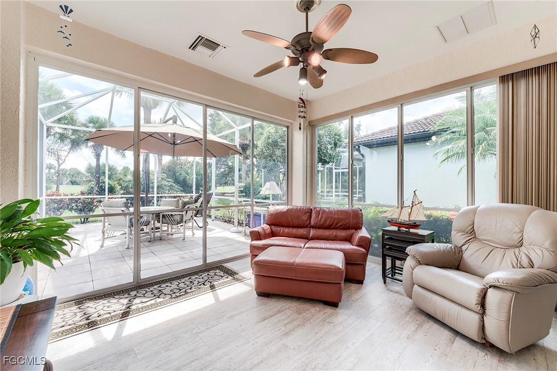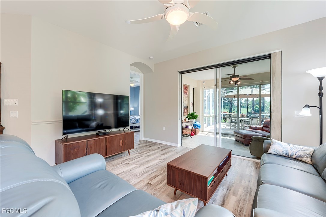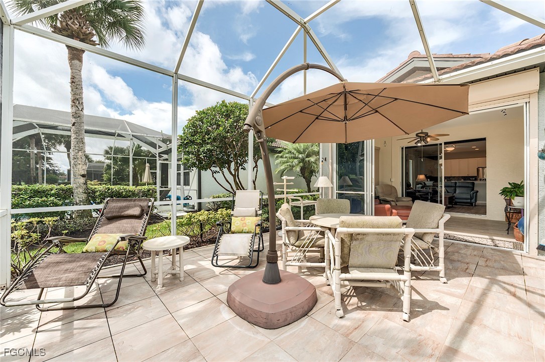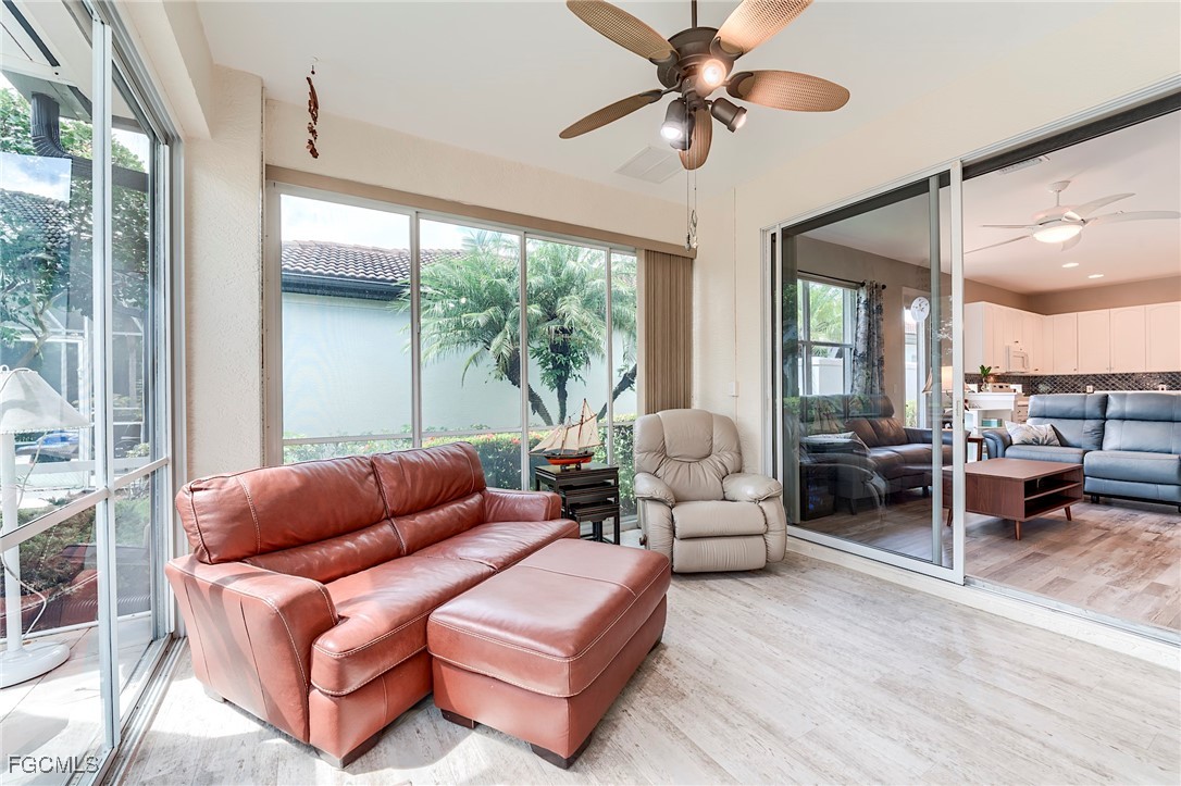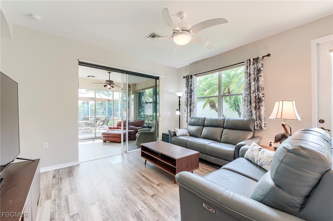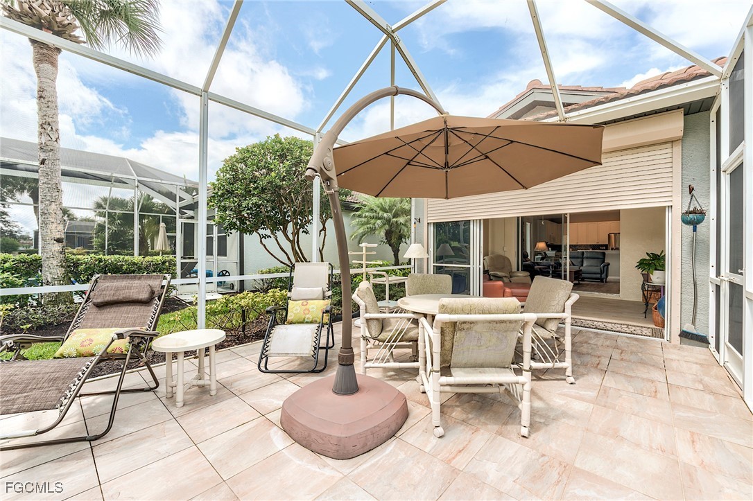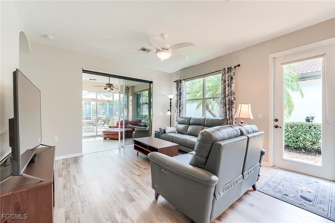 Welcome to this WCI-built Picasso model home in the Avila community of Pelican Preserve, a "walls-in only" insurance community where the HOA handles all exterior maintenance. The HOA/Condo replaced the roof, gutters, downspouts, and painted the exterior in 2021. Pelican Preserve is a nationally recognized active lifestyle 55+ gated master-planned community. This single-family home overlooks the #2 Heron Hole on the membership optional 27-hole golf course. Featuring 2 bedrooms, 2 bathrooms, a den/office, dining room, 2-car garage, and an enclosed Florida room with sliders for an indoor-outdoor feel, the floor plan is both functional and inviting. The screened lanai offers beautiful views and space for a potential pool. All windows and doors have electric roll-down shutters for peace of mind. The home has gas availability but currently uses electric for cooking, along with a tankless gas water heater for endless hot water. Move-in ready, with new LVP flooring, fresh paint and updates throughout. This house offers access to 3 pools, a fitness center, spa, game room, billiards, woodworking shop, 2 restaurants, a preserve with a boardwalk, dog park, fishing pier, 27-hole golf course, pickleball, tennis, and a theater. Fiber Internet and TV service is included so you only have to pay for electric, gas, and water.