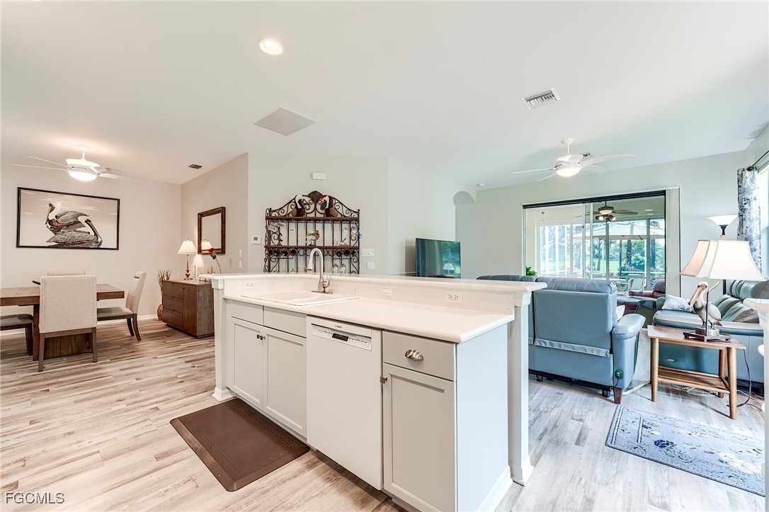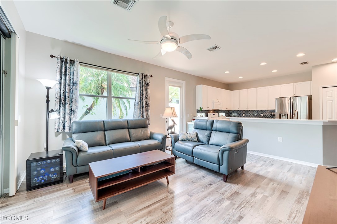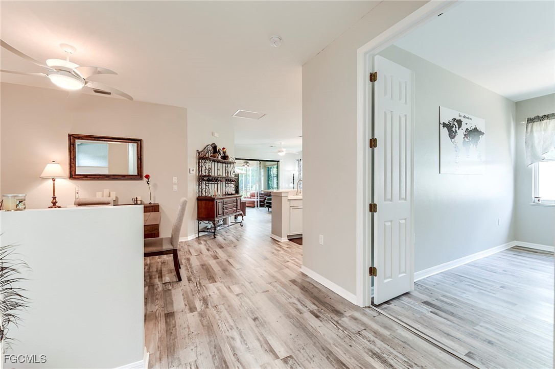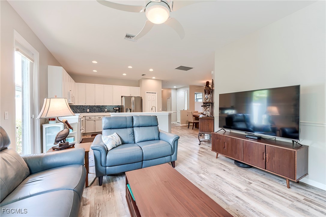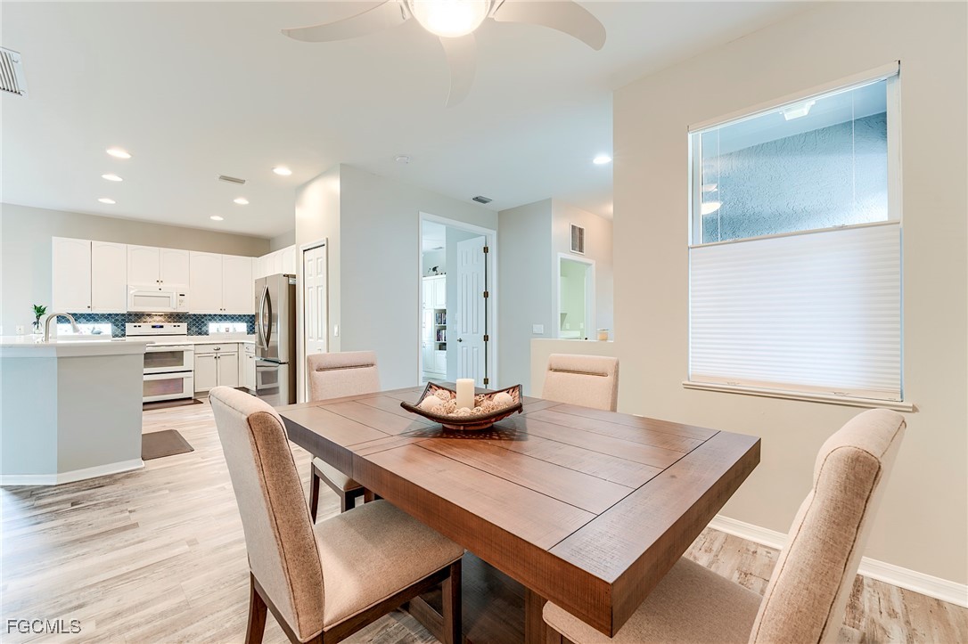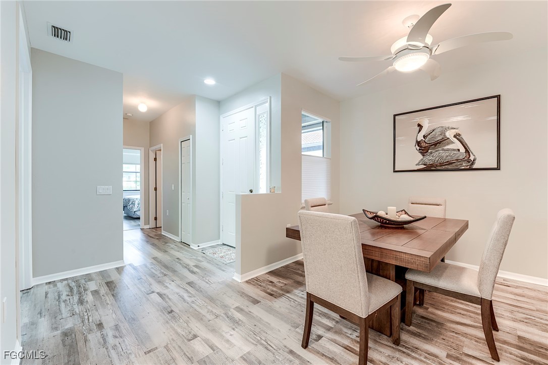 Welcome to this WCI-built Picasso model home in the Avila community of Pelican Preserve, a "walls-in only" insurance community where the HOA handles all exterior maintenance. The HOA/Condo replaced the roof, gutters, downspouts, and painted the exterior in 2021. Pelican Preserve is a nationally recognized active lifestyle 55+ gated master-planned community. This single-family home overlooks the #2 Heron Hole on the membership optional 27-hole golf course. Featuring 2 bedrooms, 2 bathrooms, a den/office, dining room, 2-car garage, and an enclosed Florida room with sliders for an indoor-outdoor feel, the floor plan is both functional and inviting. The screened lanai offers beautiful views and space for a potential pool. All windows and doors have electric roll-down shutters for peace of mind. The home has gas availability but currently uses electric for cooking, along with a tankless gas water heater for endless hot water. Move-in ready, with new LVP flooring, fresh paint and updates throughout. This house offers access to 3 pools, a fitness center, spa, game room, billiards, woodworking shop, 2 restaurants, a preserve with a boardwalk, dog park, fishing pier, 27-hole golf course, pickleball, tennis, and a theater. Fiber Internet and TV service is included so you only have to pay for electric, gas, and water.