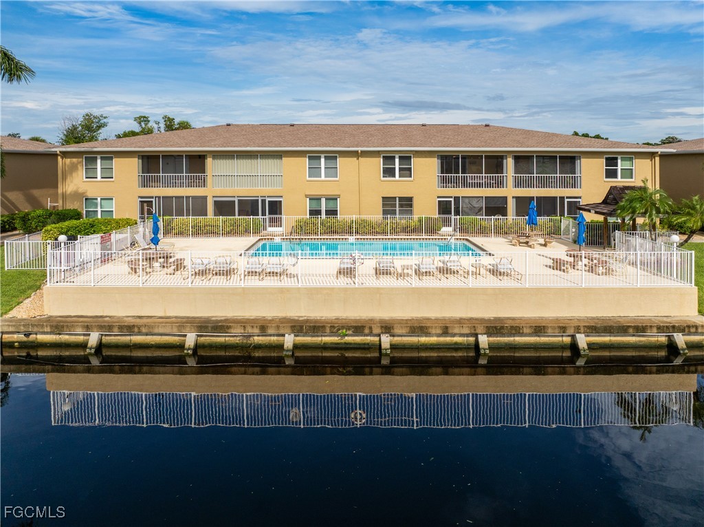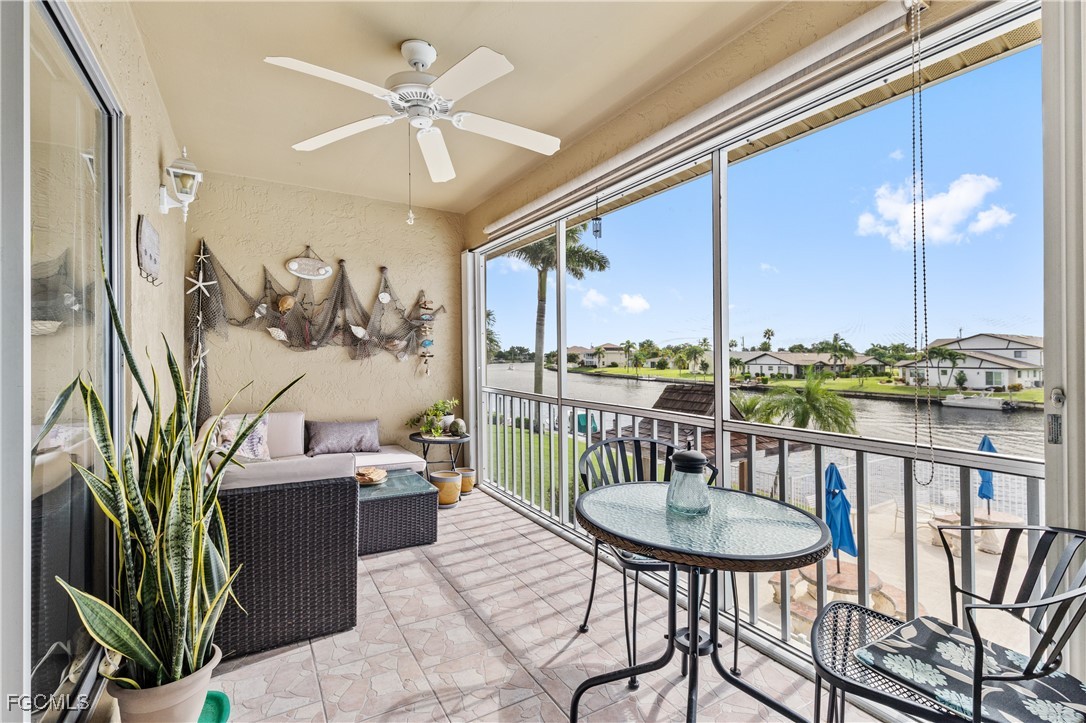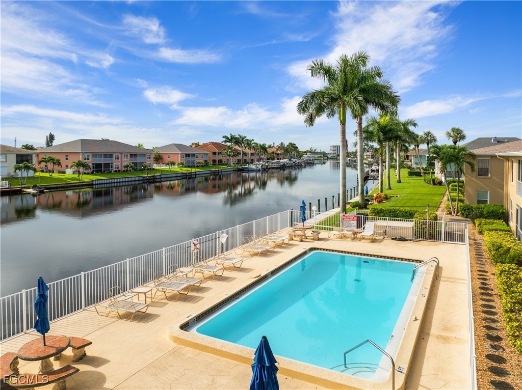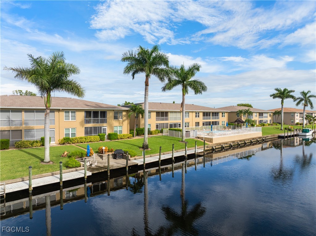 Major Price Reduction! Welcome to your piece of paradise in this beautifully maintained 2nd-floor condo! Enjoy this Turnkey 2 bed, 2 bath condo in a desirable 55+ community on the 200-foot-wide Rubicon Canal with Gulf access. This 2nd floor home features granite countertops in the kitchen and both bathrooms, a spacious island with seating, updated guest bath, front sitting room, and a primary suite with walk-in closet. Ceiling fans are found throughout, and a new washer and dryer were added in 2024. Recent updates include a new roof, new carports, HVAC in 2021, and the condo includes hurricane shutters for peace of mind. The condo is sold Fully Furnished, so you can move right in and start enjoying the Florida lifestyle. Community amenities include a heated pool with grill and tiki area, along with six shared dock spaces available on a first-come basis. The HOA provides low-maintenance living with trash, water, sewer, pest control, pool care, and landscaping all included. This is a non-rental, no-pet, no-smoking community offering serene waterfront living in Cape Coral—just bring your suitcase and enjoy your waterfront views of the largest canal in Cape Coral from your screened in lanai!