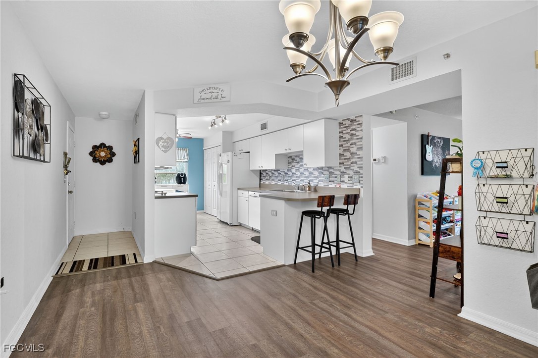 Step inside to an open, airy floor plan featuring luxury vinyl plank flooring and a tile entryway for easy care and lasting style. The bright eat-in kitchen includes white cabinetry, smooth-top stove, side-by-side refrigerator, microwave, dishwasher, pantry, and a modern tile backsplash. The space flows seamlessly into the dining and living areas, perfect for everyday living or hosting friends and family.