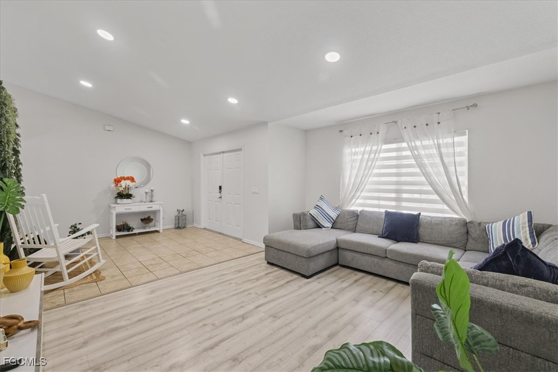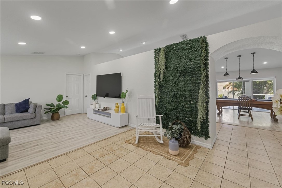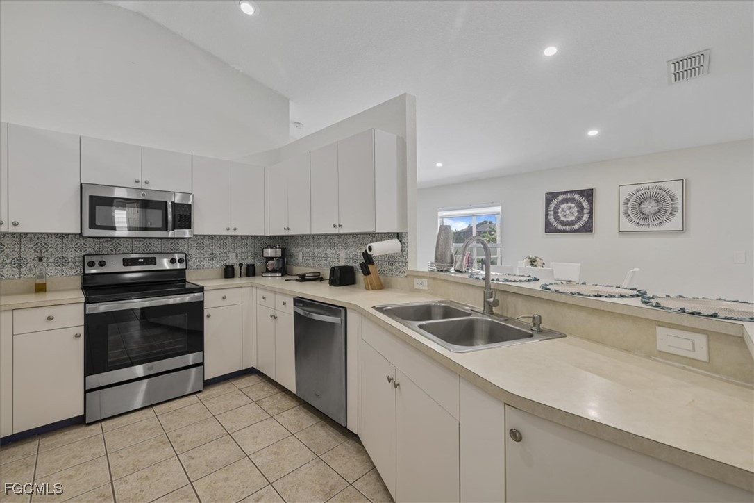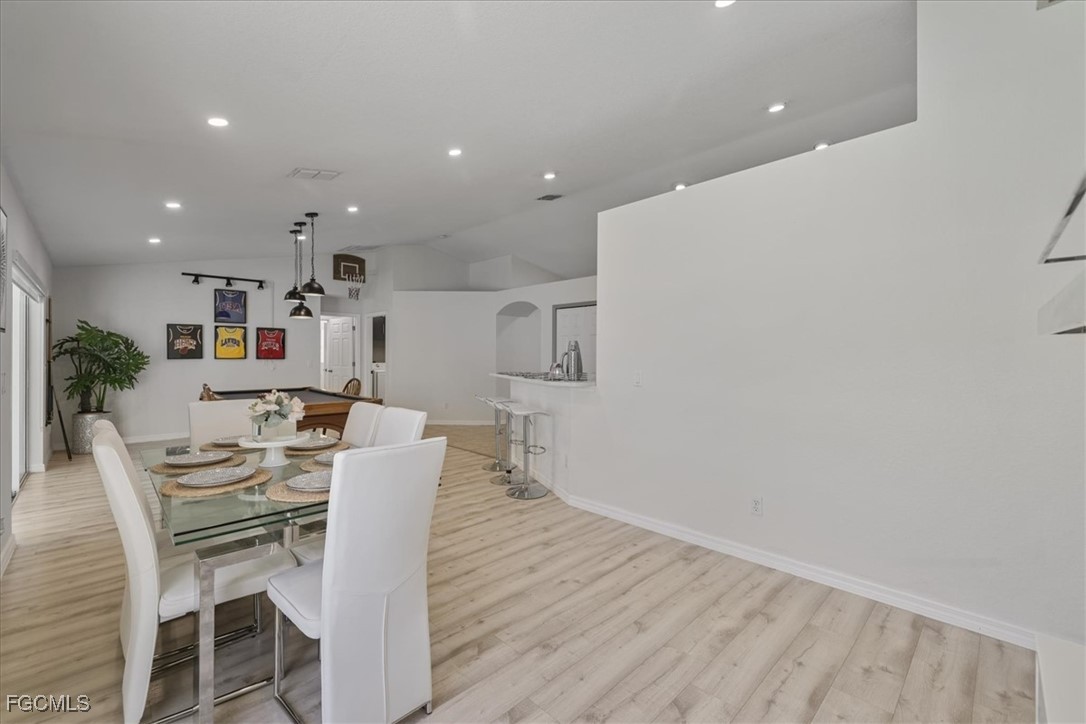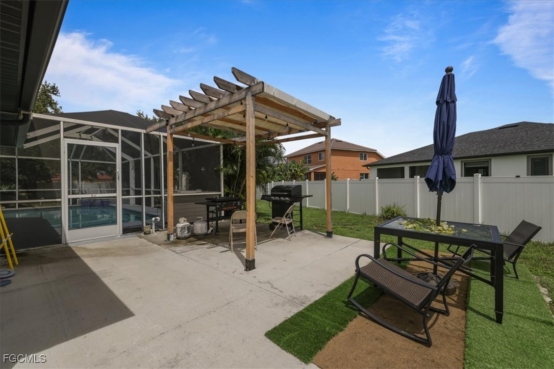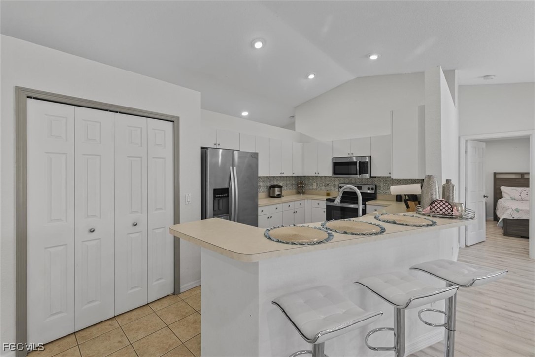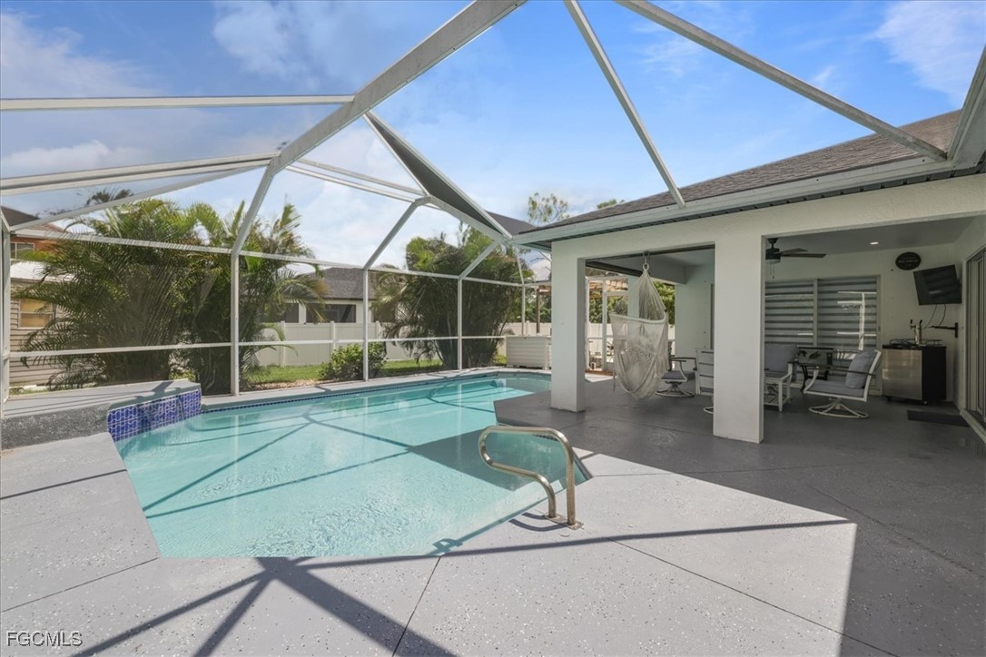 Welcome to your tropical retreat in the highly desirable Northwest Cape Coral! This beautifully maintained 3-bedroom, 2-bathroom pool home offers the perfect blend of comfort, style, and Florida living. Step inside to find a bright and open floor plan, featuring high ceilings, tile and vinyl flooring throughout, and a spacious living room ideal for entertaining. The kitchen features stainless steel appliances; ample cabinets space and a breakfast bar. The split bedroom layout provides privacy for the owner's suite, which boasts a walk-in closet and en-suite bath with dual sinks and a walk-in shower. Two additional bedrooms and a second full bath make this home ideal for families, guest, or a home office setup. Outside, your personal oasis awaits: a screened-in lanai with a sparkling heated pool, perfect for relaxing or hosting poolside gatherings year-round. The fenced in back yard offers plenty of room for pets, kids, or even a future garden. Come in and see for yourself.