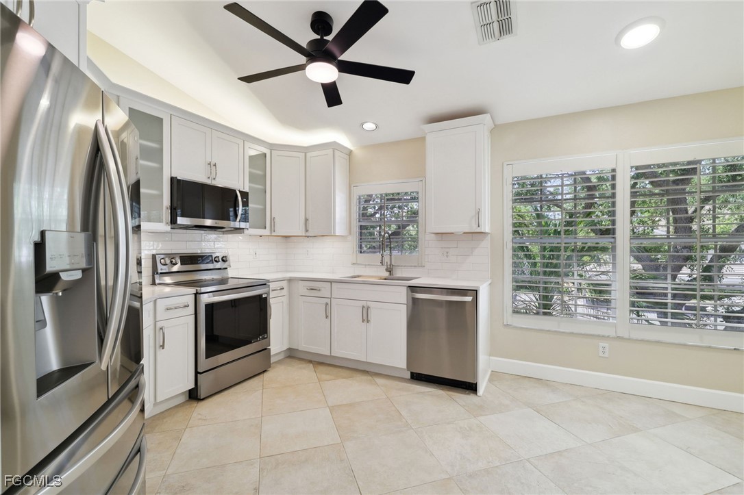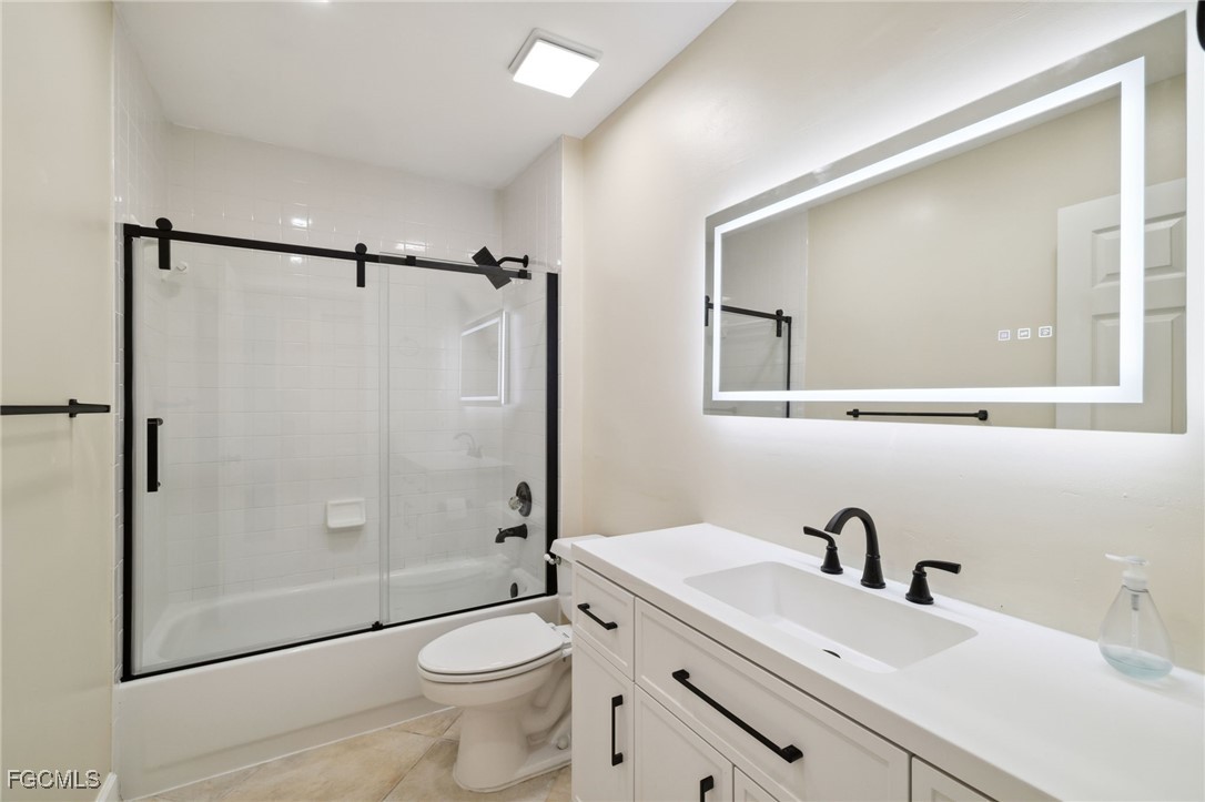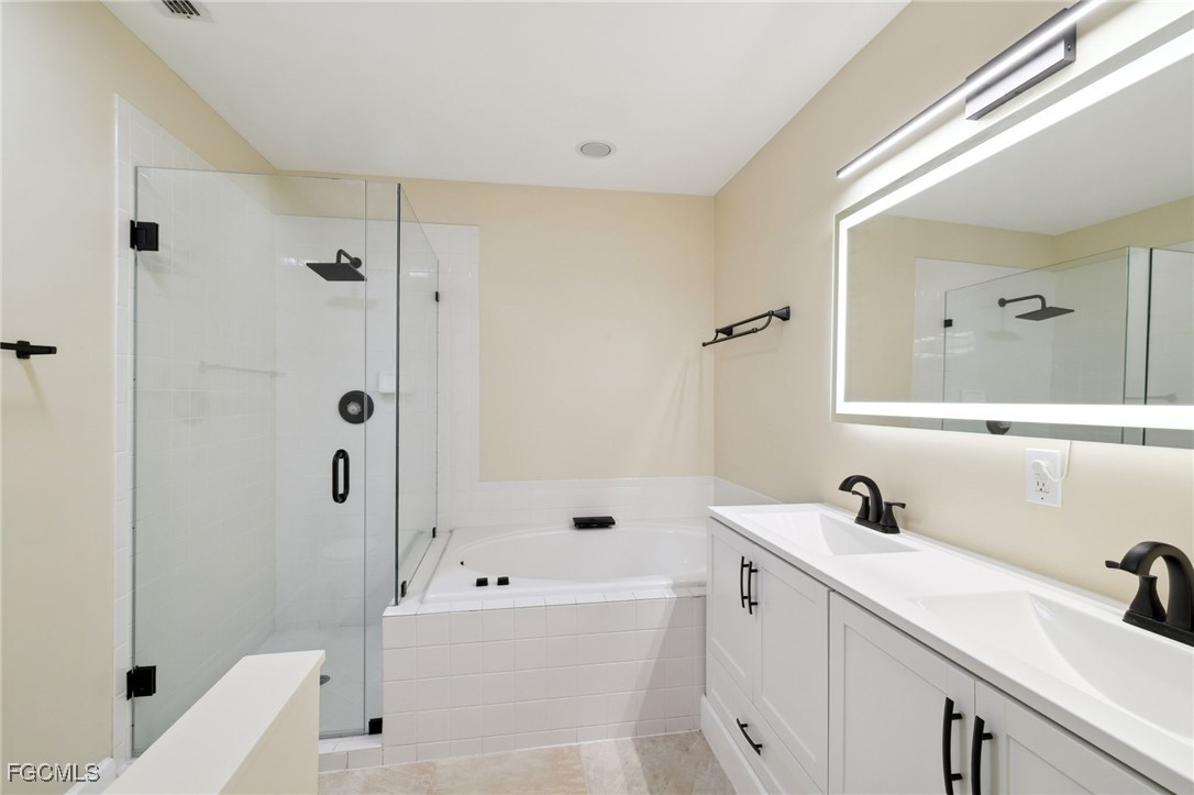 Welcome to 3770 Fieldstone Blvd, Unit 108 – a beautifully renovated end unit with no one above you, nestled in the highly desirable Wilshire Lakes community of Naples. This spacious 2-bedroom + den, 2-bath condo offers a perfect blend of elegance, comfort, and modern upgrades in a prime location just minutes from world-class beaches, shopping, and dining. Step inside to discover a light-filled, open floor plan with plantation shutters throughout, neutral tile flooring, and a versatile den that can easily function as a third bedroom. A built-in cutout allows space for a closet or custom built-ins, making it ideal for guests, a home office, or creative use. The kitchen is a showstopper, featuring all new stainless-steel appliances, sleek quartz countertops, upgraded cabinetry, and a deep farmhouse-style sink that adds a fresh, modern flair. The primary suite is its own private retreat, complete with his and her walk-in closets and a spa-inspired ensuite bathroom. Enjoy a luxurious soaking tub, a large frameless glass walk-in shower with a rain showerhead, and a double vanity with LED backlit mirror and matte black fixtures. The guest bathroom is equally impressive, offering a beautifully updated vanity, new sink and mirror, and a modern frameless sliding glass shower door over a full tub. Step outside to relax and unwind on the spacious screened-in lanai, now featuring new decorative tile flooring and fresh screening—perfect for morning coffee or an evening glass of wine in the Naples breeze. Wilshire Lakes is a gated community offering 24-hour security and resort-style amenities including two pools, a fitness center, tennis courts, and a beautiful clubhouse. This prime North Naples location is just minutes from Vanderbilt Beach, The Shoppes at Galleria & Mercato, where fine dining, shopping, and entertainment await. Whether you're seeking a seasonal escape, investment property, or your forever home, this turnkey-ready condo delivers luxury and convenience in one of Naples' most sought-after communities.