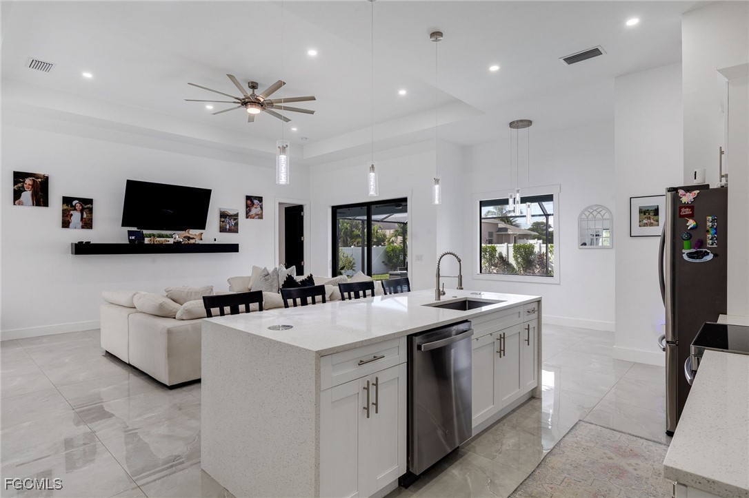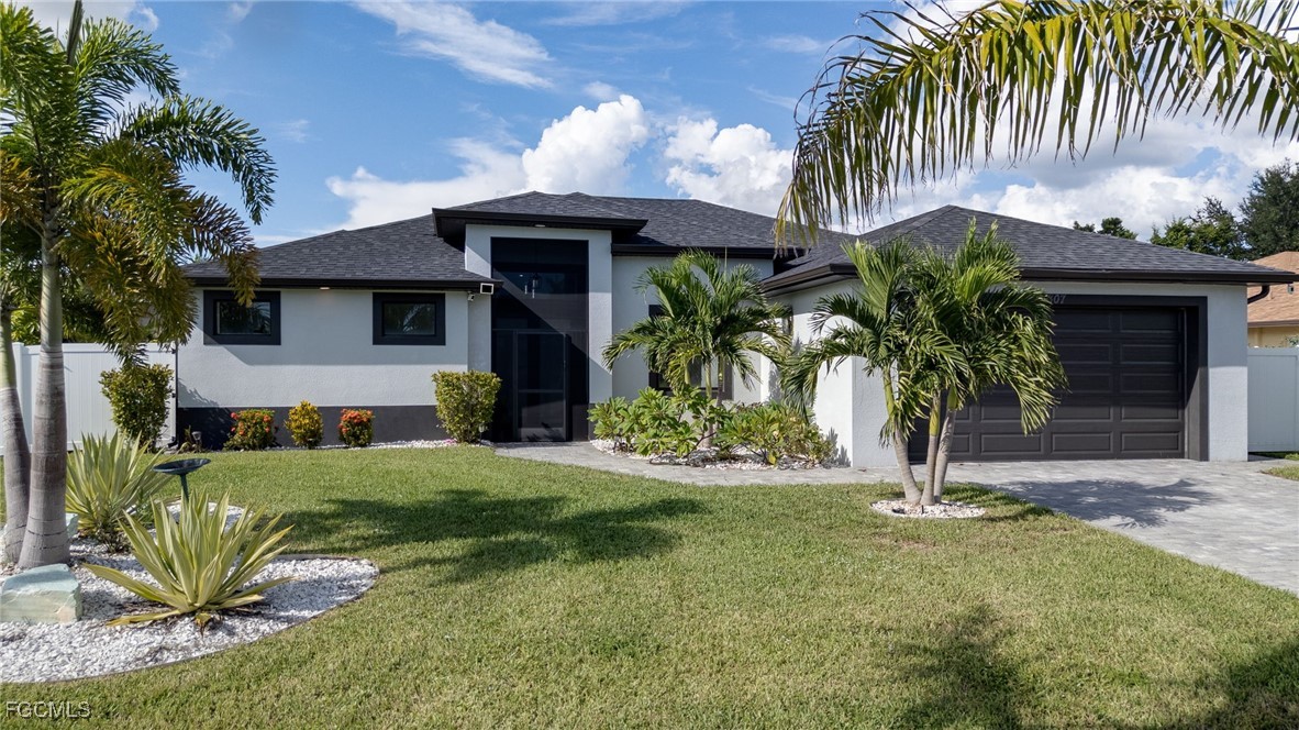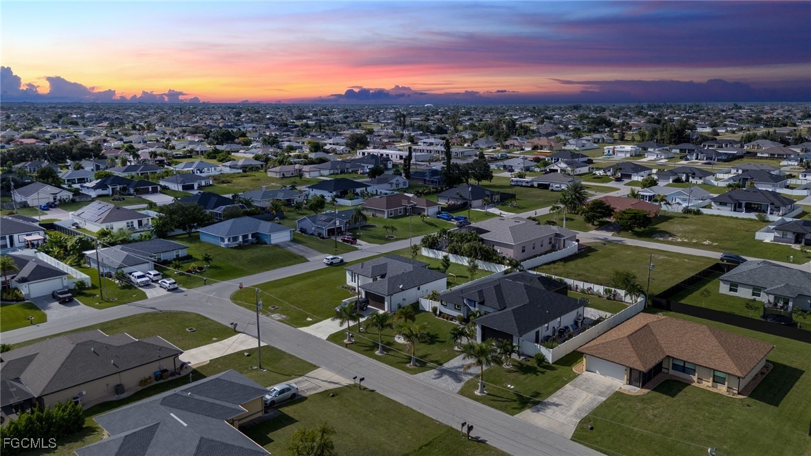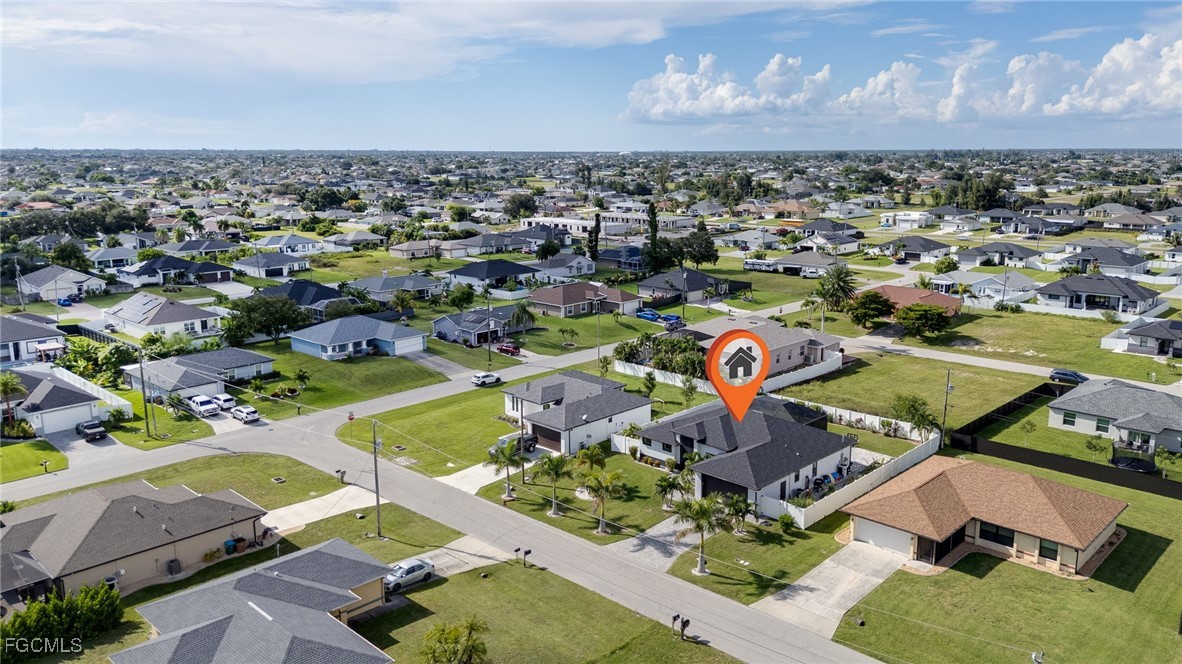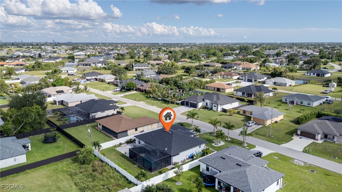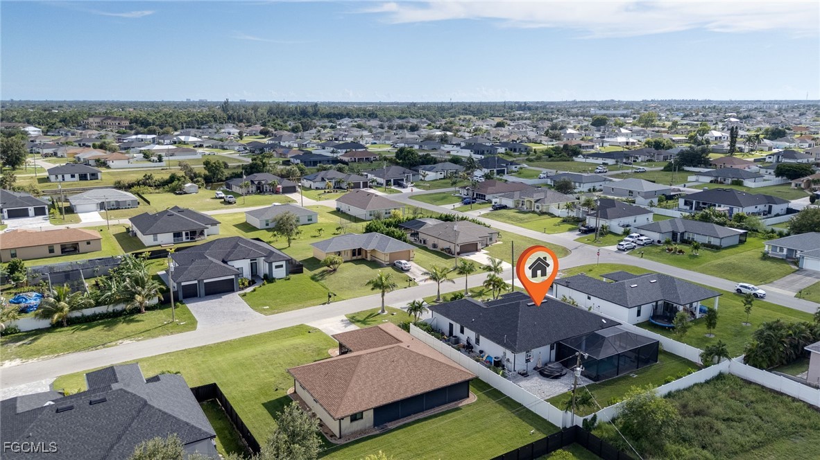 Flood Zone X means you save on insurance! City water and sewer ASSESSMENTS ARE FULLY PAID on this 2022 Cape Coral home, giving you instant savings and peace of mind (approximately 20-30k in savings)! With 3 bedrooms plus a den, 2 bathrooms, and 1,870 square feet of living space, this property is designed for the ultimate Southwest Florida lifestyle—blending modern finishes, thoughtful upgrades, and outdoor living that feels like your own private resort. The heart of the home is the open-concept kitchen featuring quartz countertops, a striking waterfall island, STAINLESS STEEL APPLIANCES, and a walk-in pantry for all your storage needs. Oversized tile floors flow throughout the home, while both bathrooms showcase elegant walk-in glass showers. The master suite is a true retreat with two walk-in closets complete with built-ins for organization and a spa-like bath with dual sinks. A private laundry room inside the residence adds everyday convenience. Plantation shutter window treatments can be found within the home. Hidden USB ports make charging easy! Step outside to experience what makes this home stand out! A sparkling POOL with a brand-new, concrete-reinforced SCREEN ENCLOSURE invites you to relax or host unforgettable gatherings. The lanai comes equipped with a built-in kitchenette, an outdoor shower, and direct access to a pool bath—perfect for entertaining friends and family. The fully fenced backyard is a tropical paradise with lush landscaping, nine fruit plants and trees, and outdoor lighting that transforms the space into a magical evening escape. Enjoy your paver patio addition for cookouts, while still having ample side yard space for boat parking. Additional features include IMPACT WINDOWS & DOORS for storm protection and potential insurance savings, a paver driveway, and patio extension. The pool heater and Halo water treatment system are negotiable, giving you even more flexibility to make this home your own! Unlike many new construction homes, this one is move-in ready and already includes everything you want—established landscaping, a fenced yard, mature fruit trees, upgraded outdoor living spaces, and fully paid assessments! You won’t have to wait or spend extra to enjoy the Florida dream—it’s all here and ready now. Located just minutes from Pine Island Road, Santa Barbara Boulevard, Sam’s Club, Sun Splash Waterpark, multiple schools, shopping, grocery stores, dining, and entertainment, this home offers the perfect balance of convenience and lifestyle. Don’t miss the opportunity to own a better-than-new Cape Coral retreat built for enjoying everything Southwest Florida has to offer!
