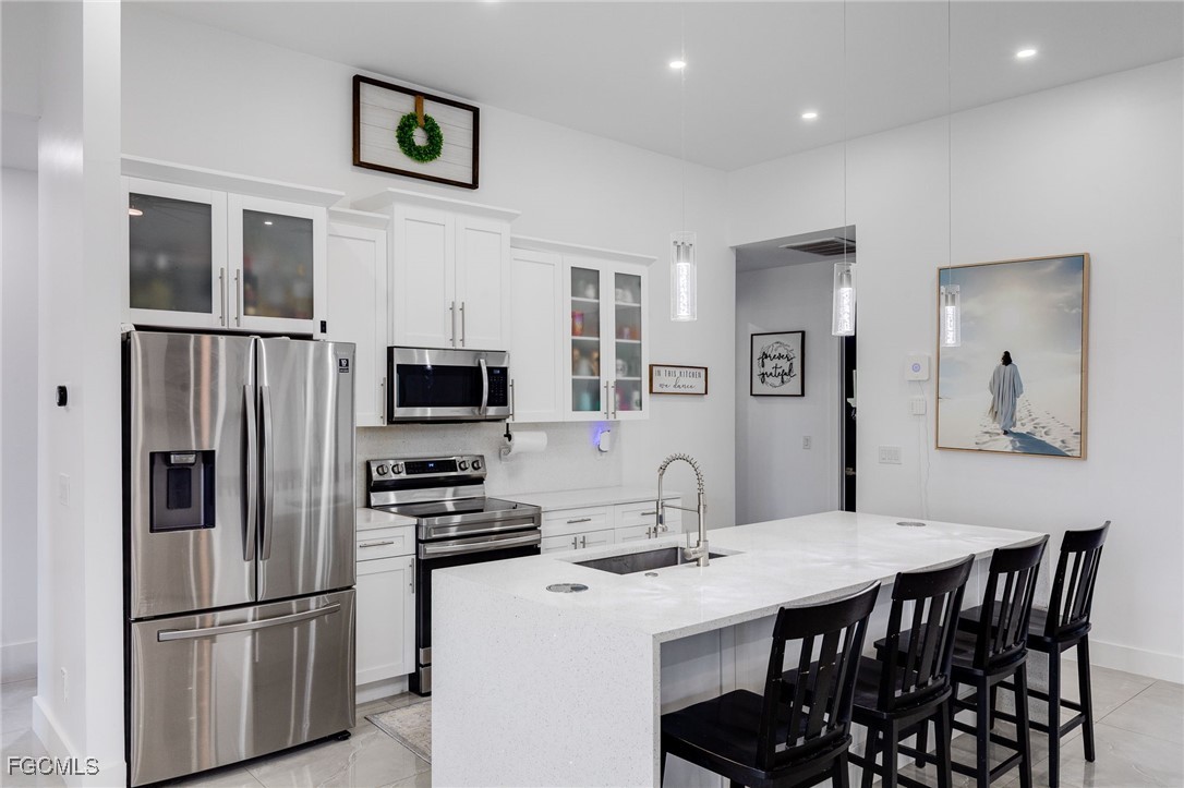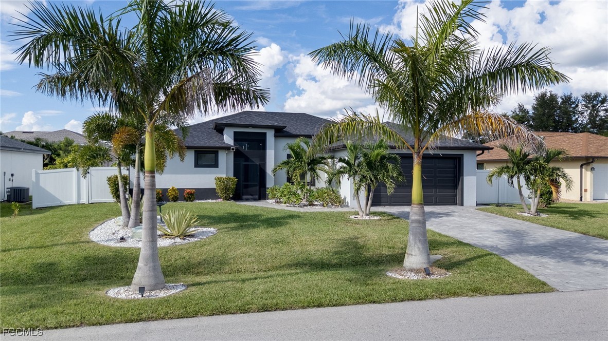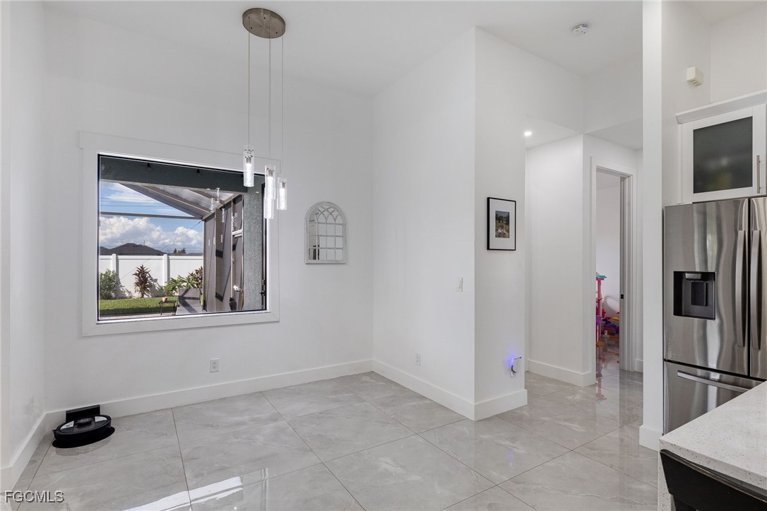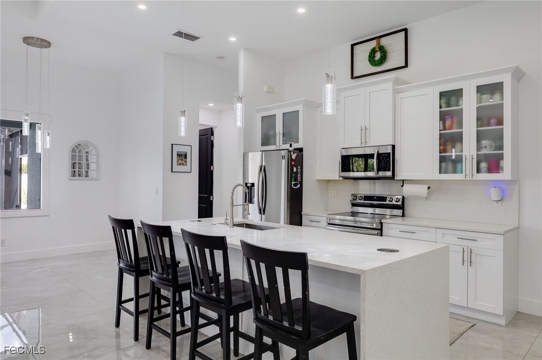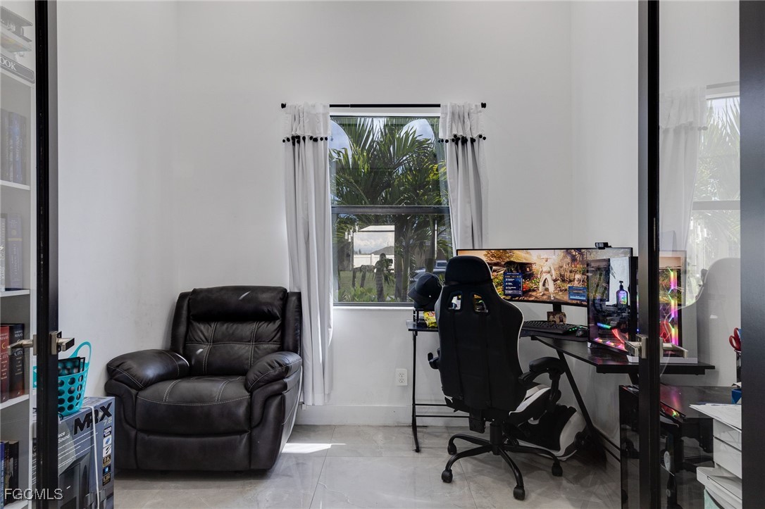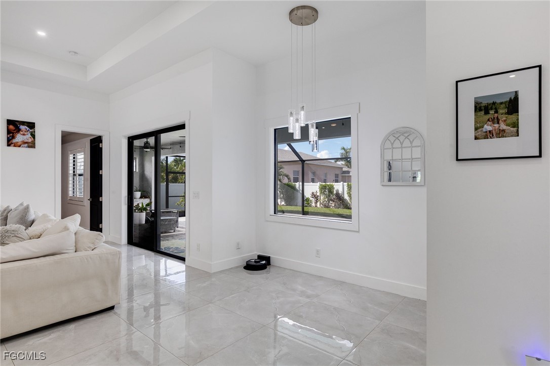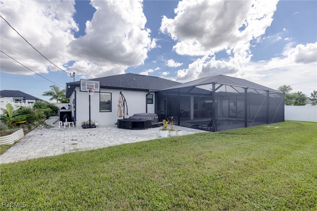 Flood Zone X means you save on insurance! City water and sewer ASSESSMENTS ARE FULLY PAID on this 2022 Cape Coral home, giving you instant savings and peace of mind (approximately 20-30k in savings)! With 3 bedrooms plus a den, 2 bathrooms, and 1,870 square feet of living space, this property is designed for the ultimate Southwest Florida lifestyle—blending modern finishes, thoughtful upgrades, and outdoor living that feels like your own private resort. The heart of the home is the open-concept kitchen featuring quartz countertops, a striking waterfall island, STAINLESS STEEL APPLIANCES, and a walk-in pantry for all your storage needs. Oversized tile floors flow throughout the home, while both bathrooms showcase elegant walk-in glass showers. The master suite is a true retreat with two walk-in closets complete with built-ins for organization and a spa-like bath with dual sinks. A private laundry room inside the residence adds everyday convenience. Plantation shutter window treatments can be found within the home. Hidden USB ports make charging easy! Step outside to experience what makes this home stand out! A sparkling POOL with a brand-new, concrete-reinforced SCREEN ENCLOSURE invites you to relax or host unforgettable gatherings. The lanai comes equipped with a built-in kitchenette, an outdoor shower, and direct access to a pool bath—perfect for entertaining friends and family. The fully fenced backyard is a tropical paradise with lush landscaping, nine fruit plants and trees, and outdoor lighting that transforms the space into a magical evening escape. Enjoy your paver patio addition for cookouts, while still having ample side yard space for boat parking. Additional features include IMPACT WINDOWS & DOORS for storm protection and potential insurance savings, a paver driveway, and patio extension. The pool heater and Halo water treatment system are negotiable, giving you even more flexibility to make this home your own! Unlike many new construction homes, this one is move-in ready and already includes everything you want—established landscaping, a fenced yard, mature fruit trees, upgraded outdoor living spaces, and fully paid assessments! You won’t have to wait or spend extra to enjoy the Florida dream—it’s all here and ready now. Located just minutes from Pine Island Road, Santa Barbara Boulevard, Sam’s Club, Sun Splash Waterpark, multiple schools, shopping, grocery stores, dining, and entertainment, this home offers the perfect balance of convenience and lifestyle. Don’t miss the opportunity to own a better-than-new Cape Coral retreat built for enjoying everything Southwest Florida has to offer!