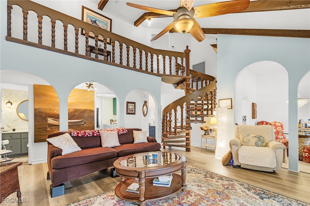 Inside, the living room impresses with soaring vaulted ceilings and a stunning spiral staircase leading to two guest bedrooms. Both feature walk-in closets, new laminate flooring, plus a large Jack-and-Jill bathroom for added convenience. The ground-floor primary suite is a true retreat, complete with a private bath, huge walk-in closet, and serene sunrise views.