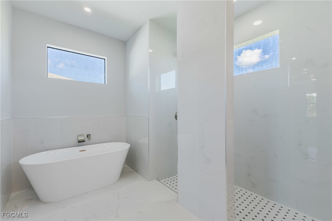 The den, complete with double glass doors, provides the flexibility for a home office, hobby room, or extra bedroom. The split floor plan ensures privacy, with the primary suite offering two large walk-in closets and a spa-like bath featuring a freestanding tub, walk-through shower with dual shower heads, and quartz double vanity. Two additional bedrooms share a beautifully appointed bath on the opposite side of the home.