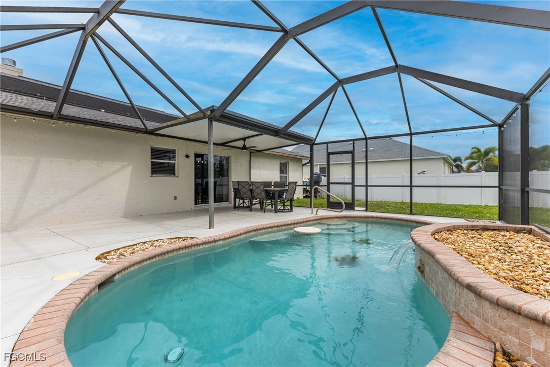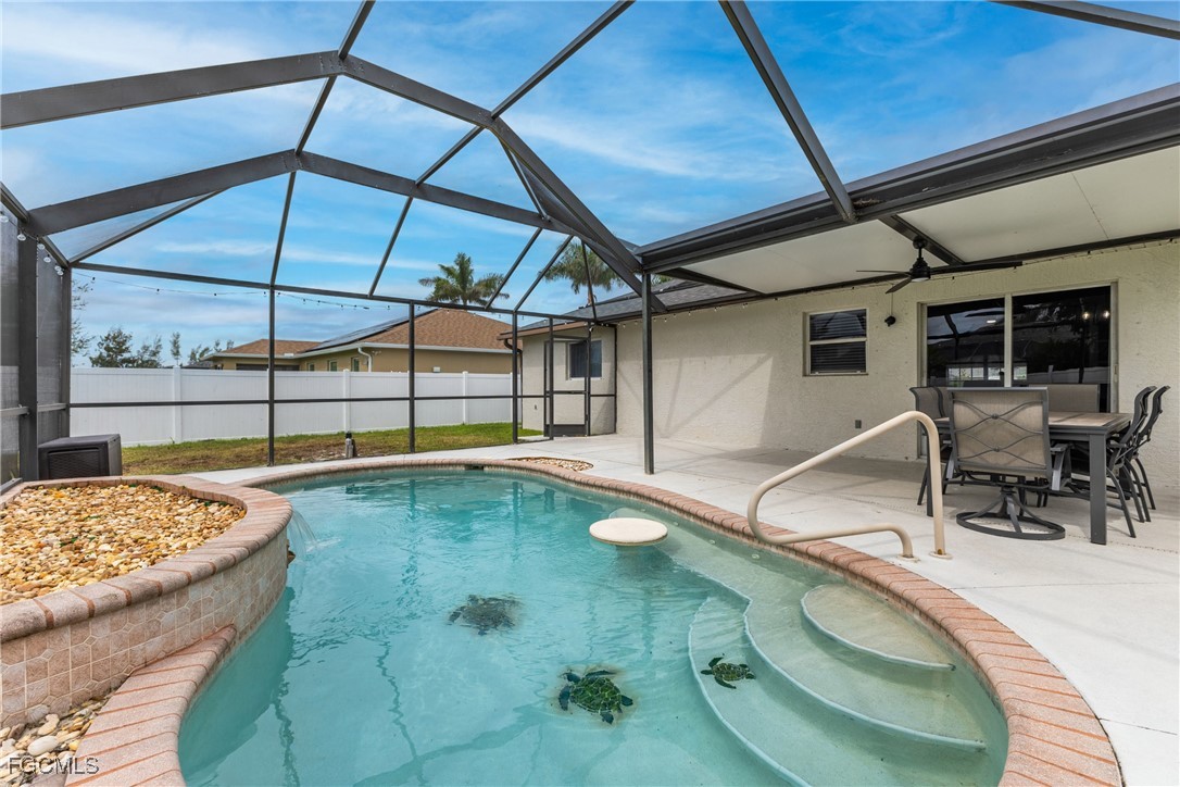 Welcome to 1910 NW 14th Ter, a beautiful pool home tucked away in a peaceful part of NW Cape Coral. This 3-bedroom, 2-bathroom home with an enclosed den offers both comfort and style, with thoughtful updates throughout. Step inside and you’ll notice custom built-in cabinets and a stylish accent wall that adds personality to the living space. The enclosed den includes access to a bathroom, making it perfect as a home office, playroom, or guest room. The home features an open floor plan that makes it easy to move between the kitchen, dining, and living areas, ideal for both everyday living and entertaining. A newer roof, just four years old, adds long-term value and peace of mind. Step outside to your own private oasis—a screened-in lanai with a heated pool that’s perfect for year-round swimming and relaxing. The fenced backyard offers space for pets, play, or simply enjoying the Florida sunshine. The 2-car garage provides room for parking and storage. Nestled in the quiet NW Cape, you're still close to shopping, dining, and all the fun that Cape Coral has to offer. This home is move-in ready and full of charm, offering a perfect mix of updates, comfort, and location. Come see it and fall in love with everything it has to offer.