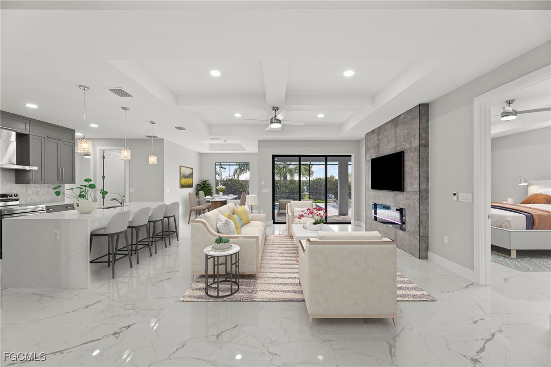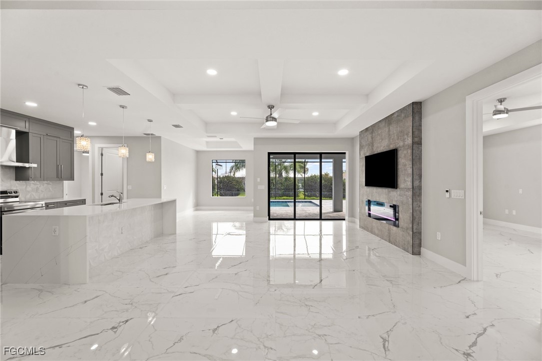 This NEW CONSTRUCTION home features 3 Bedrooms, 2 full bathrooms, a 2-car garage and 2,000 sq. ft. of living space – the primary bedroom has two large walk-in closets along with dual sinks, a freestanding tub with an elegant backsplash and a creative shower layout directly behind. There is a full-size pool bath with a standup shower and beautiful tile. The living room has 10ft coffered ceilings along with a custom built in TV enclosure with tile from top to bottom including an electric fireplace and a 70-inch smart TV (The enclosure can accommodate larger sizes). The entryway has 14ft cascading ceilings along with three large windows to offer plenty of natural light throughout the day.