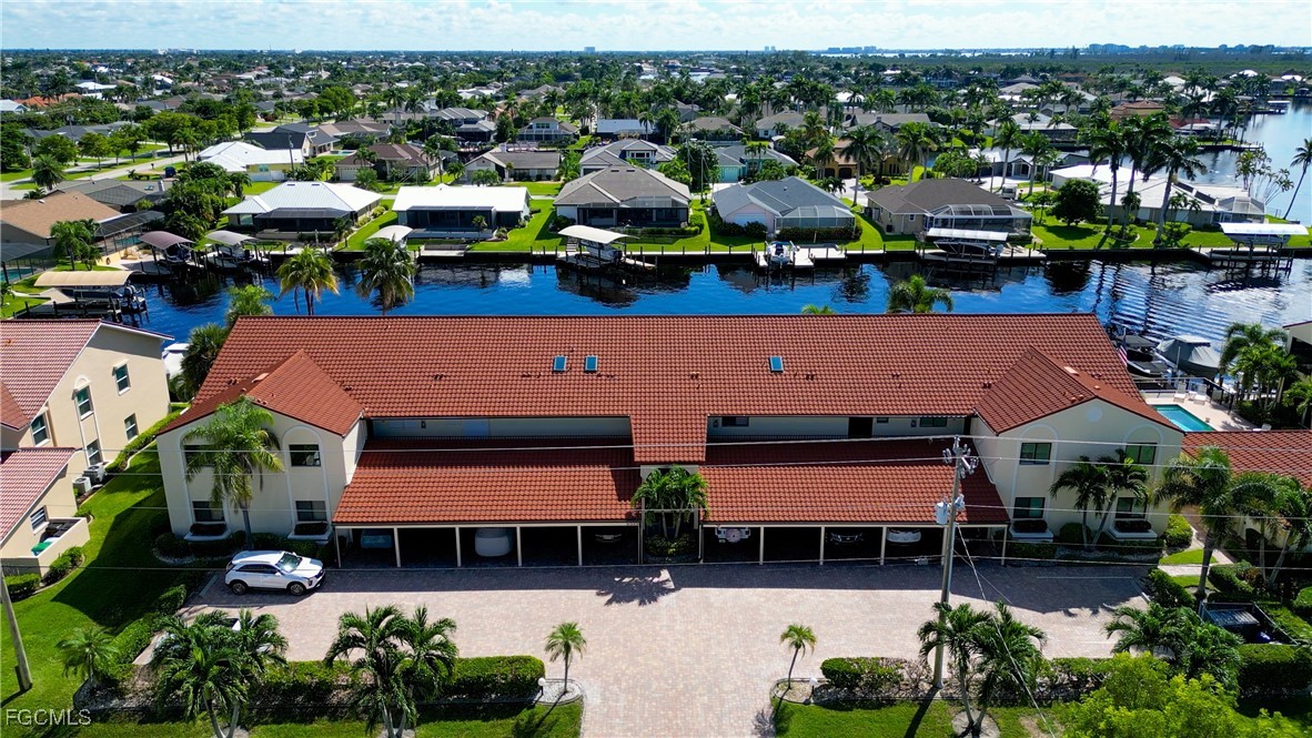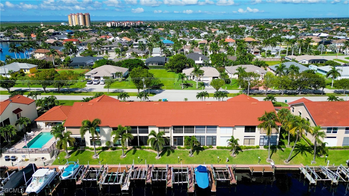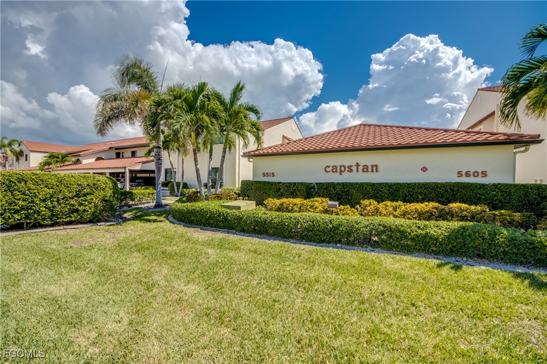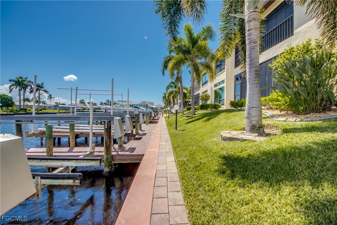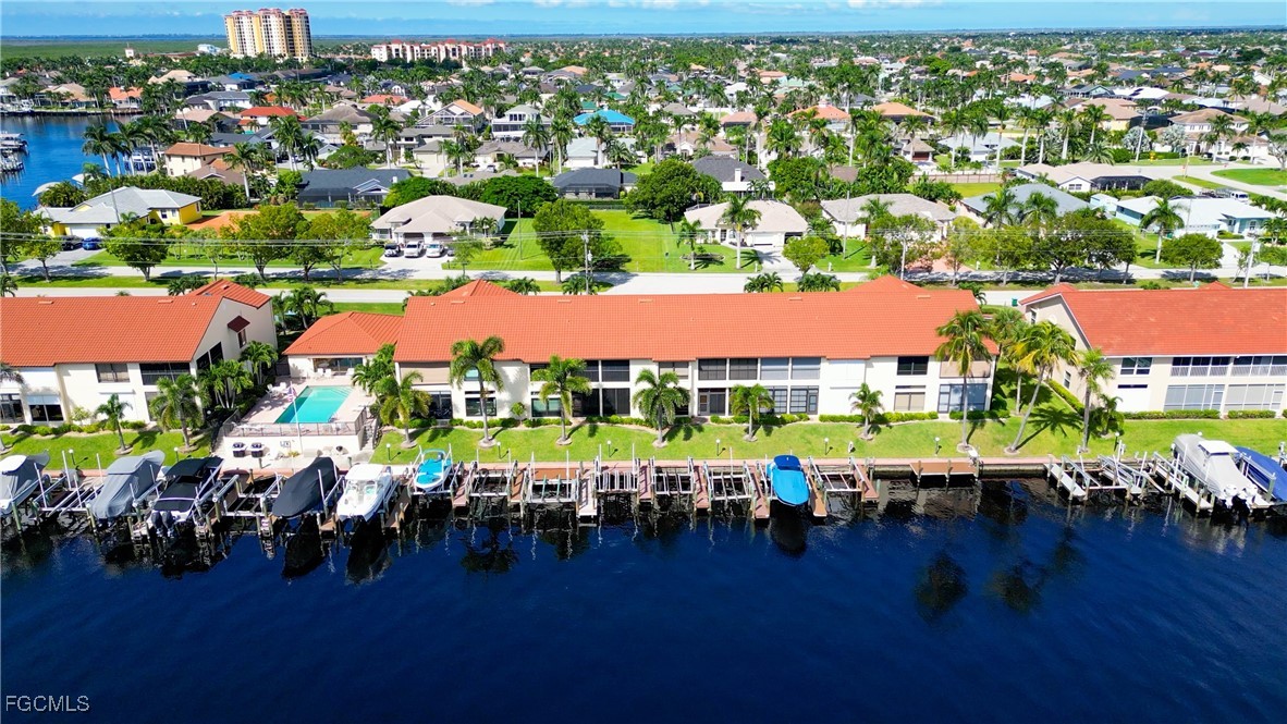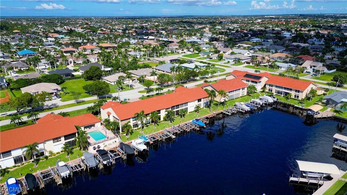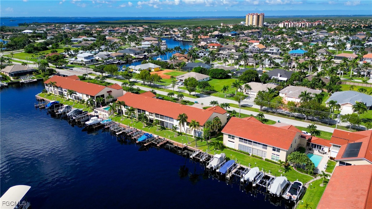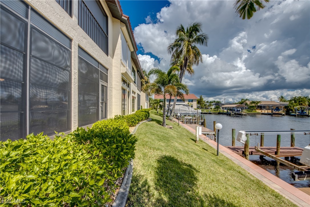 From dawn to dusk, THIS WATERFRONT living carries a TIMELESS CALM—mornings begin with sunrises and coffee on the lanai, afternoons drift by with a book you can’t put down, and evenings bring a cocktail before a leisurely cruise to dinner by boat. Life at Capstan Condos is all about the waterfront lifestyle on a stunning 200’ WIDE CANAL. Open the door to this spacious two-bedroom, two-bath retreat with covered parking and you’ll immediately notice what sets it apart. Soaring VOLUME CEILINGS and oversized windows flood the home with golden light, creating an airy, welcoming atmosphere that feels both grand and inviting. This isn’t your typical condo—it was BUILT AHEADS OF ITS TIME, with a UNIQUE DESIGN that makes the kitchen the heart of the home while still giving privacy to both the guest suite and the master retreat. The kitchen is tastefully designed with 36” wood cabinets accented by glass doors, crown and rope molding, soft close pull out drawers, granite counters, backsplash and pantry. Entertain with ease as the pass-through opens to the lanai, so you never miss the conversation—or the view. The greatroom flows effortlessly to the oversized lanai, where pocketing sliders dissolve the boundary between indoors and out. The master suite is a peaceful retreat on the water, complete with walk-in closet and a spacious bath featuring dual granite vanities with soft-close features. Guests enjoy their own private space on the opposite side of the home, ensuring comfort and privacy. This condo comes with its own ASSIGNED BOAT DOCK AND 6K LB LIFT (and new dock boards) perched on the 200’ wide Bronco Canal just around the corner from TARPON POINT and CAPE HARBOR. With only one bridge out, you’ll be enjoying the Gulf of America in no time at all. Imagine days spent cruising to Sanibel and Captiva, stopping for lunch at waterfront restaurants, fishing off your dock or simply enjoying the sight of dolphins and manatee playing in your backyard. Dinner by boat isn’t just possible—it’s YOUR NEW NORMAL. Peace of mind comes standard here!. The building has a BRAND-NEW ROOF, storm-ready doors and windows with a mix of ELECTRIC AND MANUAL ROLL DOWN SHUTTERS. NO water intrusion with any storm. Flood insurance won’t keep you up at night, with a TRANSFERABLE POLICY at just $734/year (subject to insurance co. approval). Capstan is a 55+ community known for its BEAUTIFULLY MAINTAINED GROUNDS AND WELCOMING ATMOSPHERE. Residents enjoy a heated saltwater pool, clubhouse, BBQ area, fish cleaning station, exterior storage, covered carports and pavered parking lot. Tucked among million-dollar waterfront homes, the location is as desirable as it is convenient—close to shopping, dining, marinas and just minutes out to the Caloosahatchee River & beyond. This isn’t just a condo, it’s your well-earned escape—sun-drenched mornings, barefoot boating afternoons and evenings where neighbors become friends and every sunrise feels like a celebration. SUNRISE TO SUNSET, PURE PARADISE!