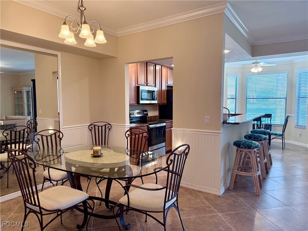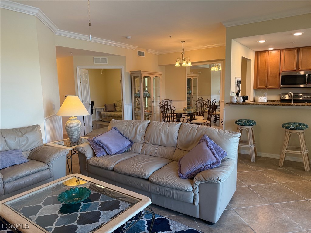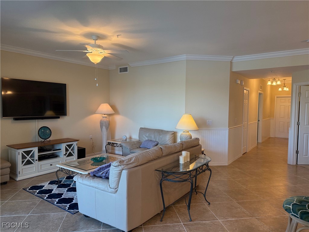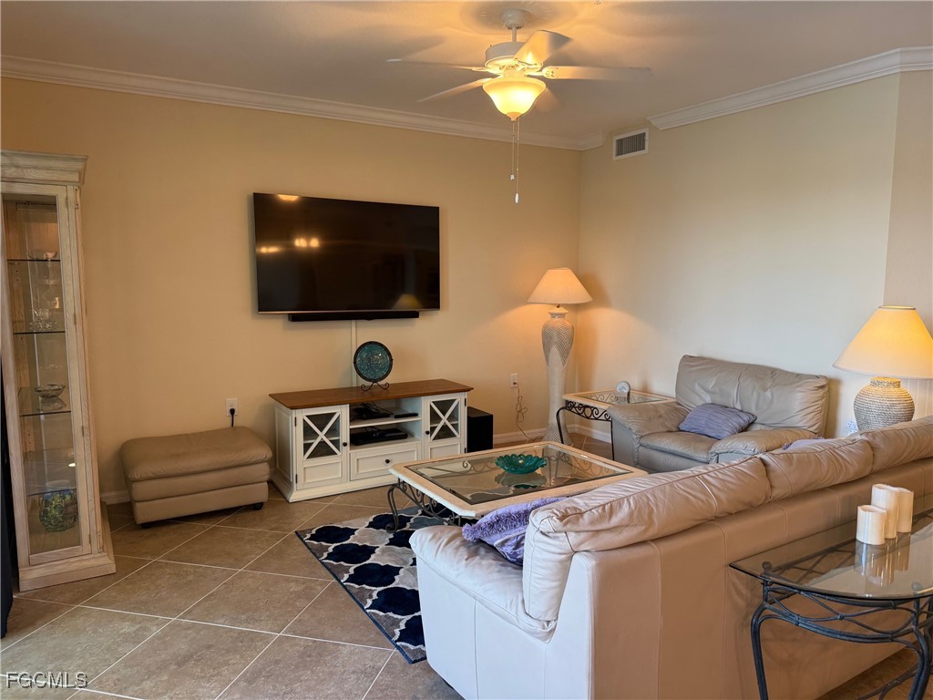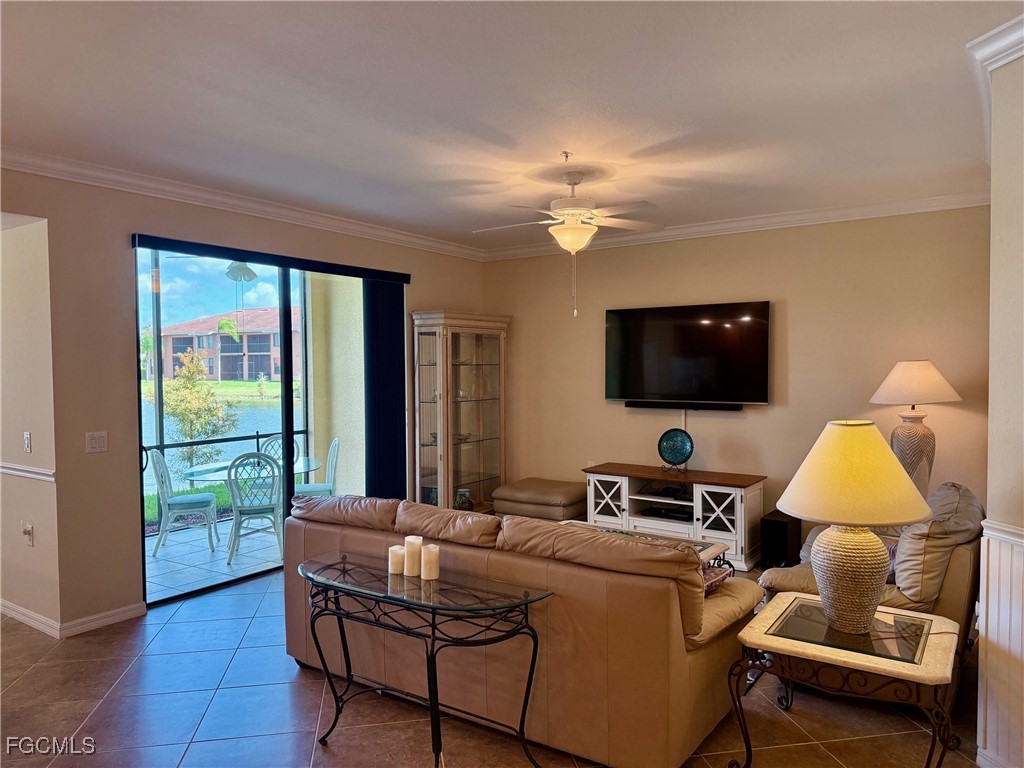 Beautiful 1st floor condo nestled in a quiet gated community with an incredible lake view! This comfortable 2 bedroom plus den unit is in an ideal location within the community featuring a quiet setting with a premium lake view. The kitchen boasts granite countertops, plenty of cabinet space, a breakfast bar, eat-in kitchen, plus dining area perfect for entertaining. Condo has been meticulously maintained, including beautiful accent trim, crown molding, and ceiling fans throughout. Enjoy gorgeous water views in the main living area from every vantage point plus the fountain is lit in the evenings for a resort feel from the privacy of your private patio. Bedrooms are located in the front of the condo near the second screened patio setting for an additional large private outdoor space. Enjoy time with neighbors in the community clubhouse, exercise room, or pool and spa. Conveniently located to shopping, restaurants, schools, parks, with easy access to beaches, and Sanibel. Water is included with low HOA fees! Don't miss this rare upscale condo with garage with everything needed to start enjoying right away.