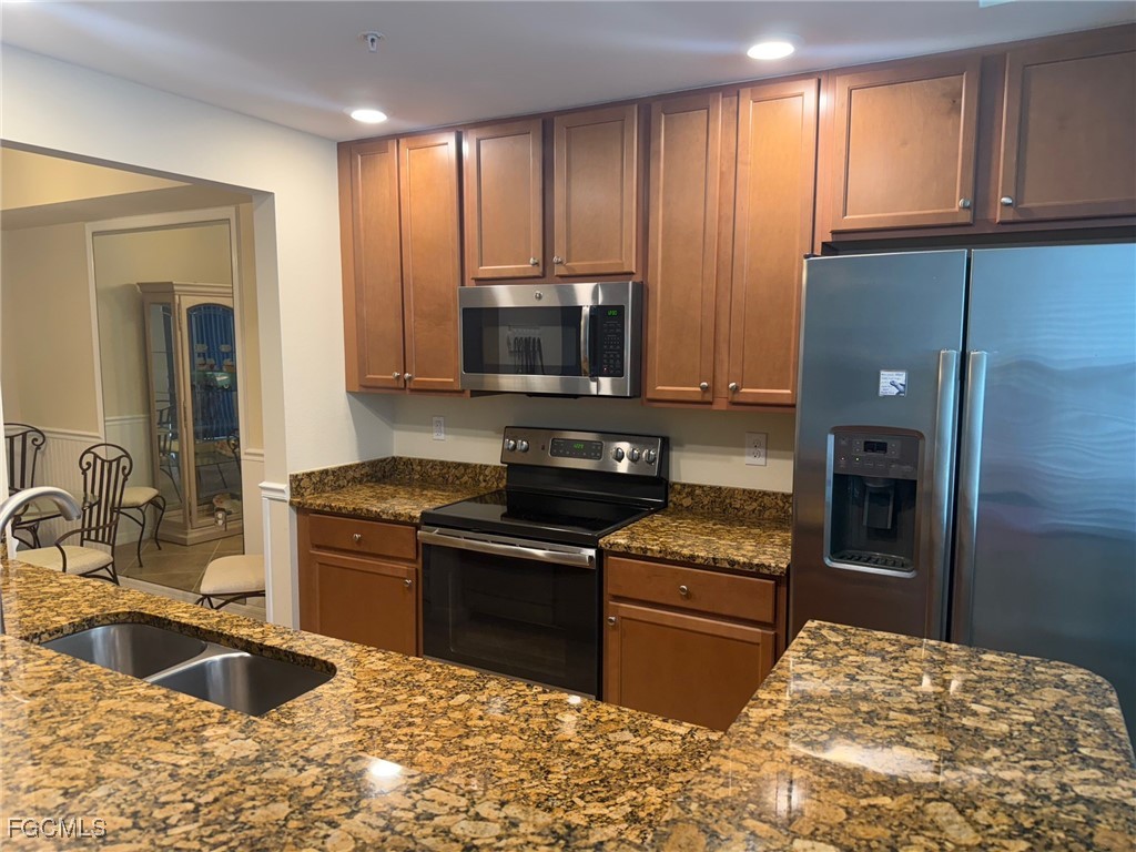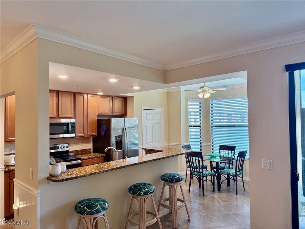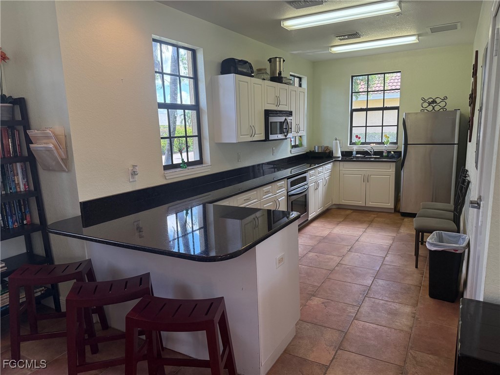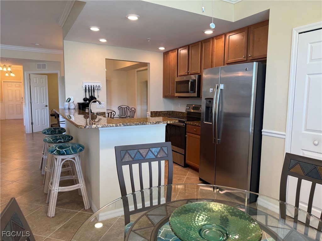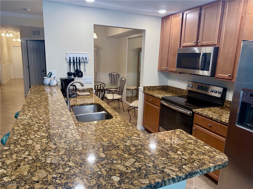 Beautiful 1st floor condo nestled in a quiet gated community with an incredible lake view! This comfortable 2 bedroom plus den unit is in an ideal location within the community featuring a quiet setting with a premium lake view. The kitchen boasts granite countertops, plenty of cabinet space, a breakfast bar, eat-in kitchen, plus dining area perfect for entertaining. Condo has been meticulously maintained, including beautiful accent trim, crown molding, and ceiling fans throughout. Enjoy gorgeous water views in the main living area from every vantage point plus the fountain is lit in the evenings for a resort feel from the privacy of your private patio. Bedrooms are located in the front of the condo near the second screened patio setting for an additional large private outdoor space. Enjoy time with neighbors in the community clubhouse, exercise room, or pool and spa. Conveniently located to shopping, restaurants, schools, parks, with easy access to beaches, and Sanibel. Water is included with low HOA fees! Don't miss this rare upscale condo with garage with everything needed to start enjoying right away.