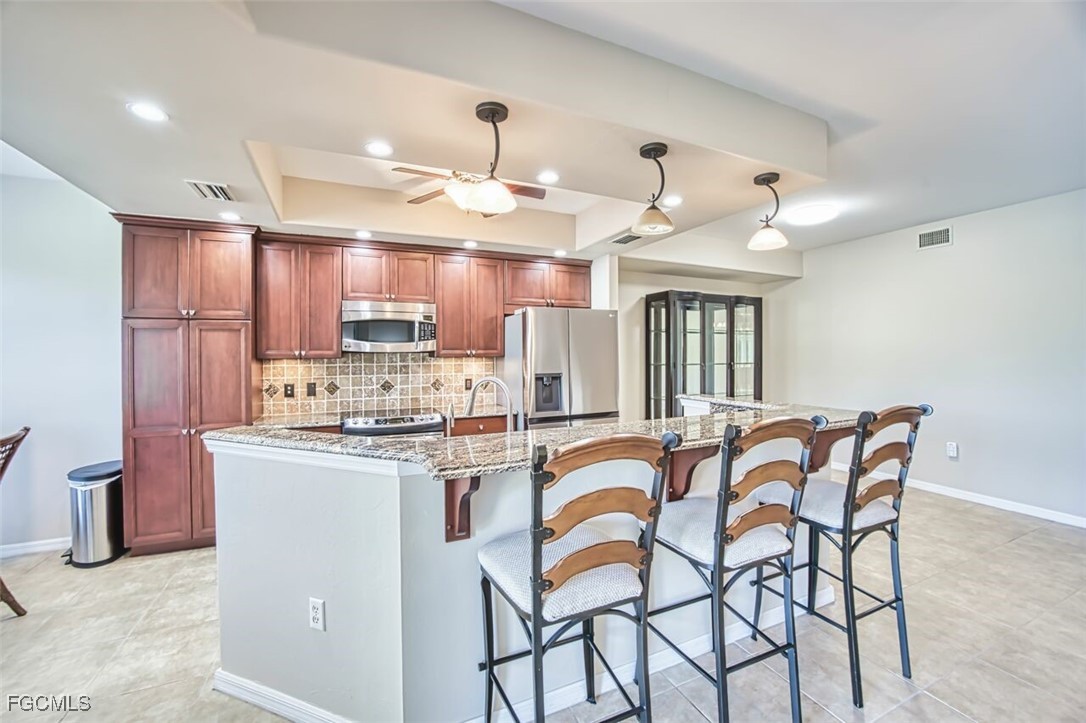 Welcome to your dream condo in the prestigious Colonial Country Club! NO FLOOD INSURANCE REQUIRED! This stunning unit boasts 3 bedrooms, 2 bathrooms, and a 1 car garage, making it the perfect place to call home. The remodeled open concept layout features granite counters, stainless steel appliances, and beautiful water and fountain views that will take your breath away. Enjoy the convenience of having a restaurant and bar right at the clubhouse, as well as access to tennis courts, pickleball, a fitness center, 3 community pools and pay as you play golf. This condo comes partially furnished with an equipped kitchen, allowing you to move in and start enjoying the luxurious lifestyle right away. Relax on the nice screened patio with an electric grill, perfect for entertaining guests or simply enjoying the peaceful surroundings. Colonial Country Club is conveniently located near restaurant, shopping, baseball spring training facilities and RSW airport. Don't miss out on this incredible opportunity to live in one of the most sought-after communities in Fort Myers. Schedule a showing today and make this condo your new oasis!