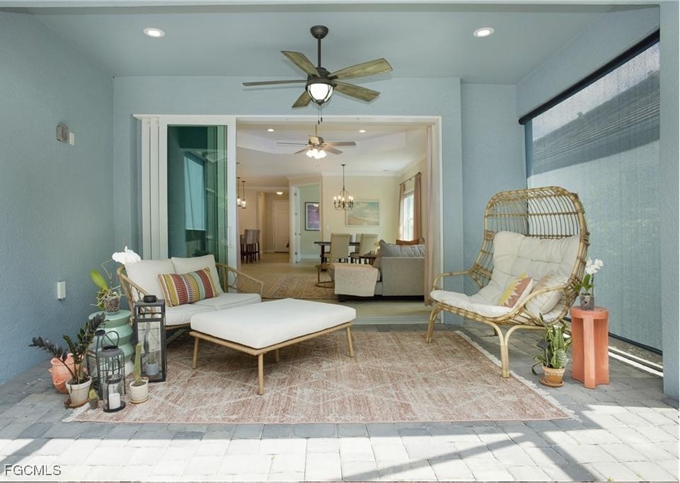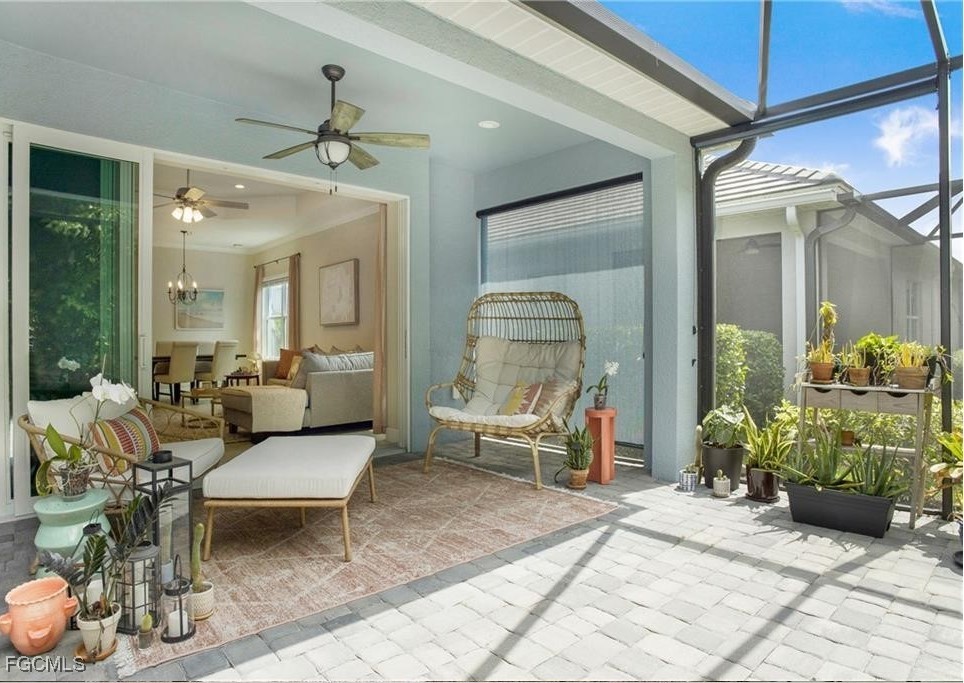 The open-concept design features a bright kitchen and living area, impact-rated windows and doors, and 220V pre-wiring in the kitchen and laundry for future flexibility. Step outside to an extended paver lanai with custom sunscreen shades, the perfect spot for morning coffee or evening entertaining.