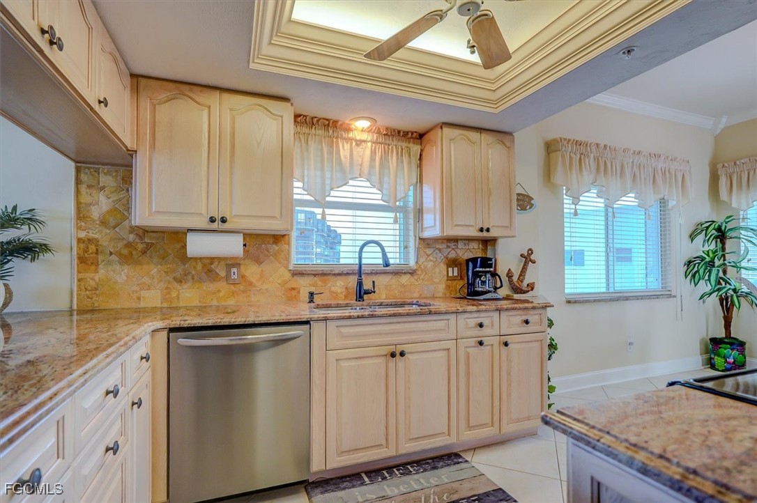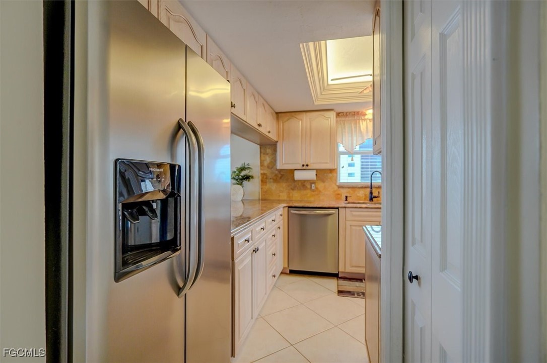 • Kitchen: stainless steel appliances; granite countertops; tiled backsplashews; 2-tier crown lighted tray ceiling; updated cabinetry