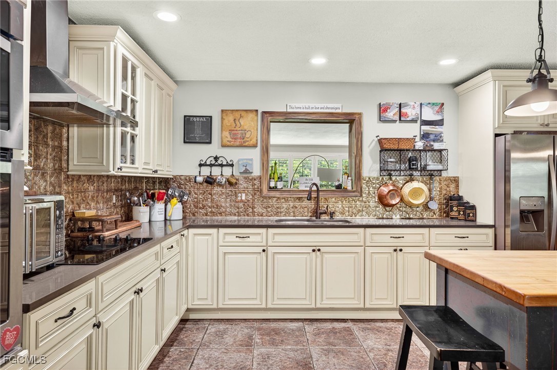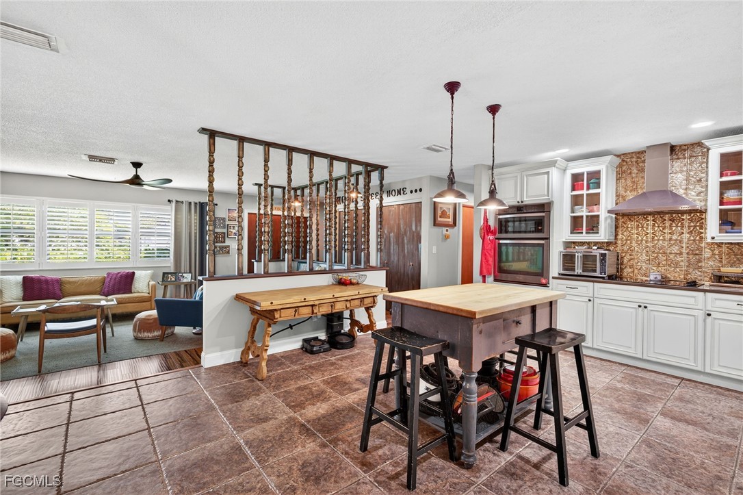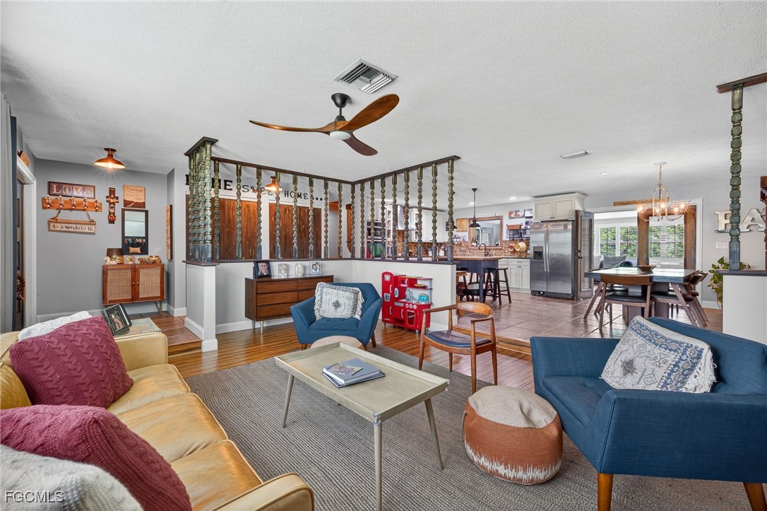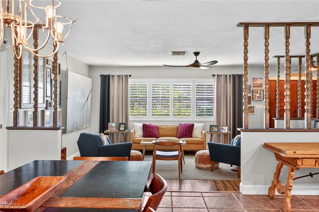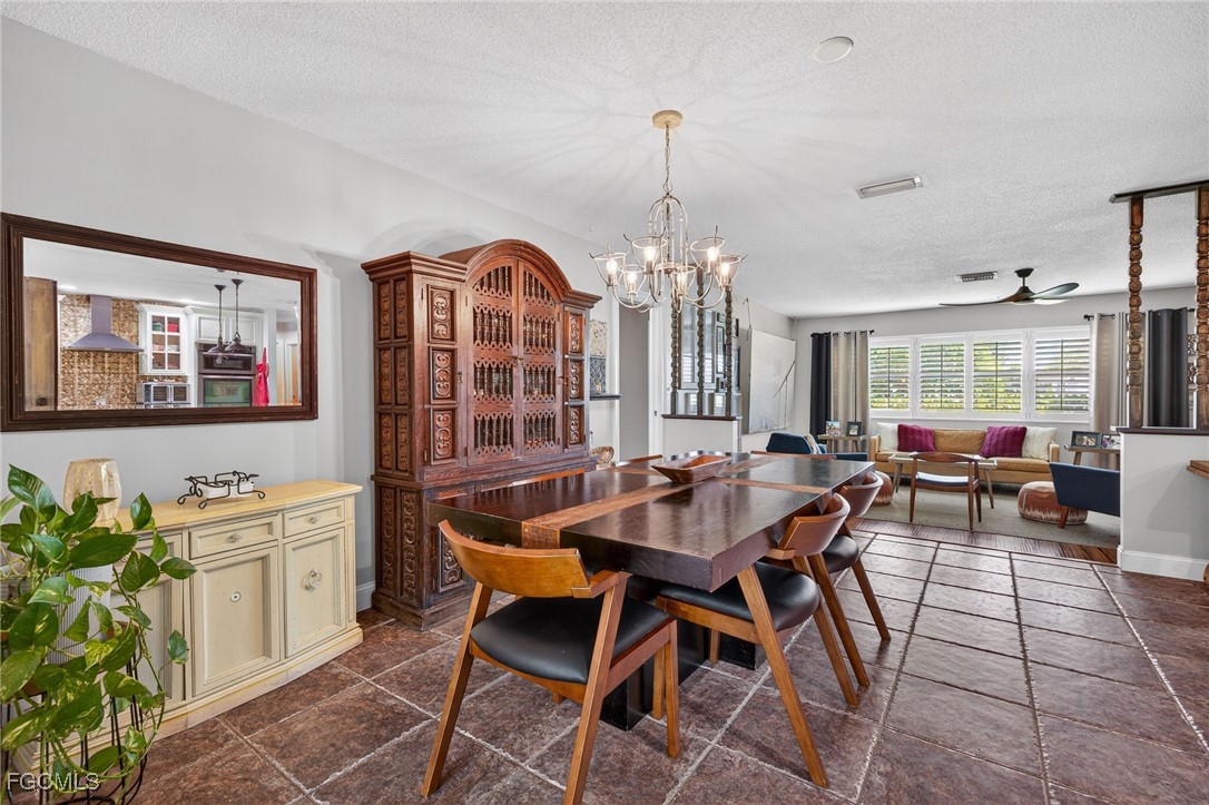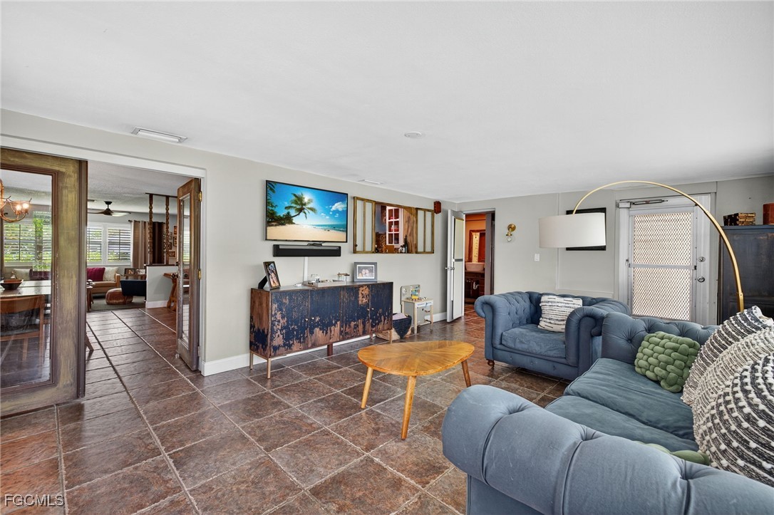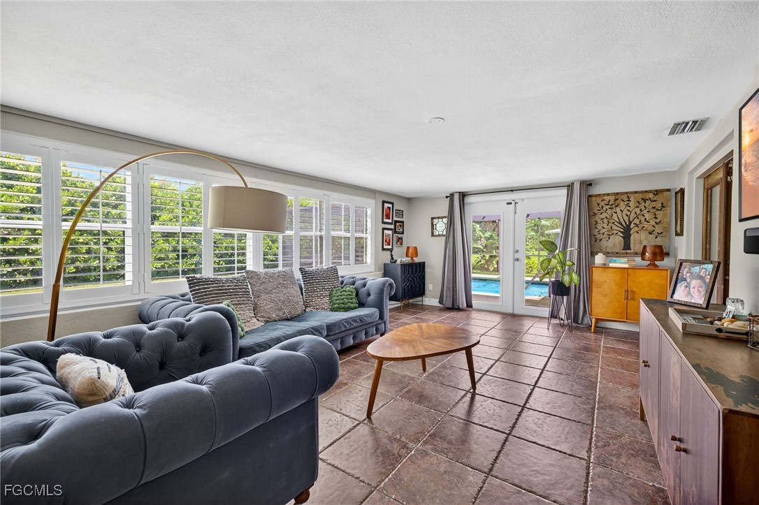 A stunning step-down formal living room showcases the home’s original wood columns, creating a timeless and elegant space. The family room offers seamless access to both the screened pool area and a separate rear patio, ideal for enjoying evening sunsets or outdoor gatherings.