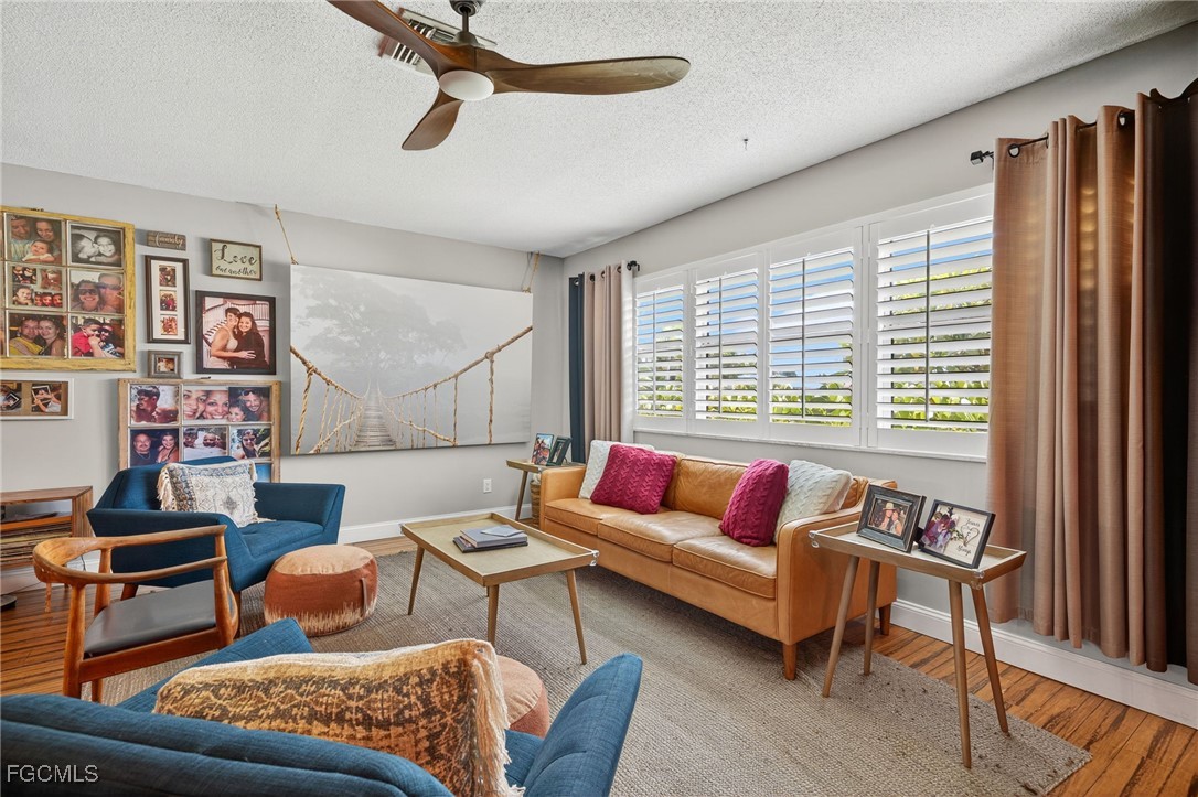 Plantation shutters throughout the home are a stylish and functional upgrade, allowing you to control the abundant natural light that fills the space.