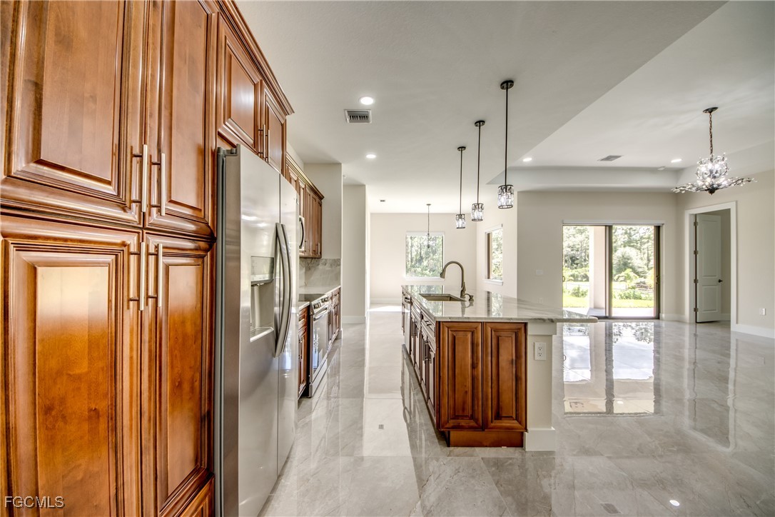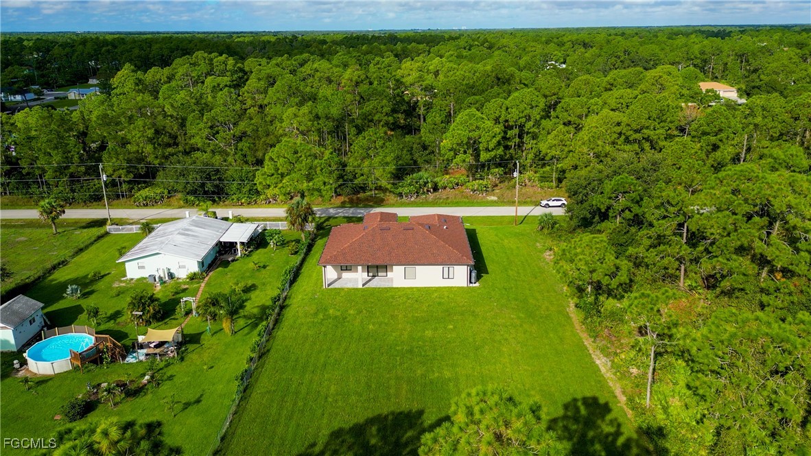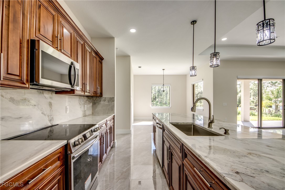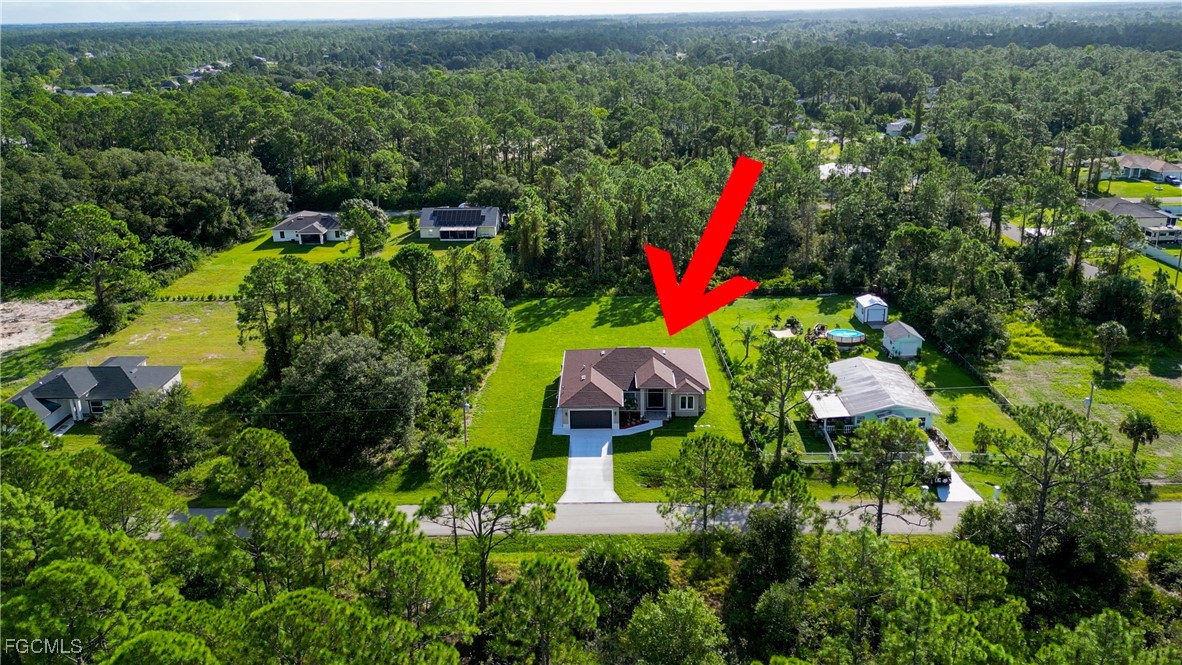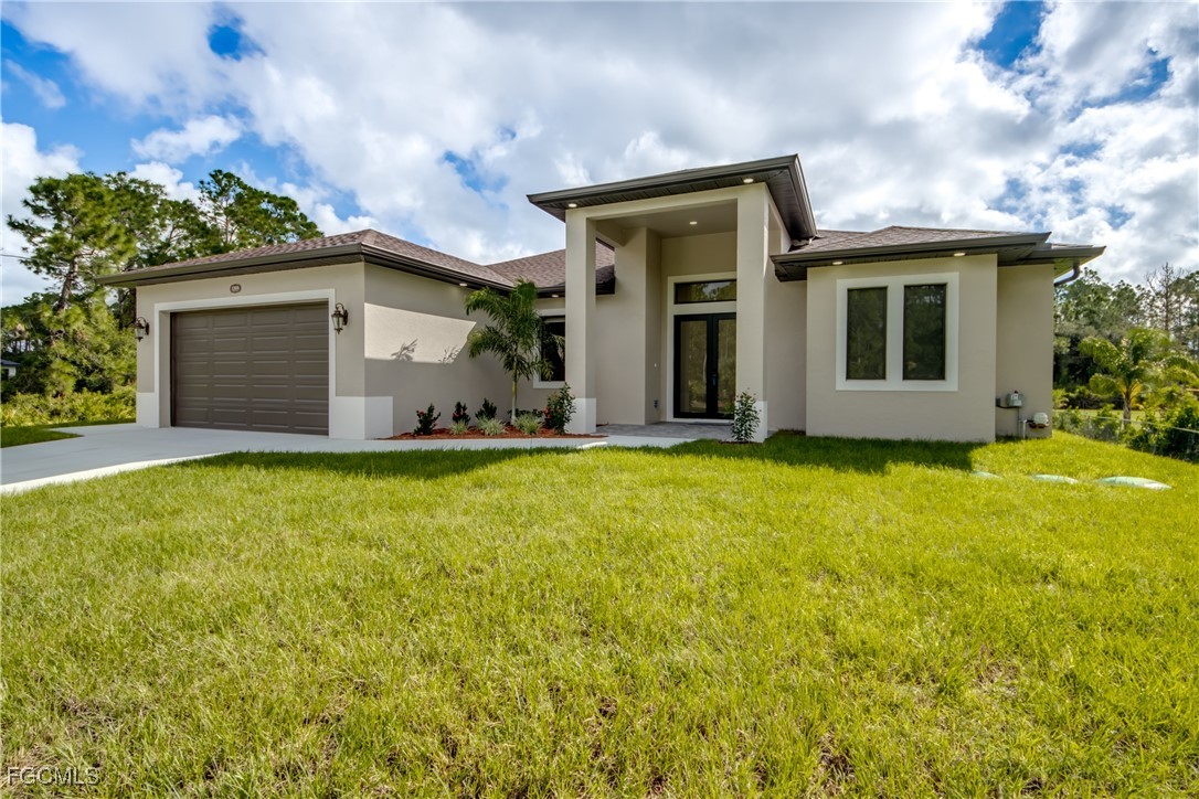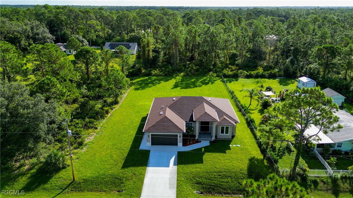 This beautiful new construction boasts over 1900 square feet of living space that offers modern living with an open-concept layout and high end finishes throughout. It offers 3 bedrooms, 2 bathrooms plus a Den, 2 car garage. Situated on a half-acre lot completely cleared and freshly laid with new sod with a sprinkler system. The home's grand entry features a 14-foot ceiling that delivers a striking first impression and 12 foot ceiling throughout the main living area. The heart of the home is a chef-inspired kitchen featuring top-of-the-line appliances (Frigidaire Gallery) custom cabinetry and elegant quartz countertops with full height quartz backsplash. Each room offers generous space, while upgraded built cabinetry in every closet ensures an organized and stylish space. You will be amazed by the beautiful porcelain tile throughout the house. The master bedroom offers his and hers walk-in closets, beautiful shower and an elegant double-sink vanity. Both bathrooms offer glass doors and high quality tile in both showers. The spacious Laundry room with cabinets and a sink comes equipped with brand new GE washer and dryer. Additional features include 8 feet high interior doors, all impact resistant windows and doors, 4 ton high efficiency AC unit with AC returns in all the bedrooms, LED soffit lights, Epoxy flooring in the garage, well insulated including the garage and lanai. The property comes with modern blinds throughout the entire house. This is more than just a home-it's your next chapter. Do not miss this opportunity. Schedule your showing today!
