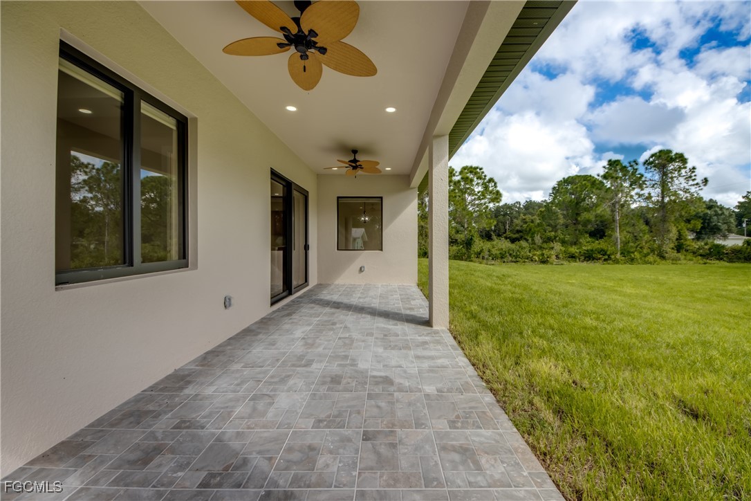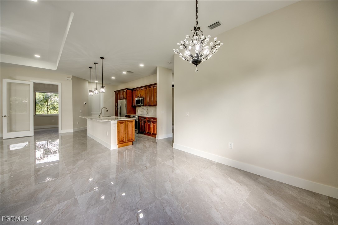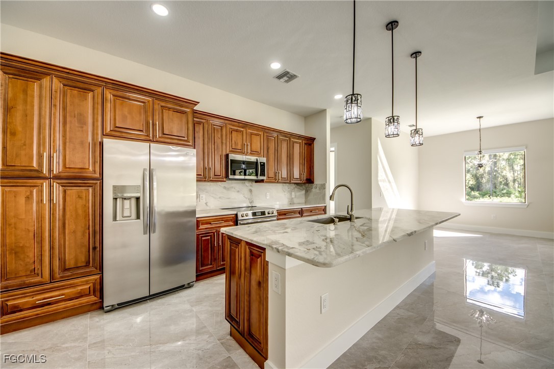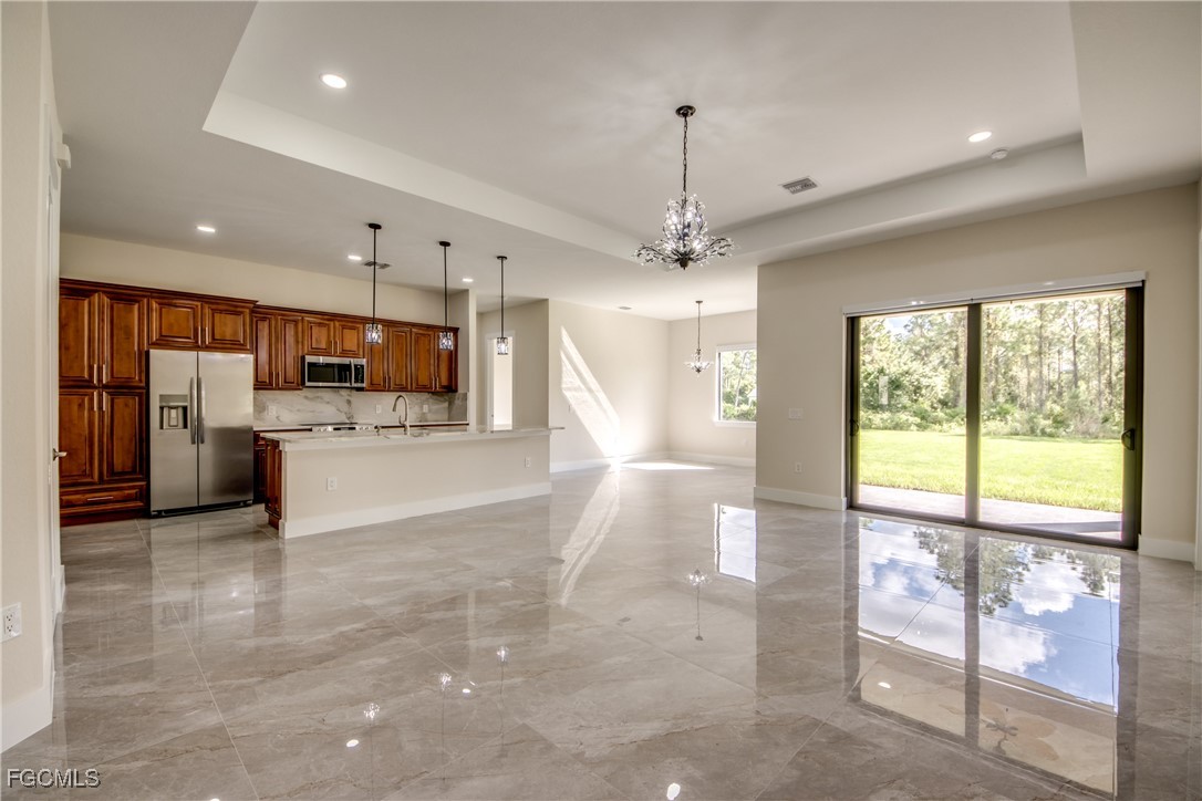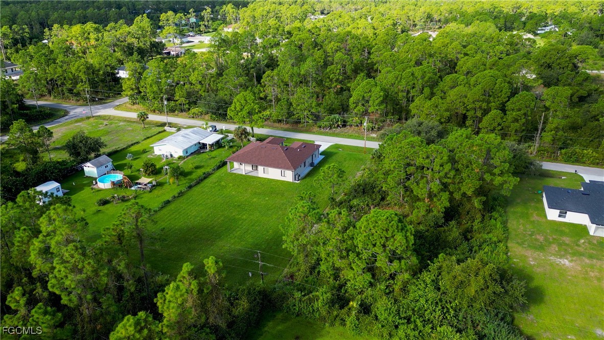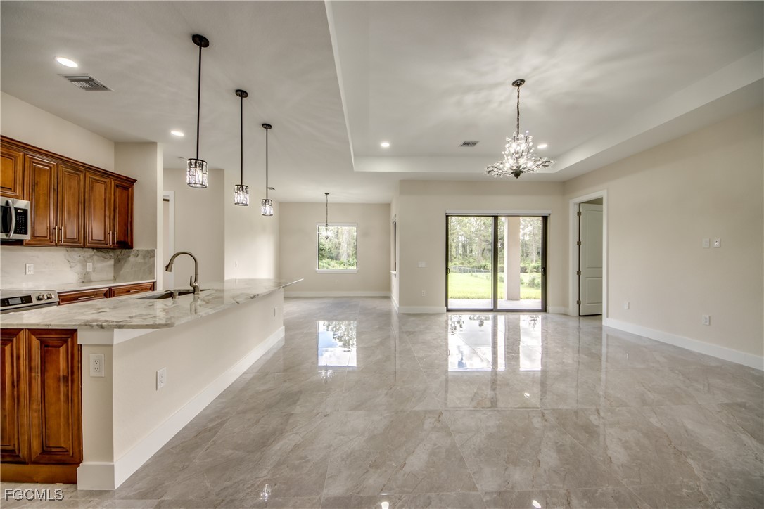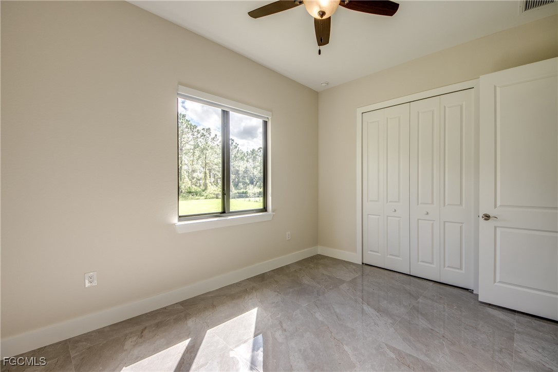 This beautiful new construction boasts over 1900 square feet of living space that offers modern living with an open-concept layout and high end finishes throughout. It offers 3 bedrooms, 2 bathrooms plus a Den, 2 car garage. Situated on a half-acre lot completely cleared and freshly laid with new sod with a sprinkler system. The home's grand entry features a 14-foot ceiling that delivers a striking first impression and 12 foot ceiling throughout the main living area. The heart of the home is a chef-inspired kitchen featuring top-of-the-line appliances (Frigidaire Gallery) custom cabinetry and elegant quartz countertops with full height quartz backsplash. Each room offers generous space, while upgraded built cabinetry in every closet ensures an organized and stylish space. You will be amazed by the beautiful porcelain tile throughout the house. The master bedroom offers his and hers walk-in closets, beautiful shower and an elegant double-sink vanity. Both bathrooms offer glass doors and high quality tile in both showers. The spacious Laundry room with cabinets and a sink comes equipped with brand new GE washer and dryer. Additional features include 8 feet high interior doors, all impact resistant windows and doors, 4 ton high efficiency AC unit with AC returns in all the bedrooms, LED soffit lights, Epoxy flooring in the garage, well insulated including the garage and lanai. The property comes with modern blinds throughout the entire house. This is more than just a home-it's your next chapter. Do not miss this opportunity. Schedule your showing today!
