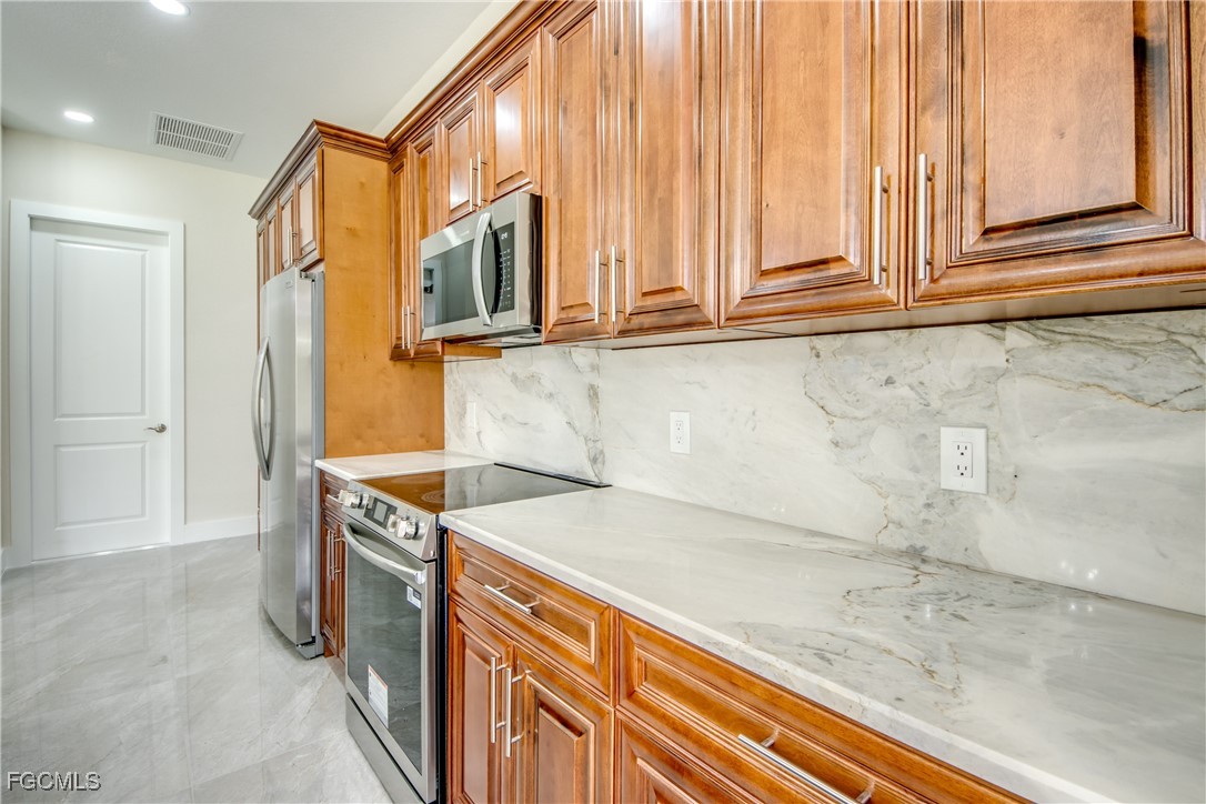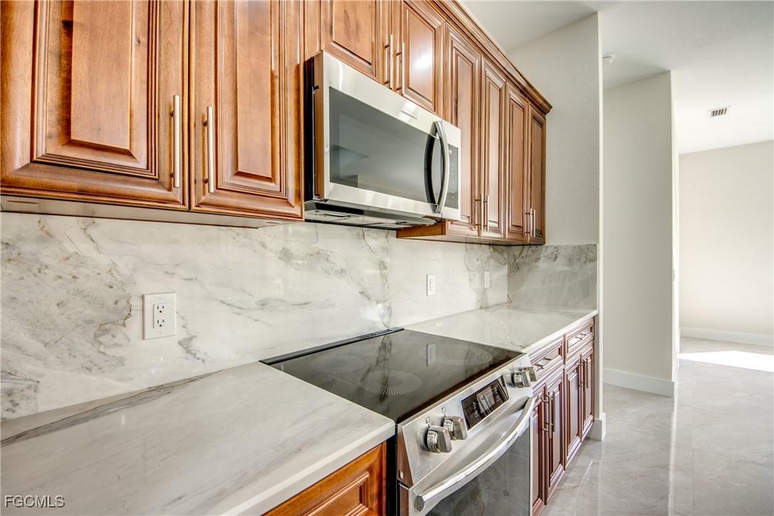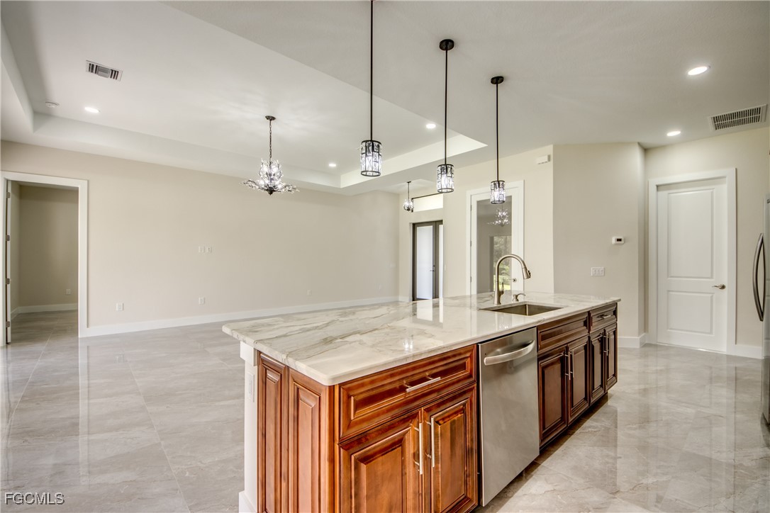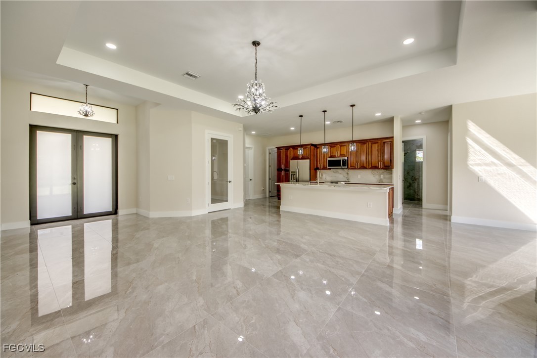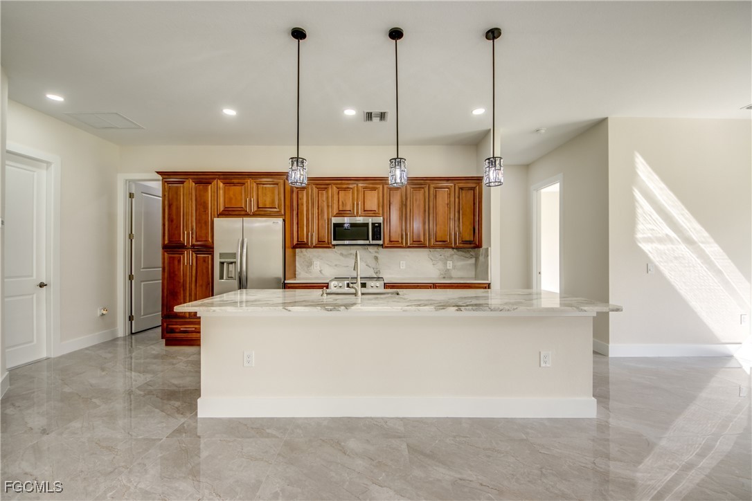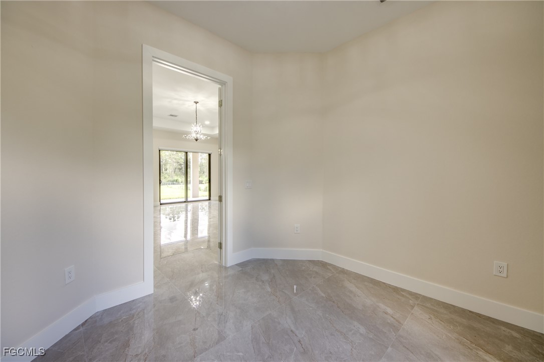 This beautiful new construction boasts over 1900 square feet of living space that offers modern living with an open-concept layout and high end finishes throughout. It offers 3 bedrooms, 2 bathrooms plus a Den, 2 car garage. Situated on a half-acre lot completely cleared and freshly laid with new sod with a sprinkler system. The home's grand entry features a 14-foot ceiling that delivers a striking first impression and 12 foot ceiling throughout the main living area. The heart of the home is a chef-inspired kitchen featuring top-of-the-line appliances (Frigidaire Gallery) custom cabinetry and elegant quartz countertops with full height quartz backsplash. Each room offers generous space, while upgraded built cabinetry in every closet ensures an organized and stylish space. You will be amazed by the beautiful porcelain tile throughout the house. The master bedroom offers his and hers walk-in closets, beautiful shower and an elegant double-sink vanity. Both bathrooms offer glass doors and high quality tile in both showers. The spacious Laundry room with cabinets and a sink comes equipped with brand new GE washer and dryer. Additional features include 8 feet high interior doors, all impact resistant windows and doors, 4 ton high efficiency AC unit with AC returns in all the bedrooms, LED soffit lights, Epoxy flooring in the garage, well insulated including the garage and lanai. The property comes with modern blinds throughout the entire house. This is more than just a home-it's your next chapter. Do not miss this opportunity. Schedule your showing today!
