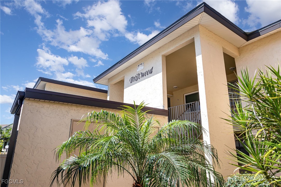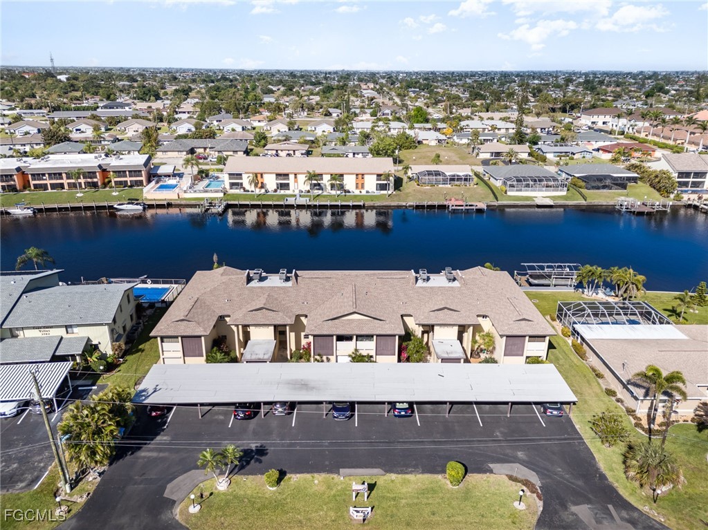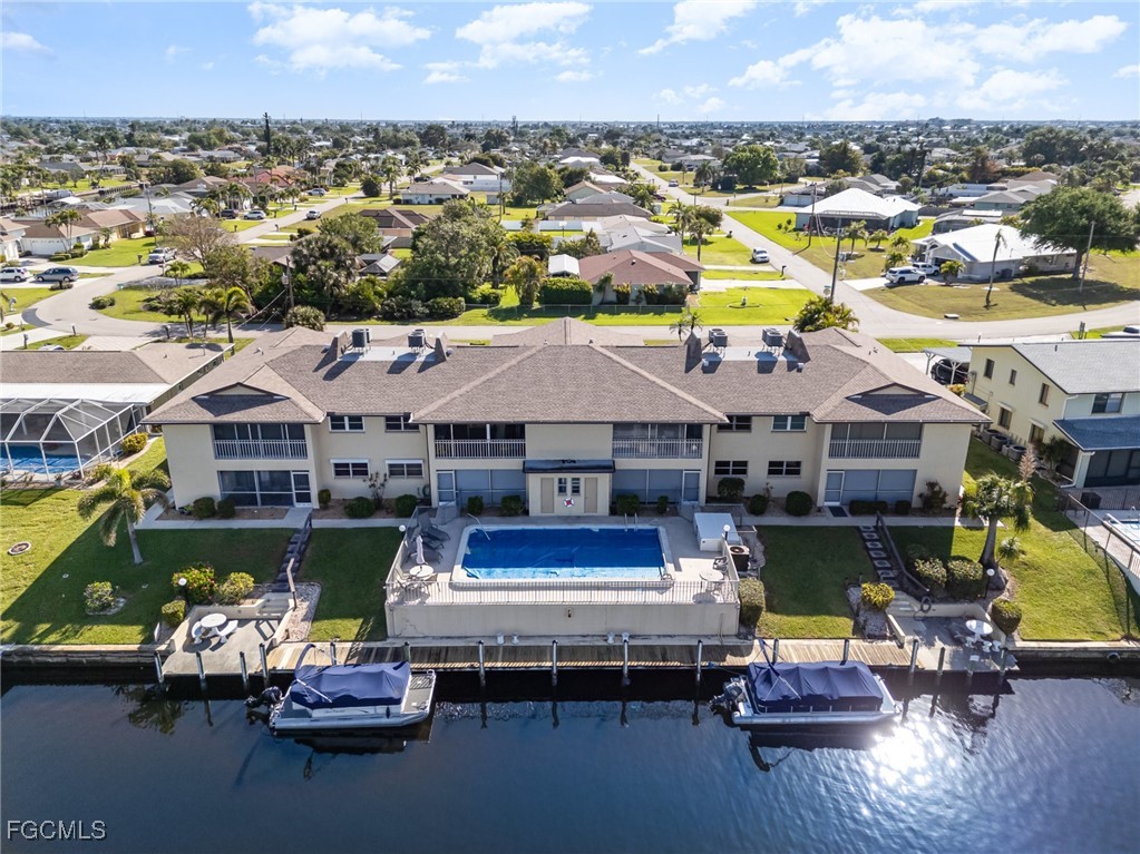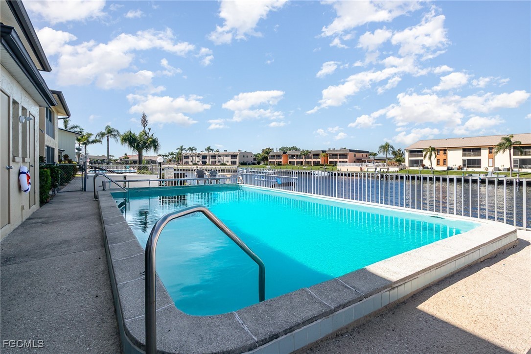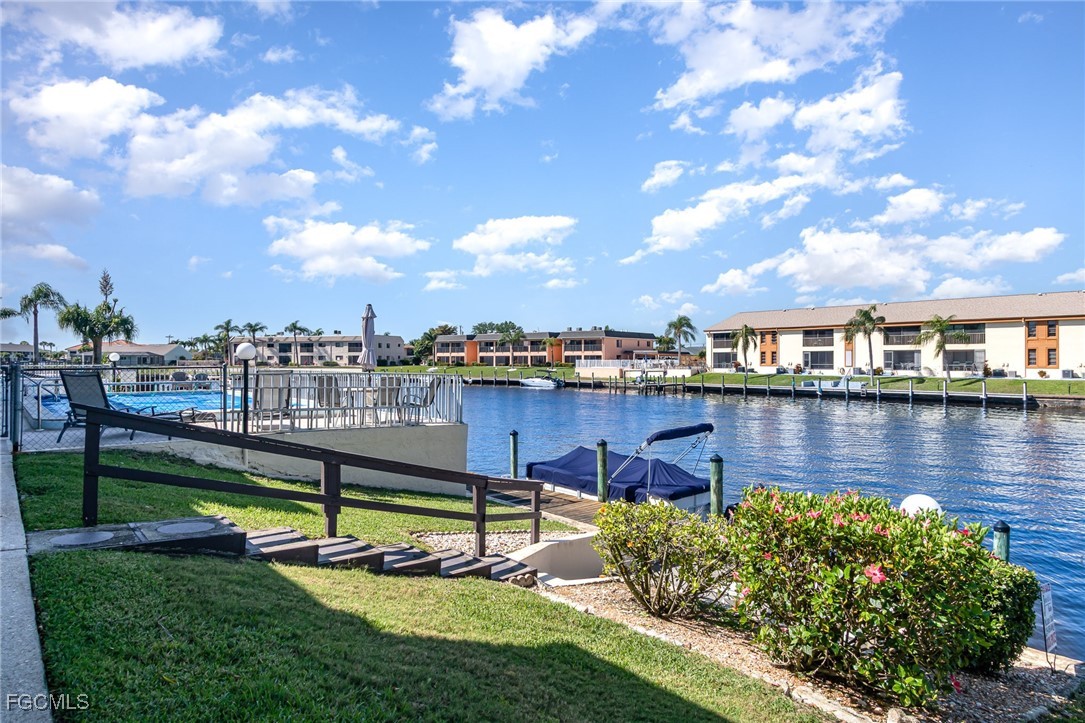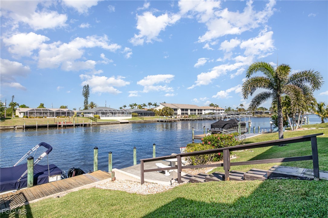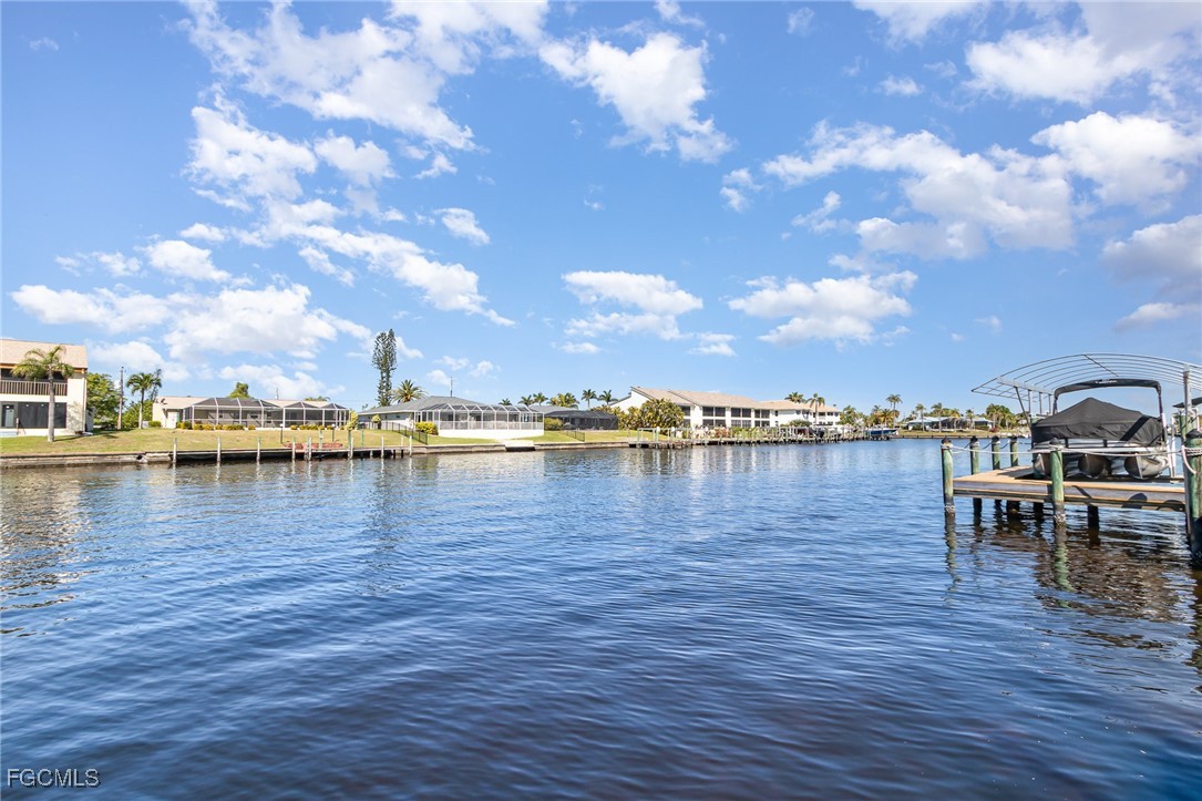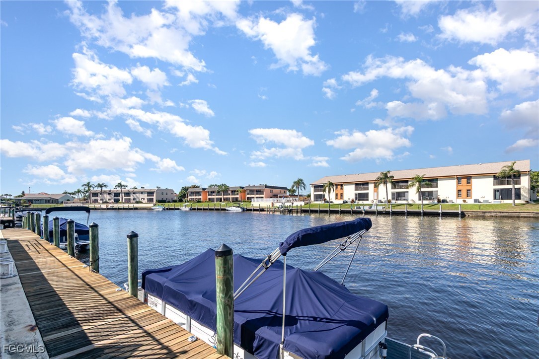 GULF ACCESS CONDO. Relax and savor your day with breathtaking water views that overlook the 200’ wide Rubicon Canal. This spacious 1,486SF Gulf Access condo features 2 Beds and 2 Baths, showcasing an open concept living area designed for comfort and style. Two balconies, front and rear, a large living room adorned with crown molding, a delightful dining area, and a galley kitchen equipped with white cabinets, solid surface counters, stainless steel appliances, and wood-look plank flooring create a harmonious atmosphere. The expansive owner’s suite presents captivating water views, complemented by a master bath featuring a walk-in shower and dual vanities that evoke a sense of luxury. The Guest bedroom enjoys its own private patio, while a full bathroom is conveniently shared with the living space. New roof in 2022, New AC in 2021, exterior windows are impact glass or have accordion hurricane shutters permanently installed, inside laundry, large walk-in closets in each bedroom. Nestled in a fantastic residential neighborhood, Driftwood is ideally located near downtown Cape Coral's vibrant dining and shopping scene, as well as both bridges to Fort Myers and the Beaches, yet remains a serene retreat for peace and quiet. The dock operates on a first-come, first-served basis, offering one bridge and a short ride to open water of the Caloosahatchee River. The well-maintained community boasts a waterfront heated pool, covered parking, an owner’s storage area, and lush, mature landscaping that enhances the natural beauty of the surroundings. This property is being sold Turnkey, embodying the essence of Florida living at its very best.