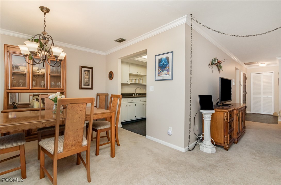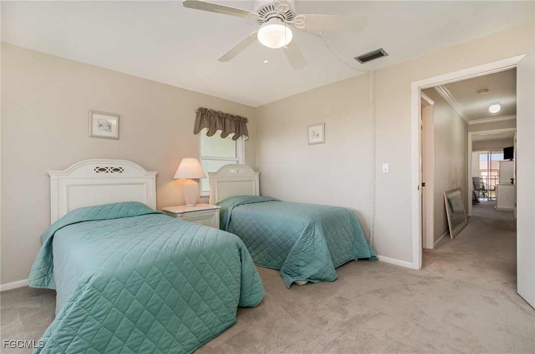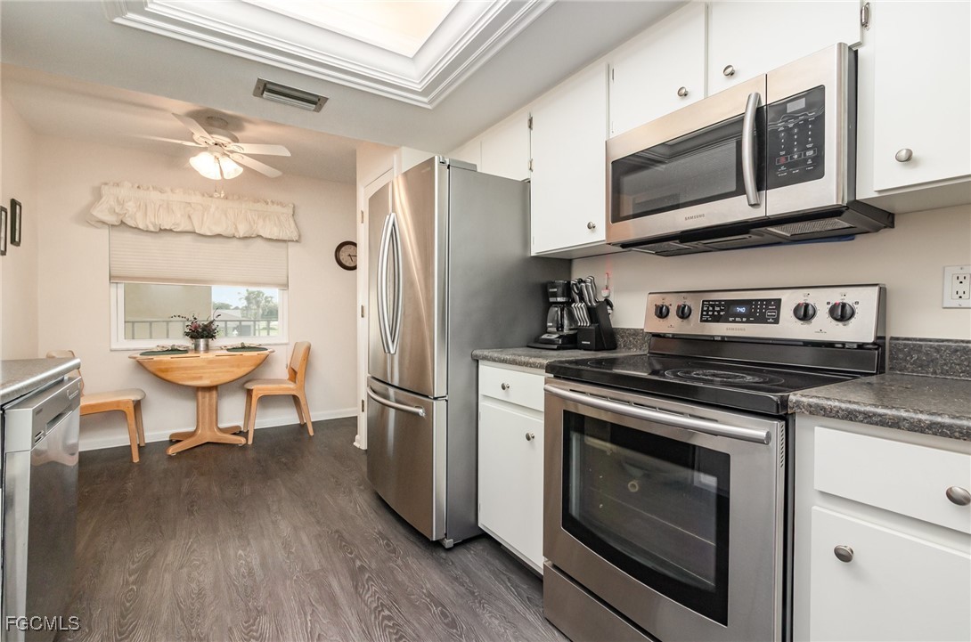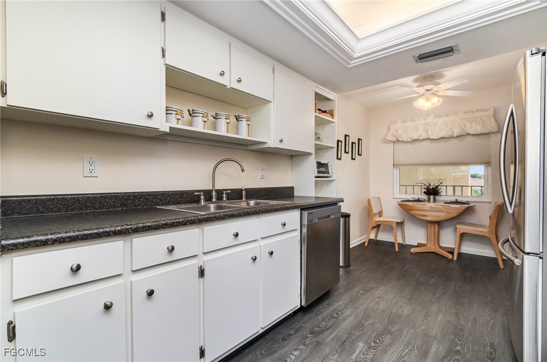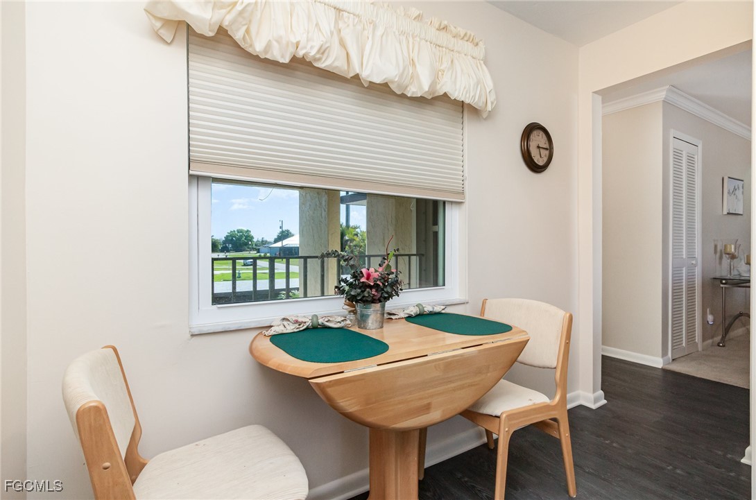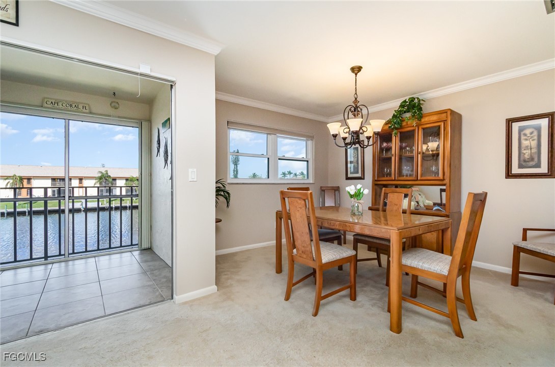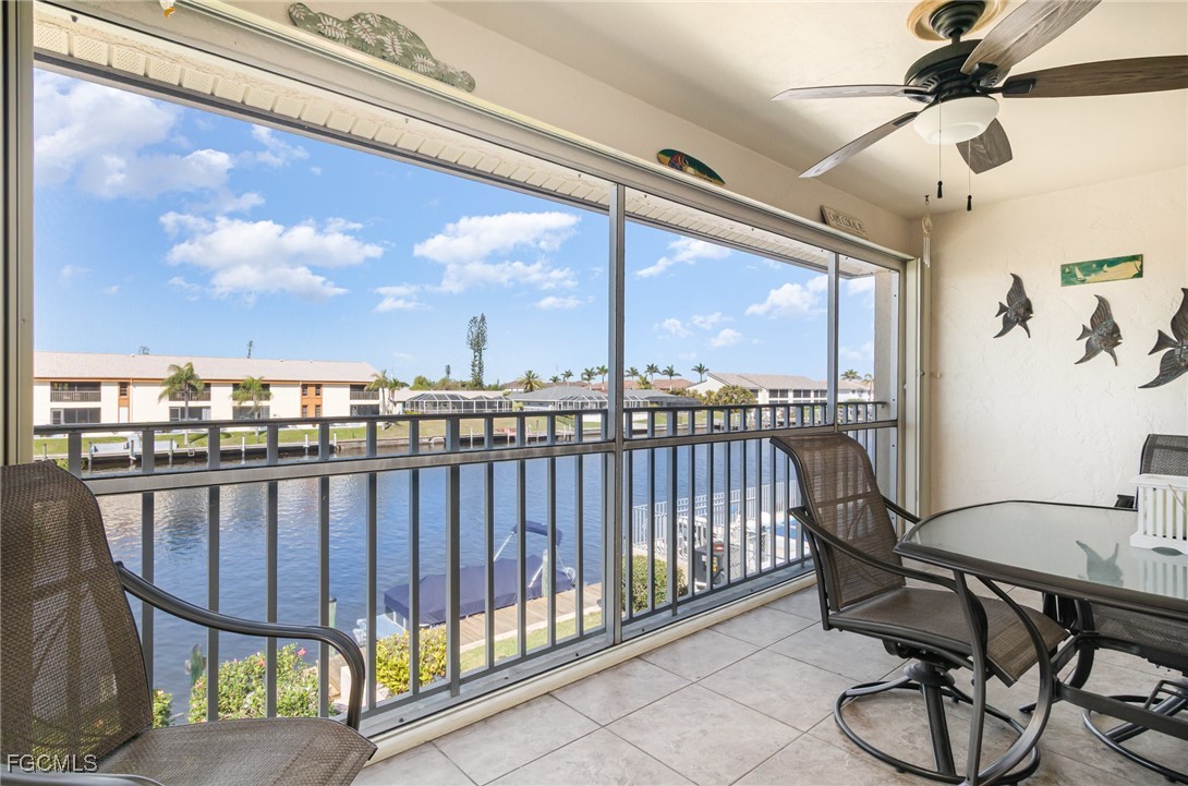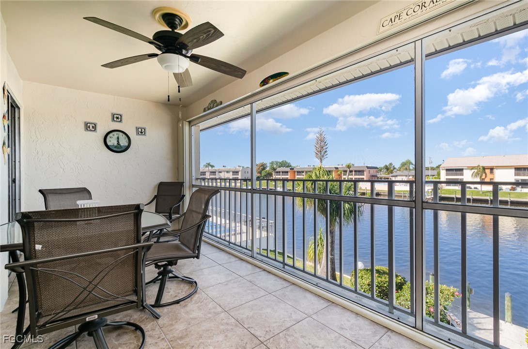 GULF ACCESS CONDO. Relax and savor your day with breathtaking water views that overlook the 200’ wide Rubicon Canal. This spacious 1,486SF Gulf Access condo features 2 Beds and 2 Baths, showcasing an open concept living area designed for comfort and style. Two balconies, front and rear, a large living room adorned with crown molding, a delightful dining area, and a galley kitchen equipped with white cabinets, solid surface counters, stainless steel appliances, and wood-look plank flooring create a harmonious atmosphere. The expansive owner’s suite presents captivating water views, complemented by a master bath featuring a walk-in shower and dual vanities that evoke a sense of luxury. The Guest bedroom enjoys its own private patio, while a full bathroom is conveniently shared with the living space. New roof in 2022, New AC in 2021, exterior windows are impact glass or have accordion hurricane shutters permanently installed, inside laundry, large walk-in closets in each bedroom. Nestled in a fantastic residential neighborhood, Driftwood is ideally located near downtown Cape Coral's vibrant dining and shopping scene, as well as both bridges to Fort Myers and the Beaches, yet remains a serene retreat for peace and quiet. The dock operates on a first-come, first-served basis, offering one bridge and a short ride to open water of the Caloosahatchee River. The well-maintained community boasts a waterfront heated pool, covered parking, an owner’s storage area, and lush, mature landscaping that enhances the natural beauty of the surroundings. This property is being sold Turnkey, embodying the essence of Florida living at its very best.