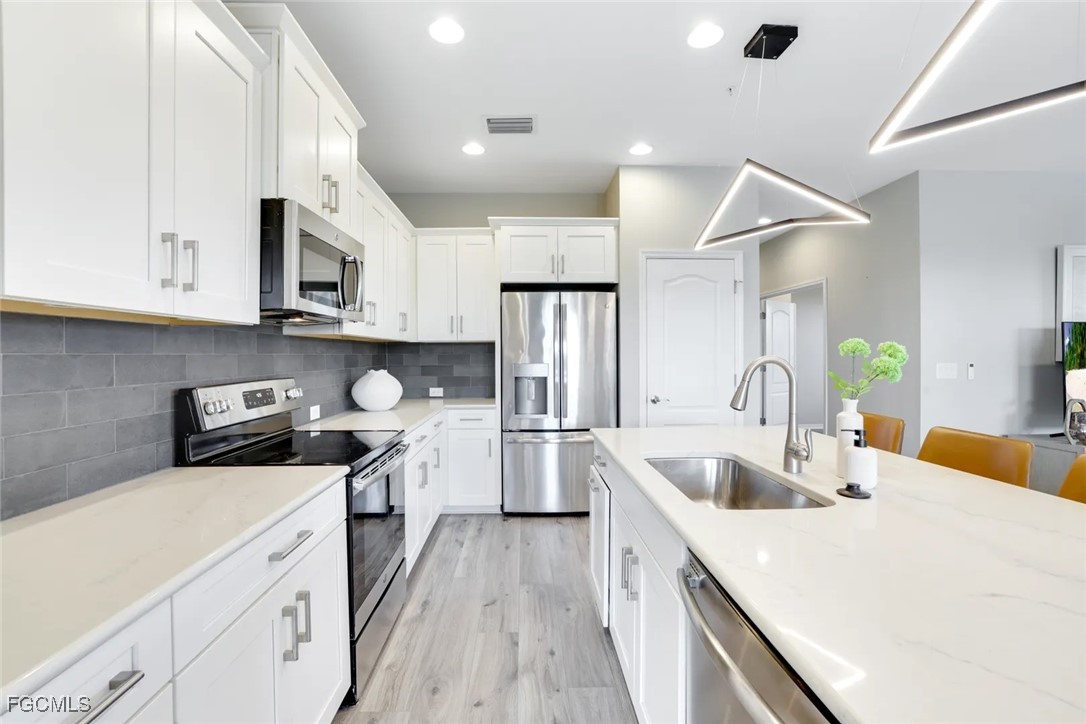 This stunning end-unit condo, with southern exposure and a lake view, has major upgrades! Featuring newer impact windows, full furnishings, new flooring, custom lighting, electric blinds, and a ship-lap accent wall. The immaculate 2-bedroom plus den layout offers flexibility, with the den easily doubling as a third bedroom. The open floor plan highlights a large quartz kitchen island, an eat-in kitchen, and two sliding impact glass doors that fill the space with natural light. The condo has been freshly painted and boasts stainless steel appliances, a new kitchen backsplash, a spacious walk-in closet in the primary bedroom, and a generous lanai with views of the lake and pool. Richmond Park is a gated community that allows pets and offers easy living with amenities such as a community pool and spa. Nearby shops at Logan Landing, Starbucks, Seed to Table, and a variety of local restaurants and services. All furnishings are included. Just pack your suitcase and move right in!