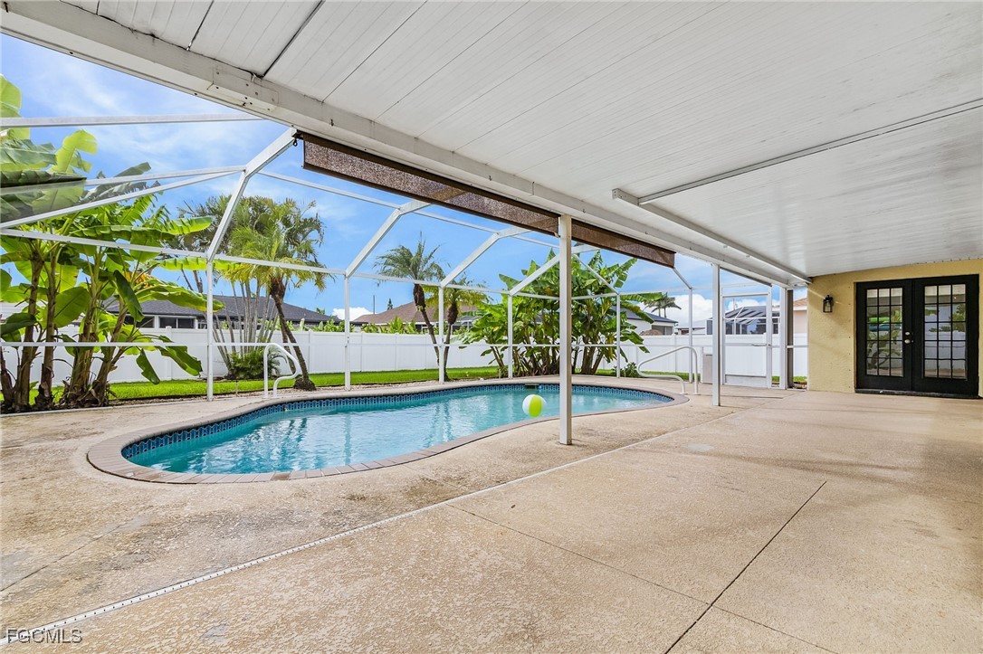 French doors from both the living room and primary bedroom open to a private backyard retreat with a screened-in pool and lanai, lush grass, banana trees for privacy, and a fully fenced yard. All pool equipment stays.